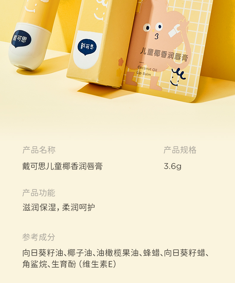 【29.9元带走3支!!】【秋田满满 秒杀推荐】戴可思椰香唇膏3.6g 润护小干唇 全绿配方不怕舔 3岁+