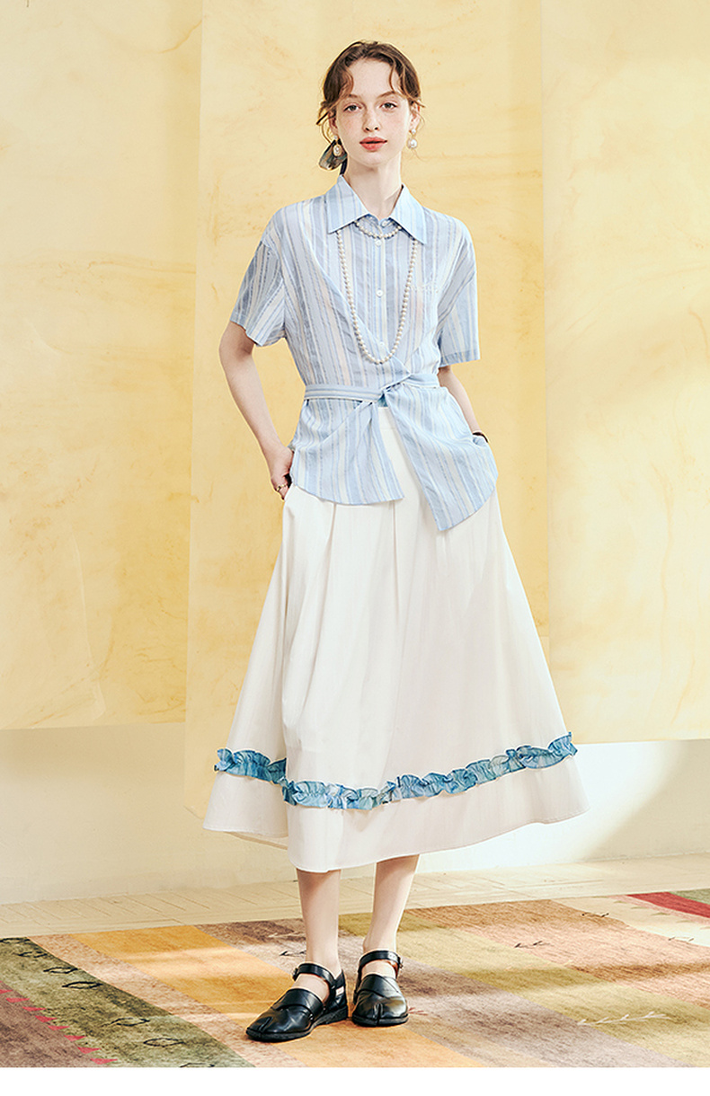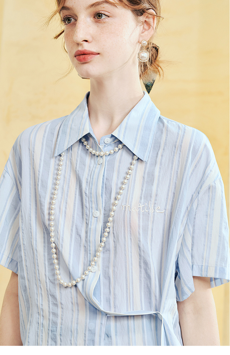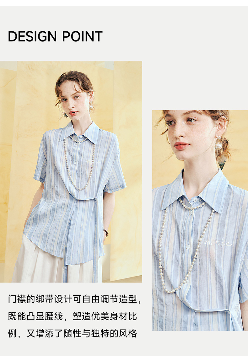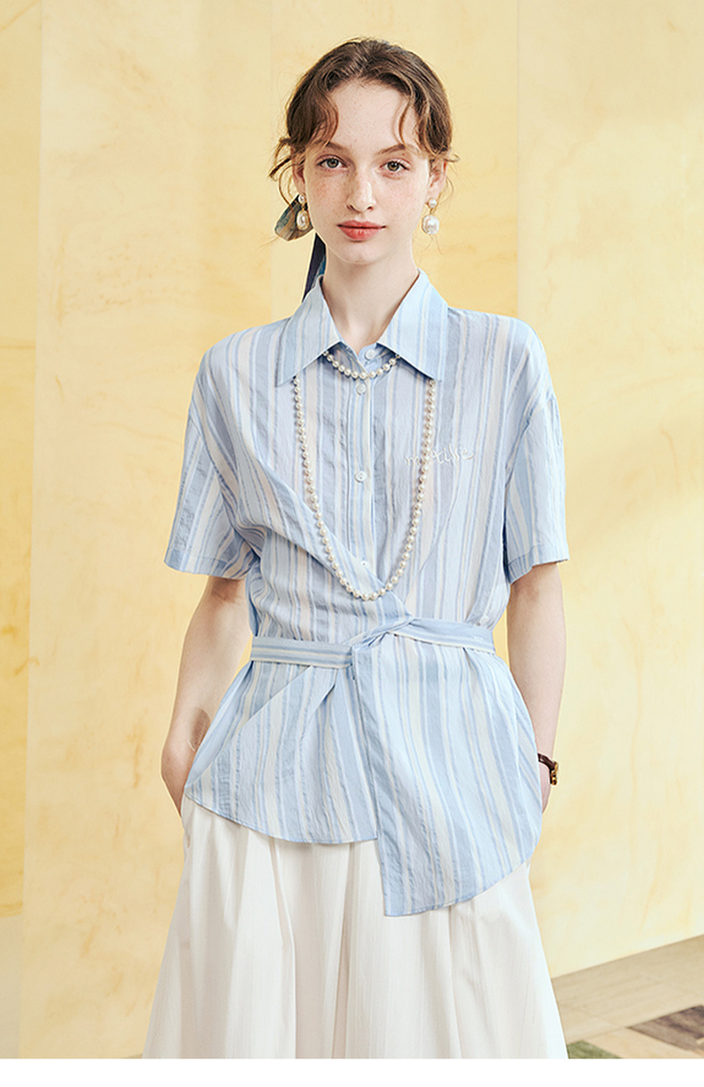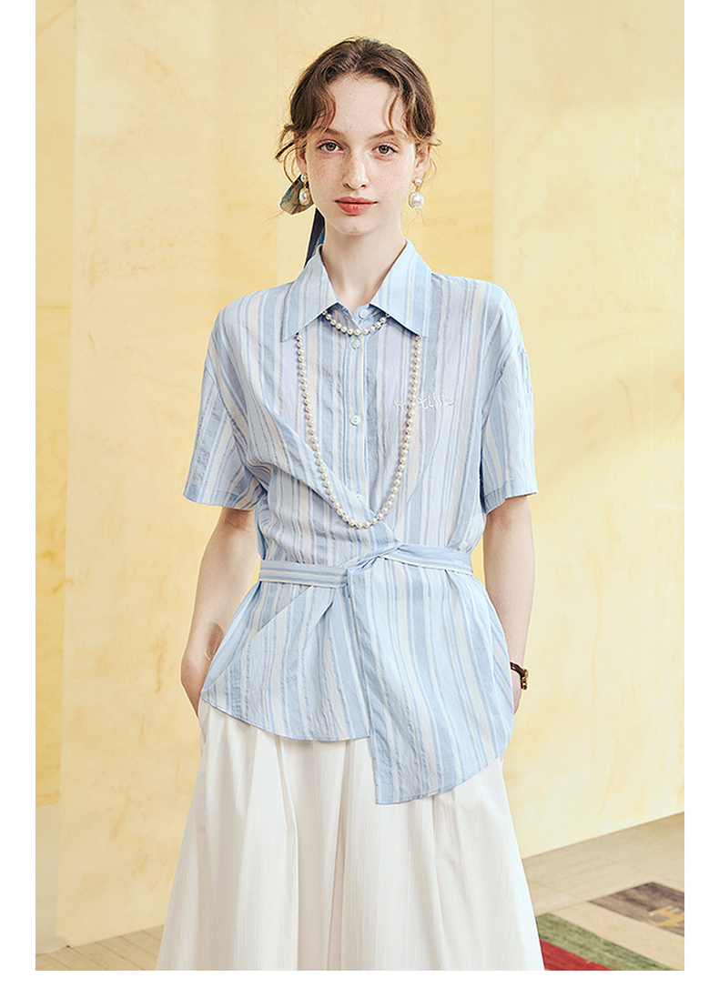 两三事 褶间呼吸 2025夏季新款简约字母刺绣条纹绑带衬衫女