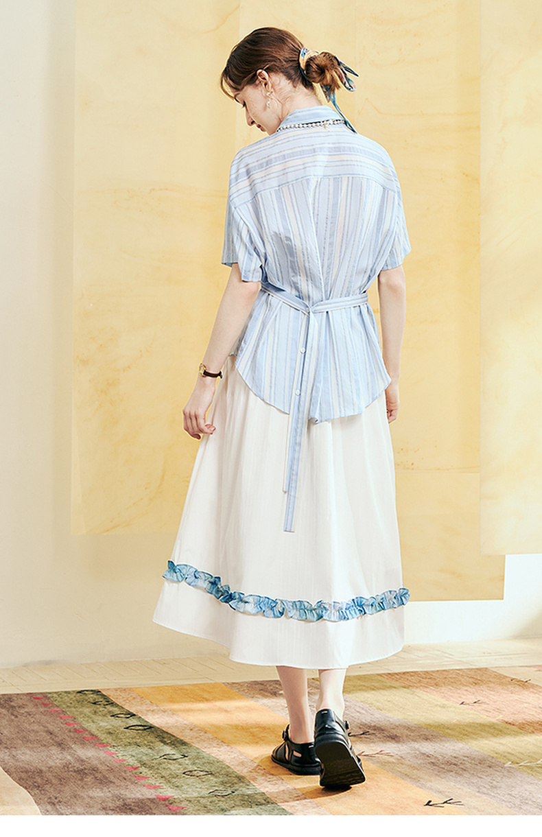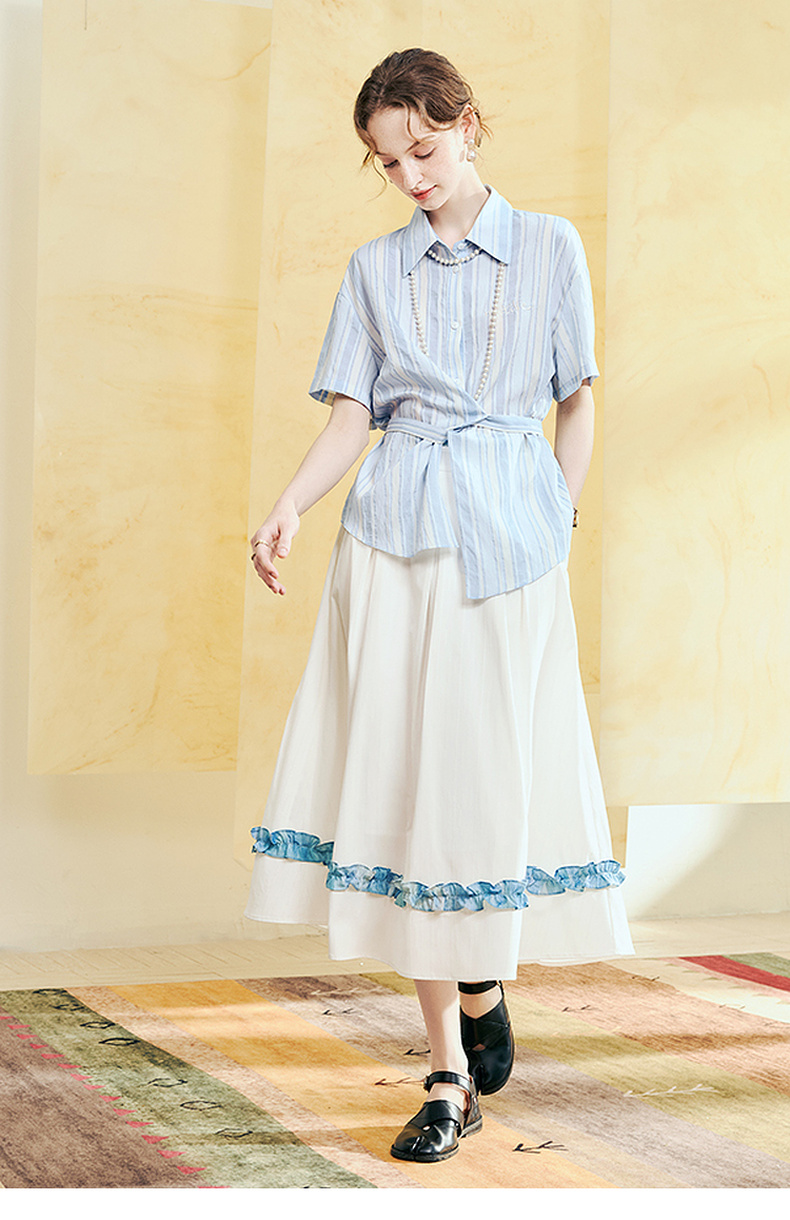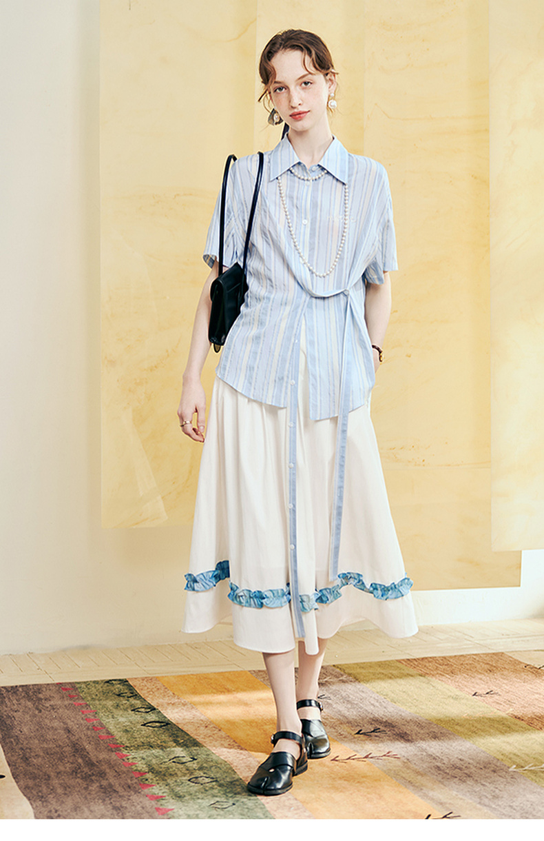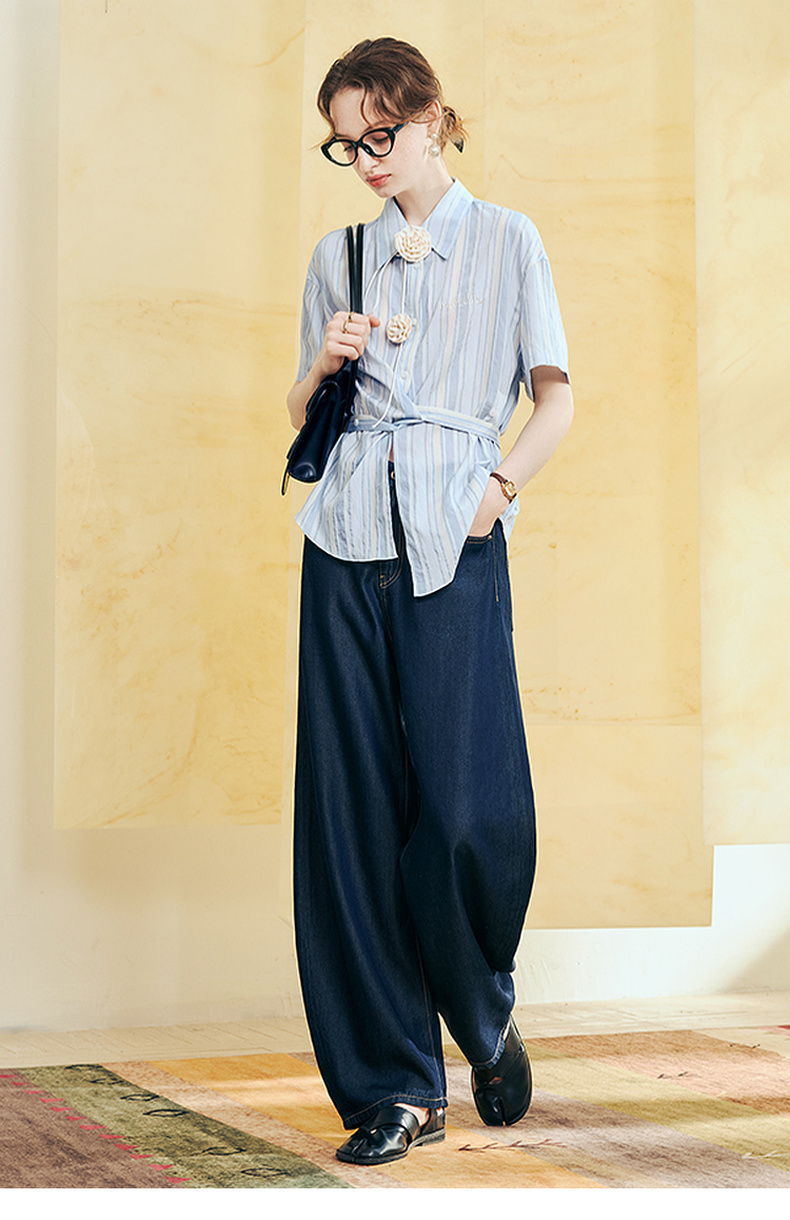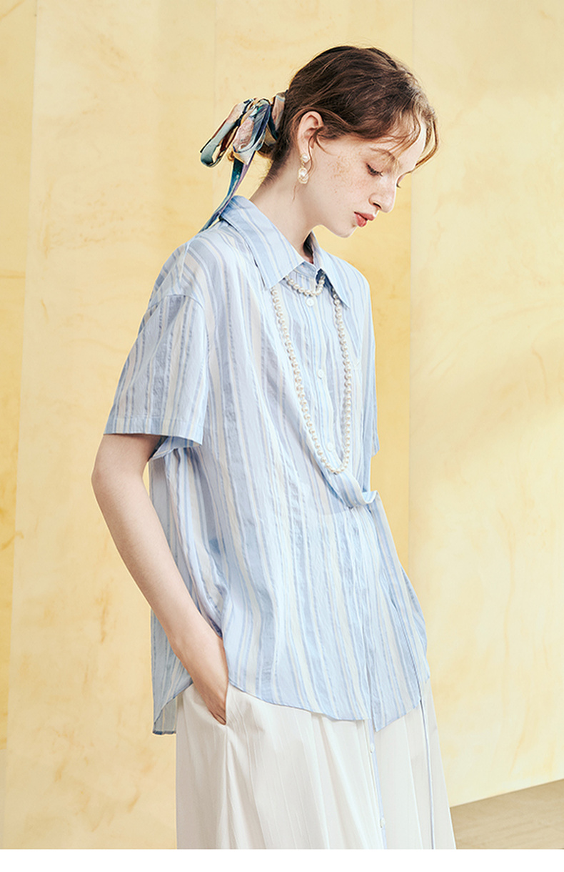 两三事 褶间呼吸 2025夏季新款简约字母刺绣条纹绑带衬衫女