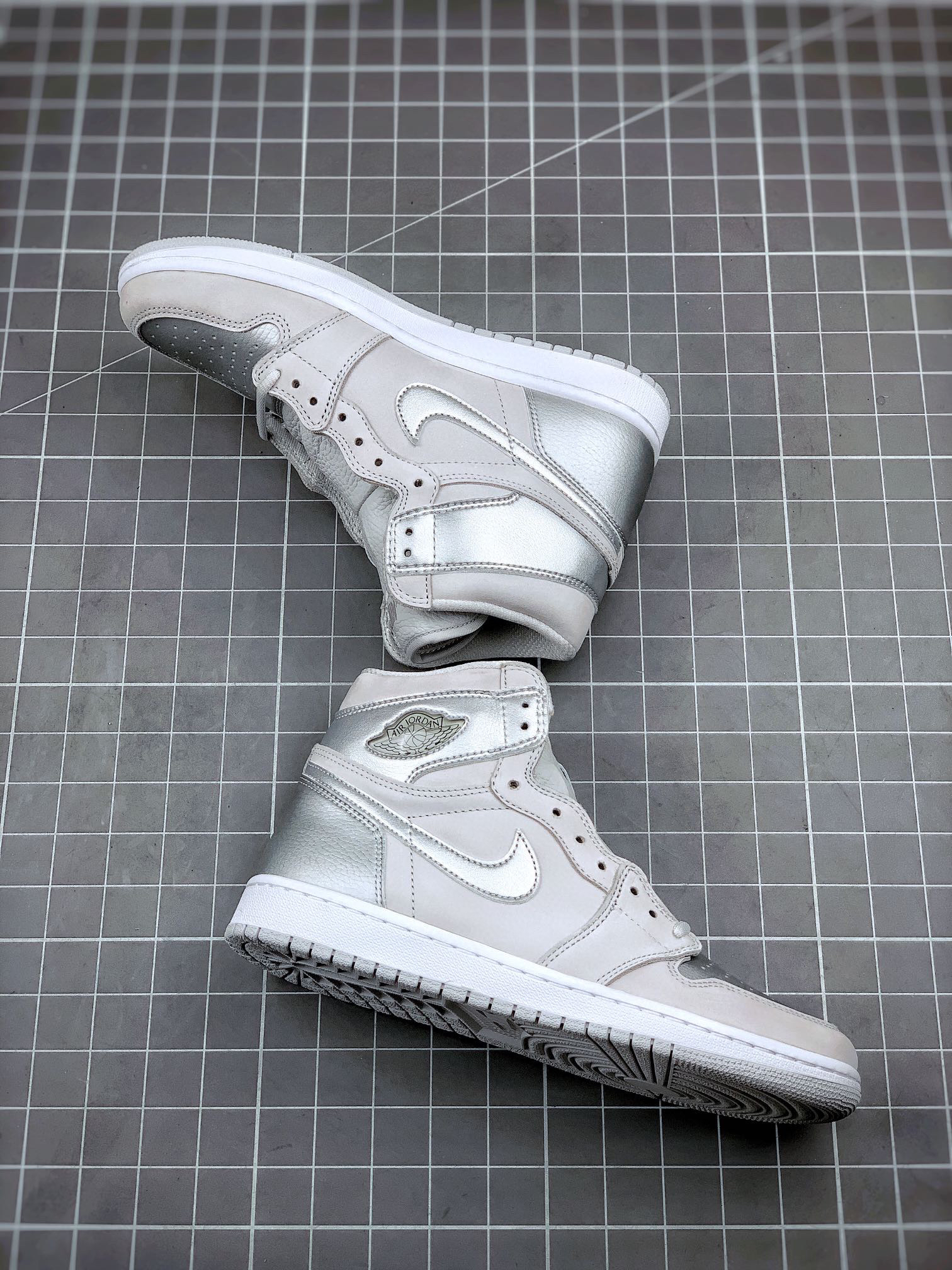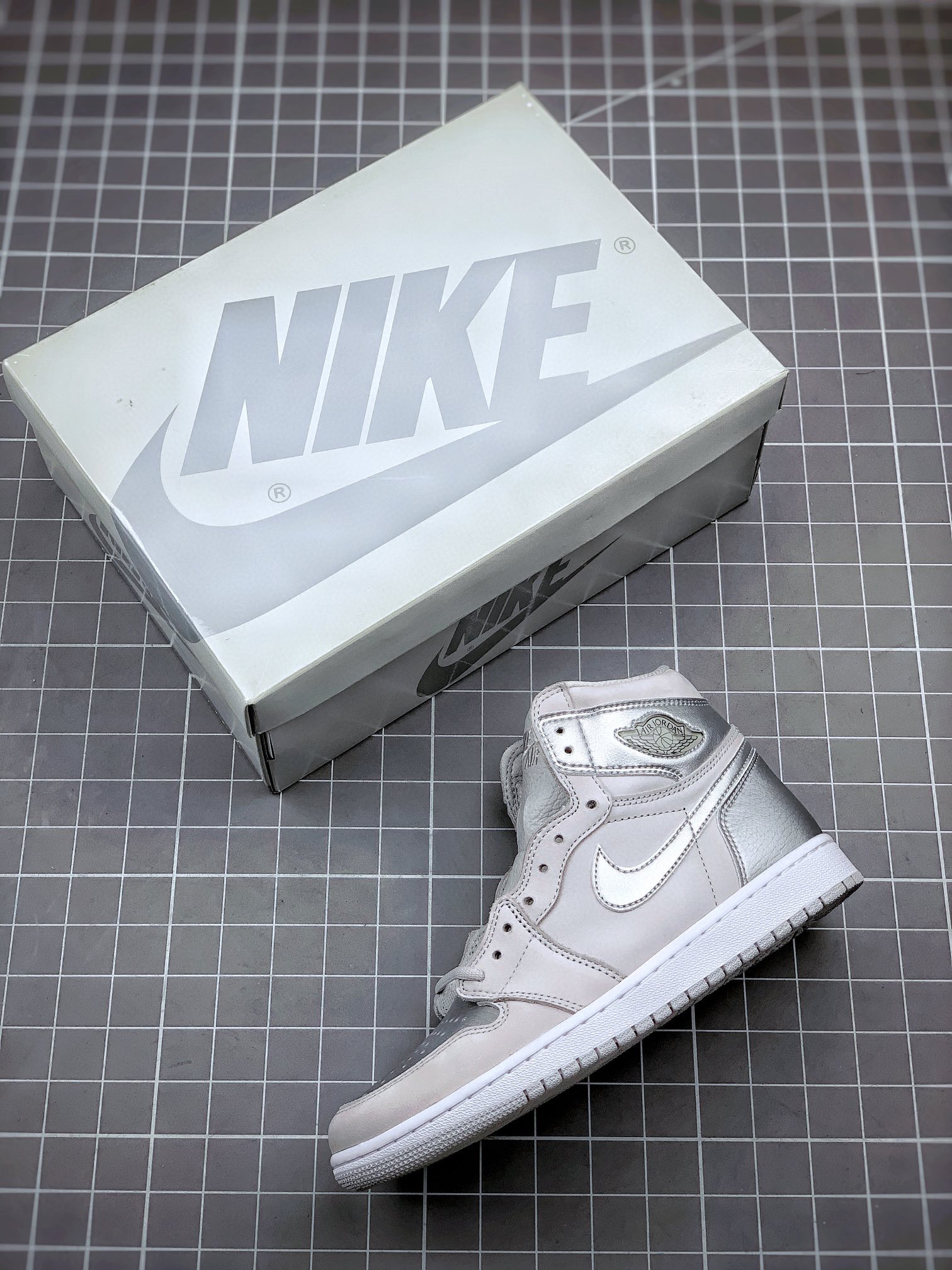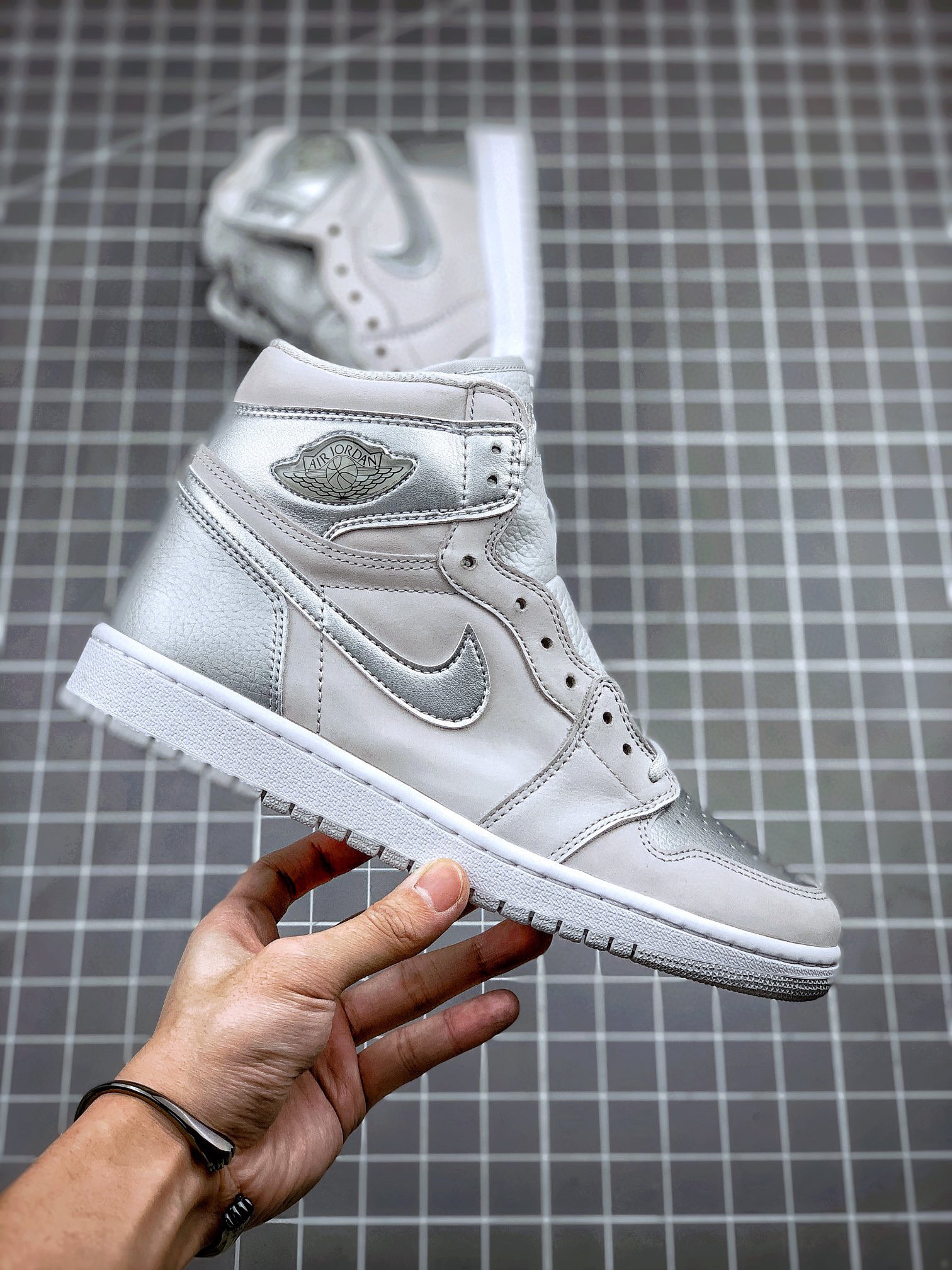 鞋身采用银色荔枝皮搭配浅灰色磨砂皮革呈现 质感出众的贵金属质感与哑光物料的醒目反差,视觉层次相当出色、更特别的地方在于,鞋舌背面特别设计有 2001 to 2020 字样,鞋垫则印有 CO.JP 专属文字!