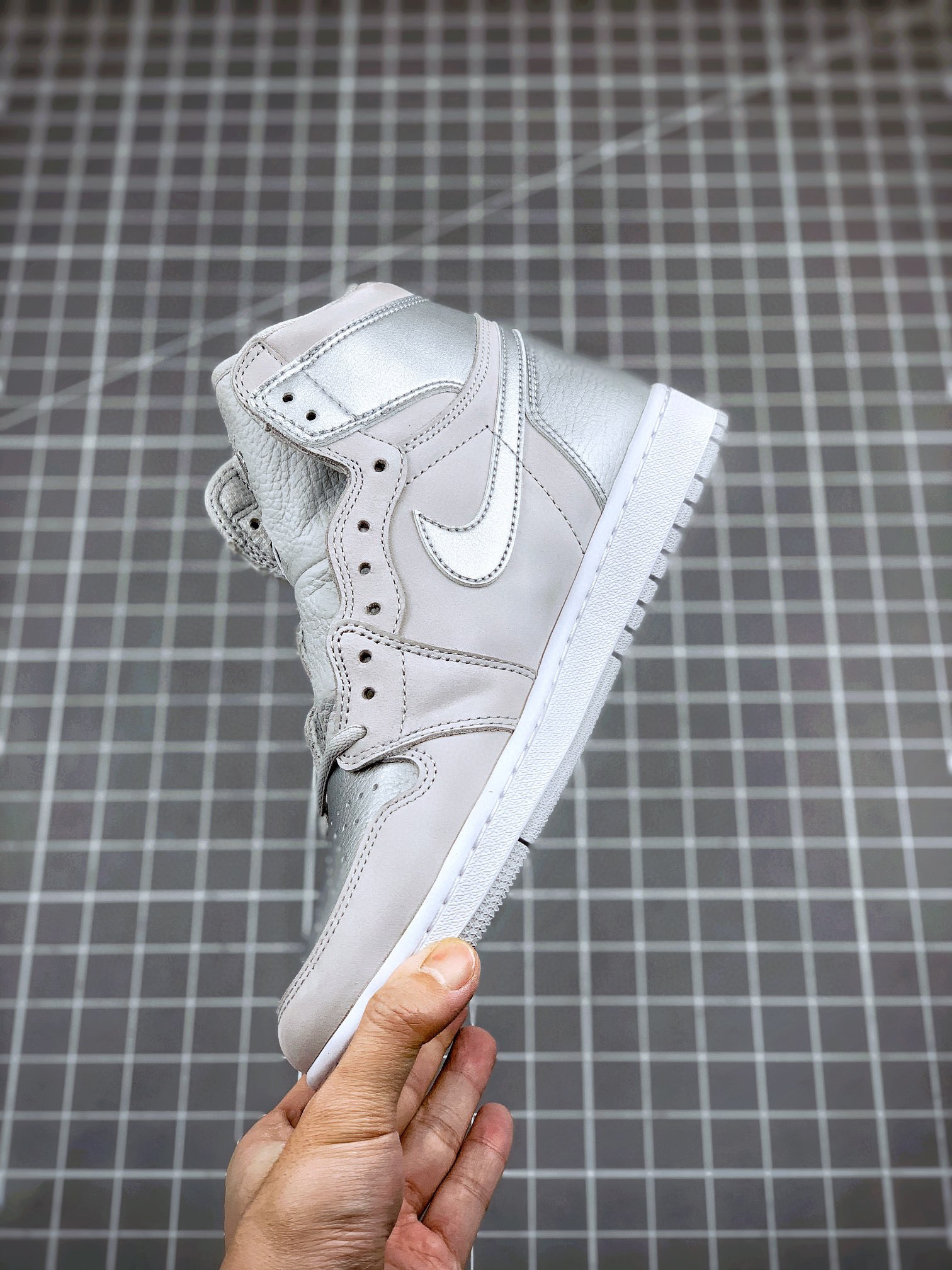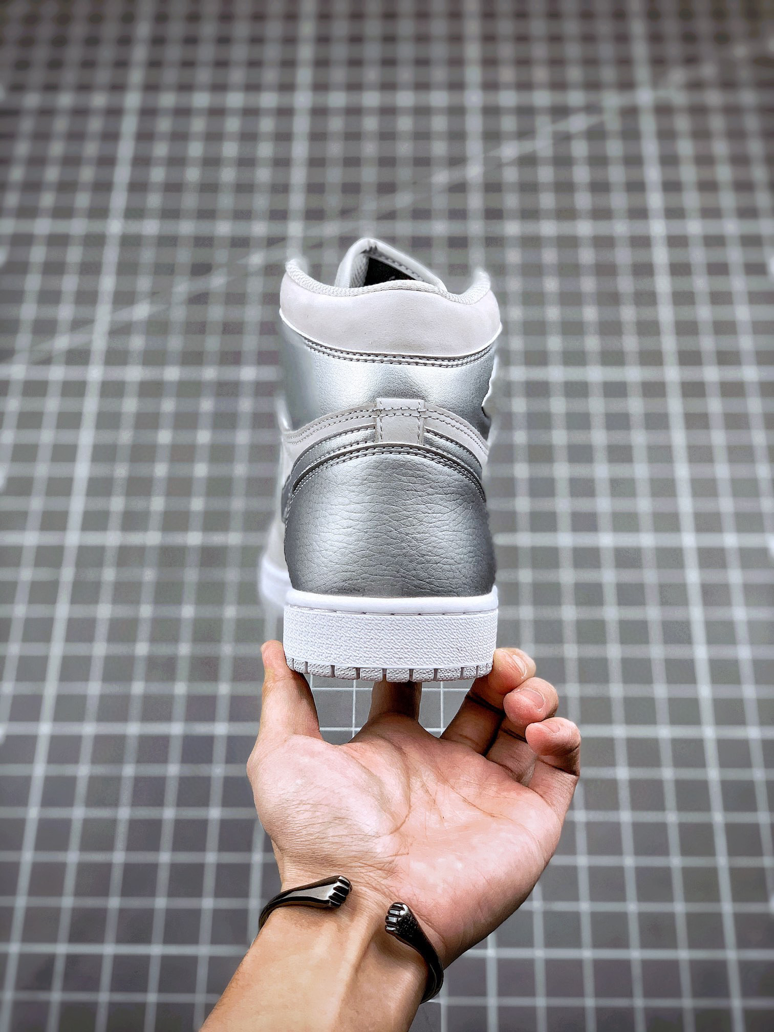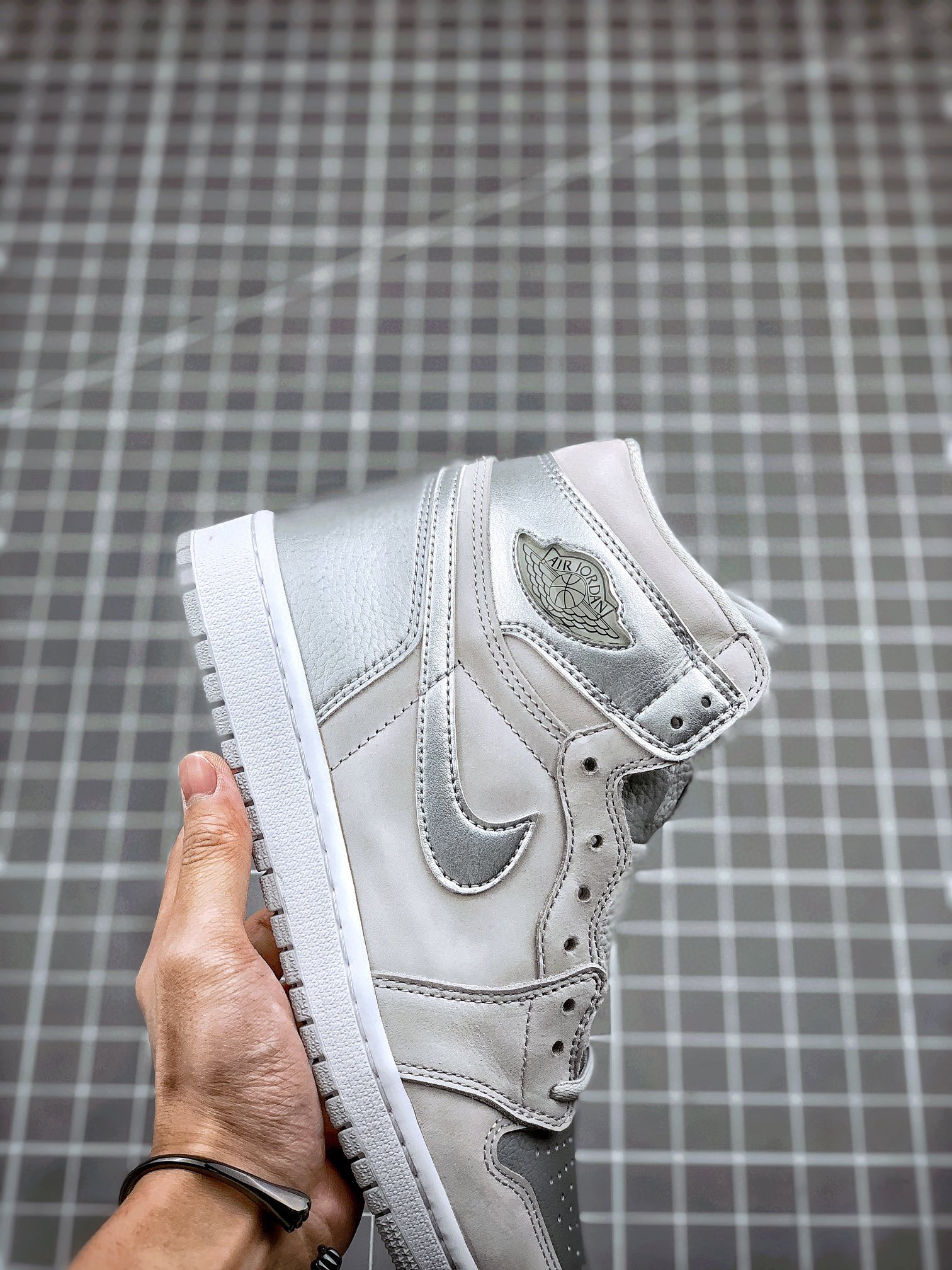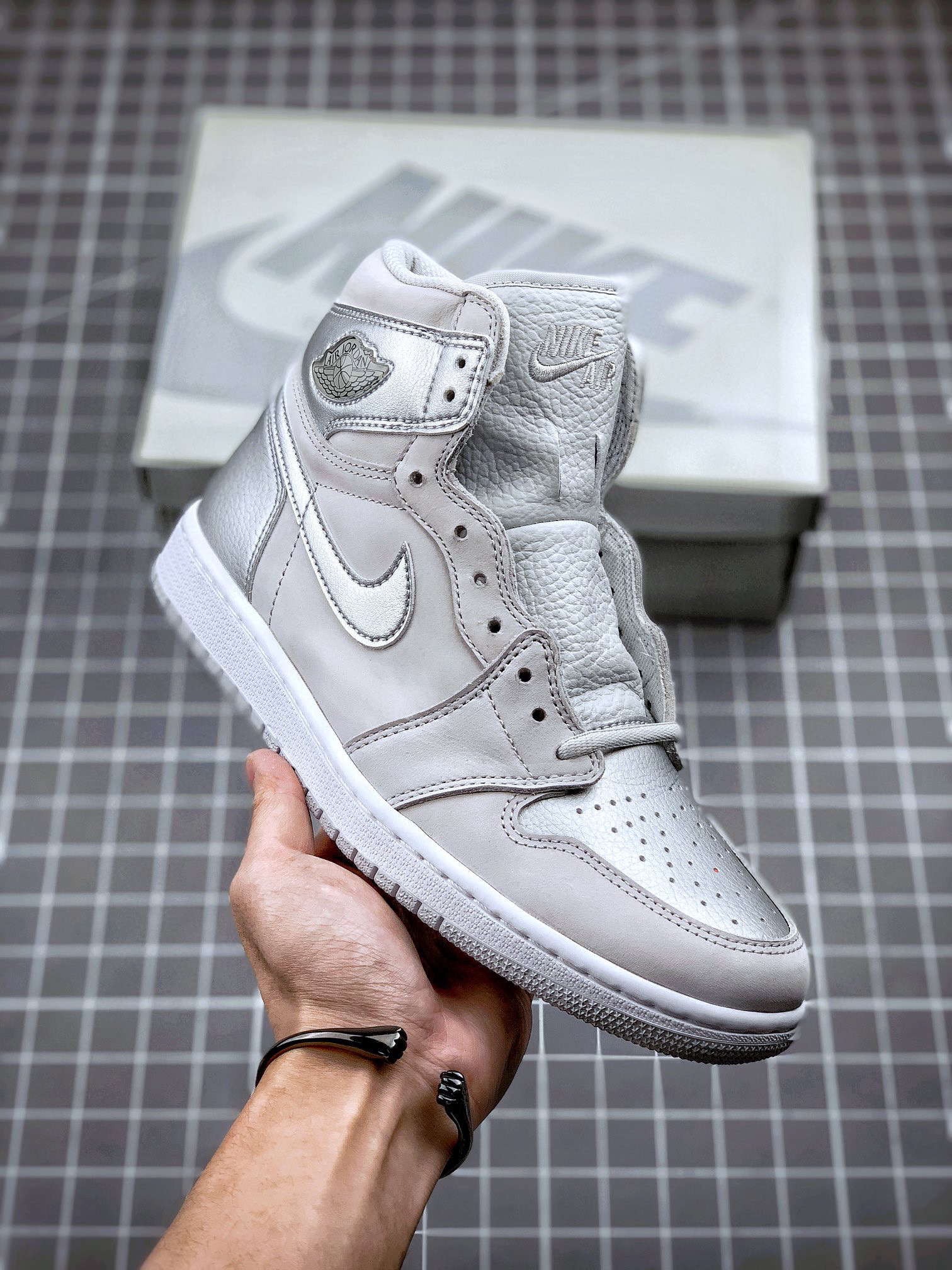 鞋身采用银色荔枝皮搭配浅灰色磨砂皮革呈现 质感出众的贵金属质感与哑光物料的醒目反差,视觉层次相当出色、更特别的地方在于,鞋舌背面特别设计有 2001 to 2020 字样,鞋垫则印有 CO.JP 专属文字!