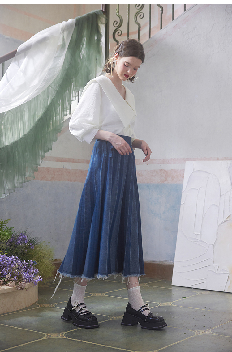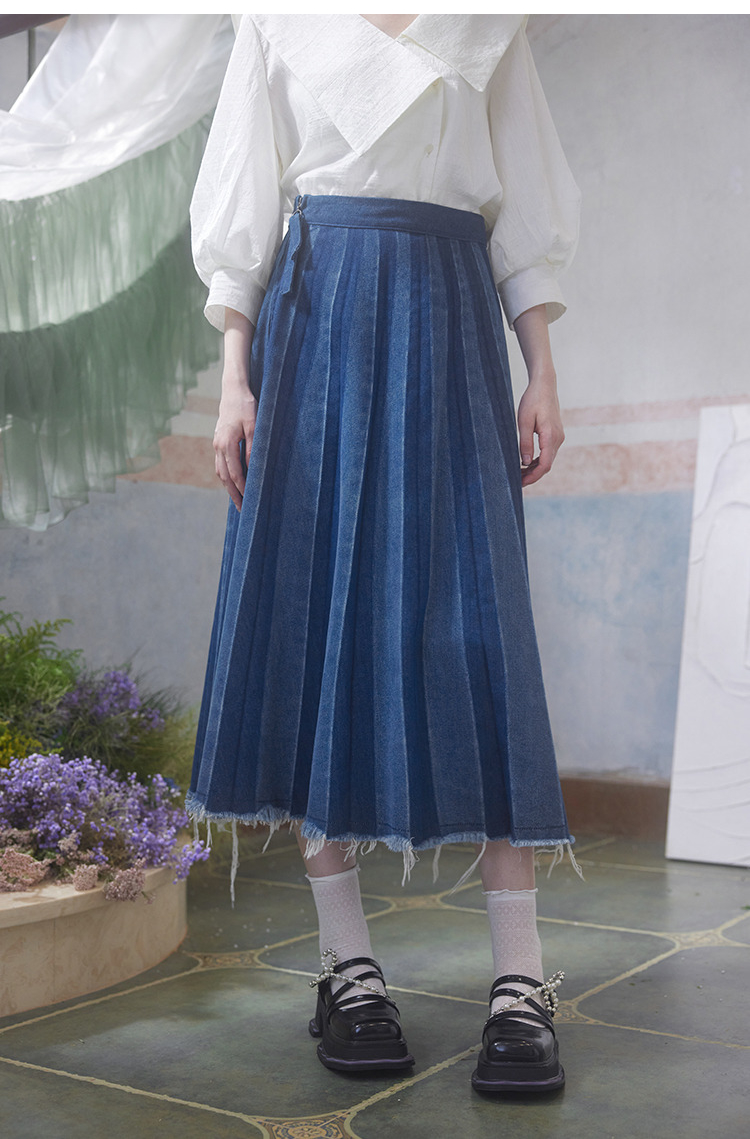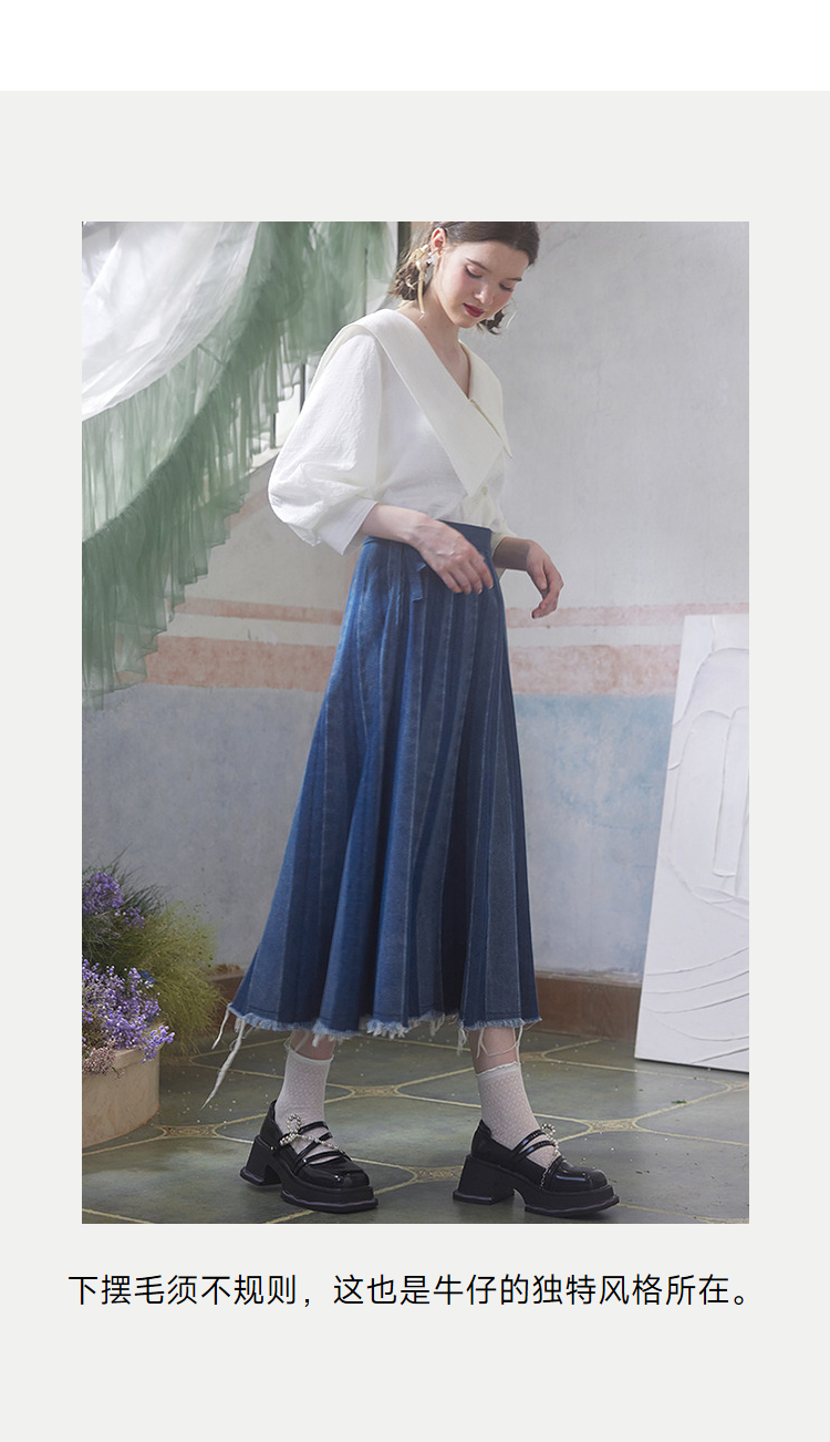 两三事 一路相随 夏季时尚拼色百褶裙洗水牛仔半身裙