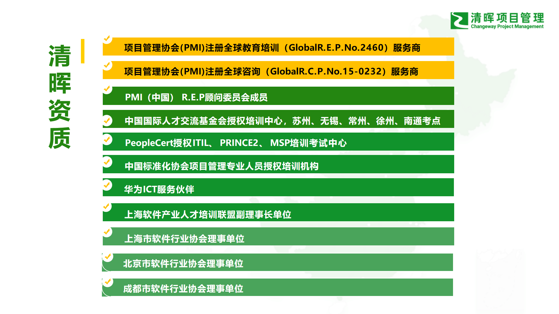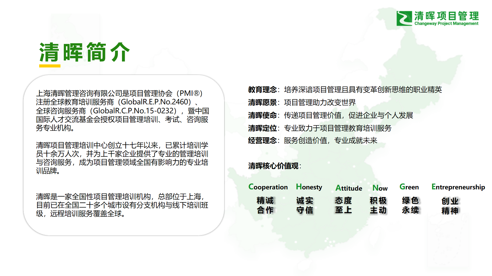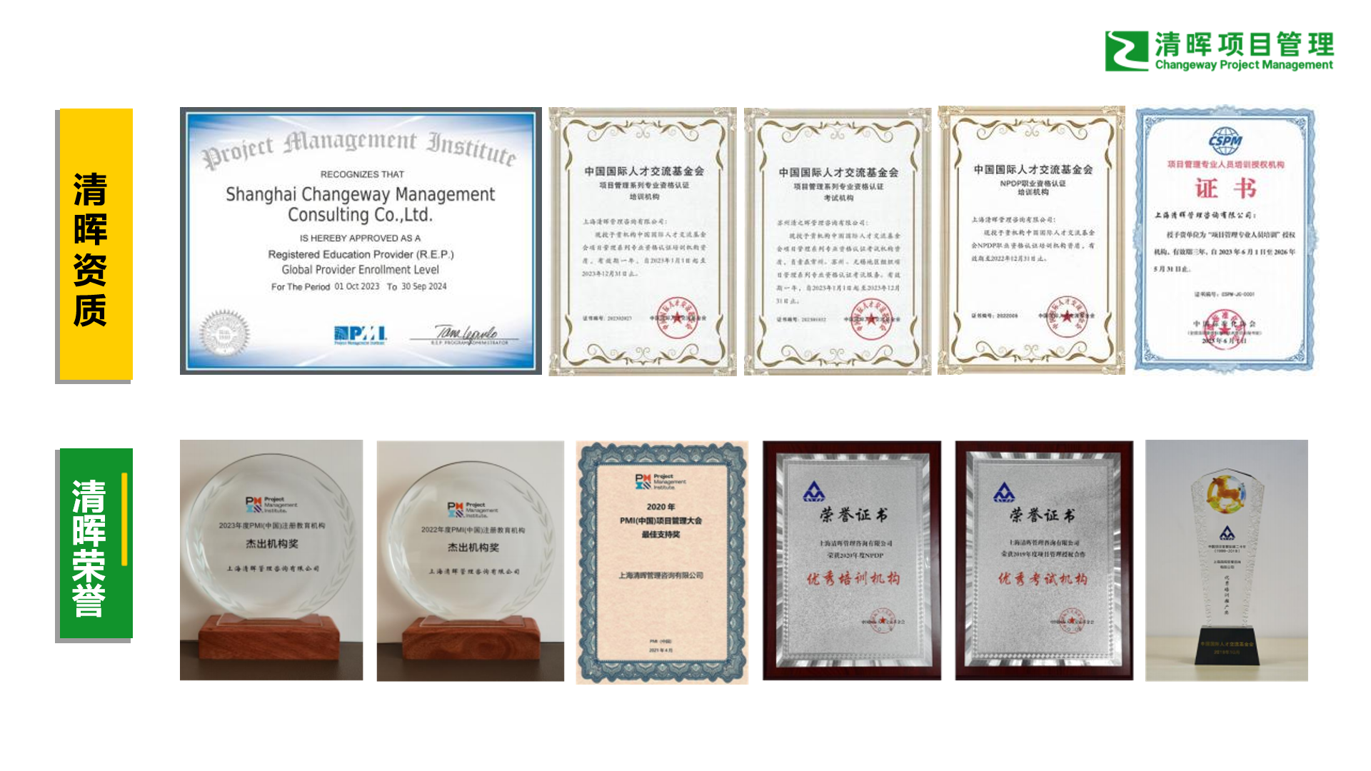 上海清晖管理咨询有限公司是项目管理协会(PMI®)注册全球教育培训服务商(Global R.E.P. No.2460)、全球咨询服务商(Global R.C.P. No.15-0232),暨中国国际人才交流基金会授权项目管理培训、考试、咨询服务专业机构。