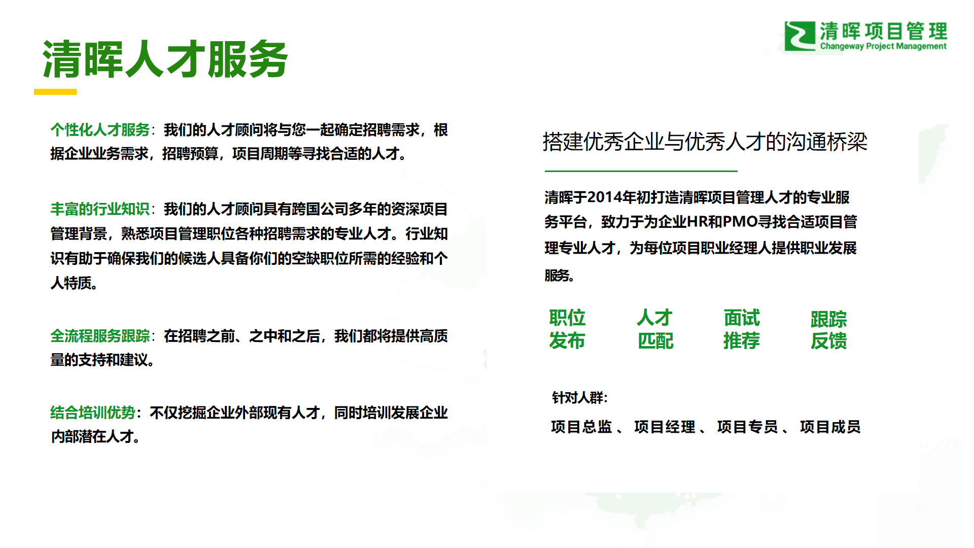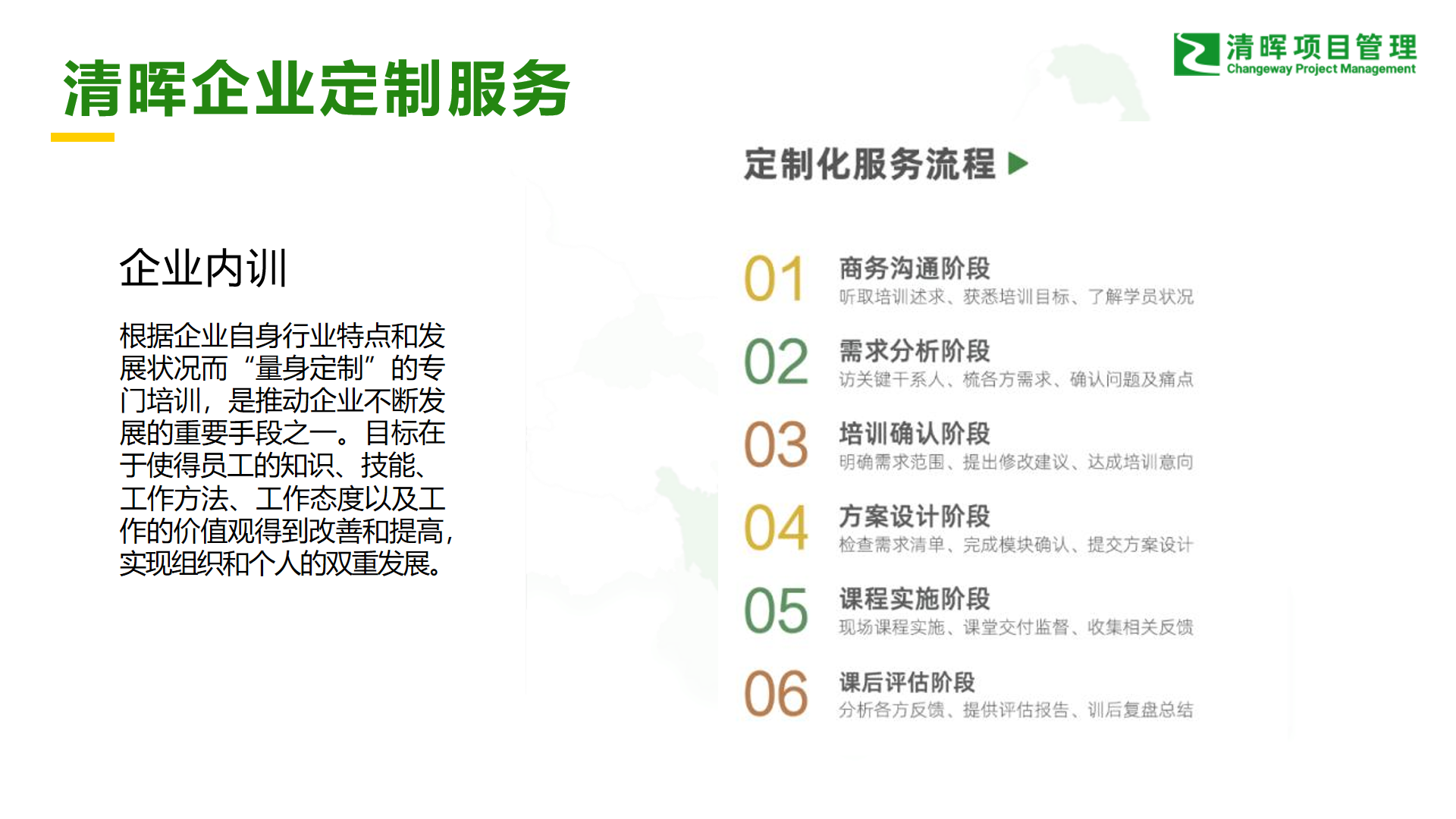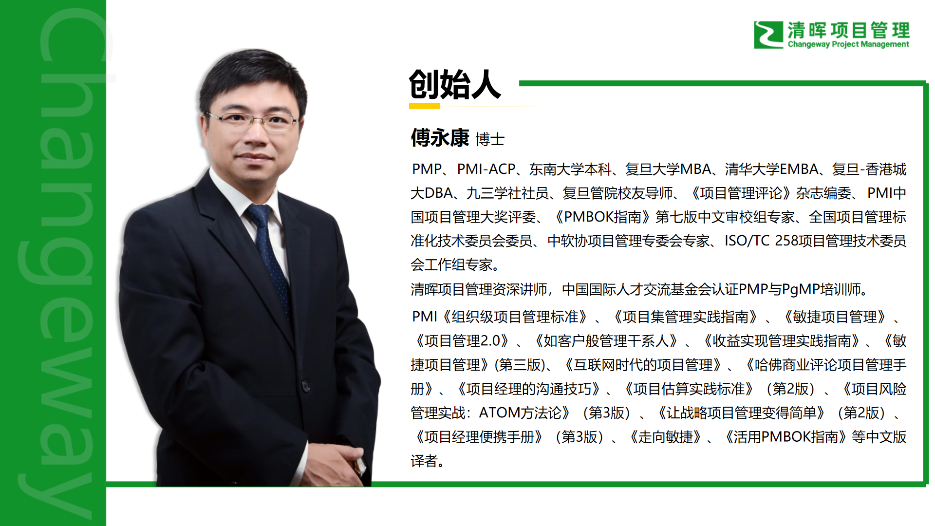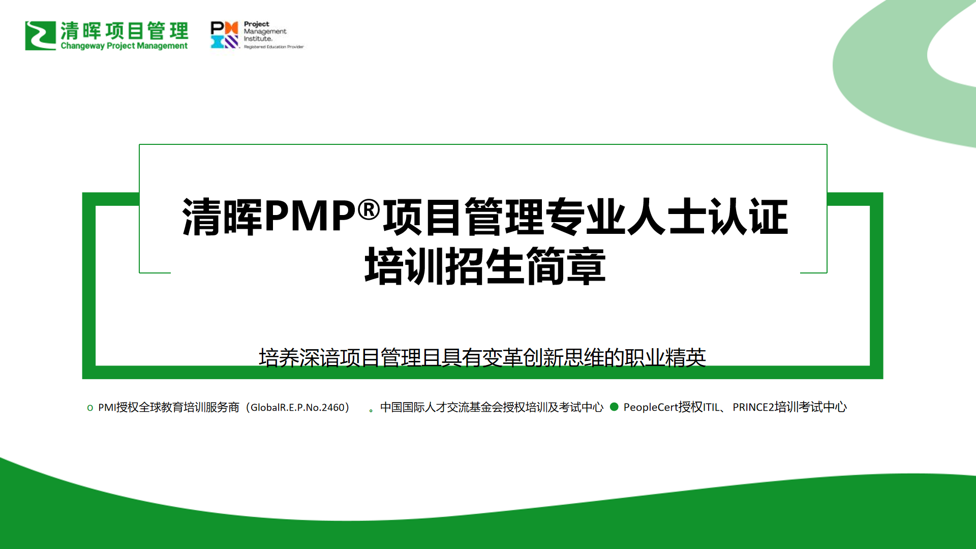 上海清晖管理咨询有限公司是项目管理协会(PMI®)注册全球教育培训服务商(Global R.E.P. No.2460)、全球咨询服务商(Global R.C.P. No.15-0232),暨中国国际人才交流基金会授权项目管理培训、考试、咨询服务专业机构。