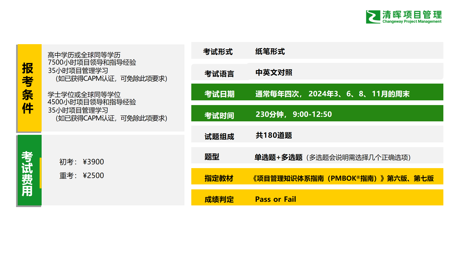 报考条件: 学历+项目管理经验+项目培训课时(35PDU)
