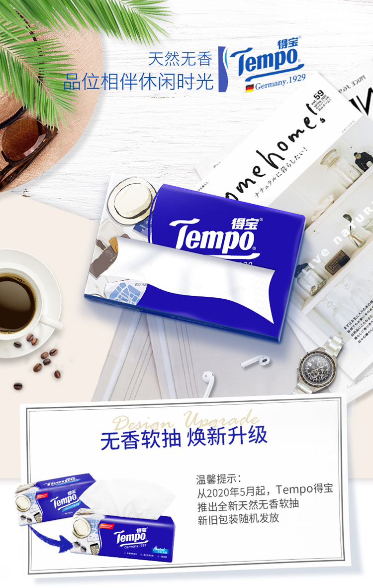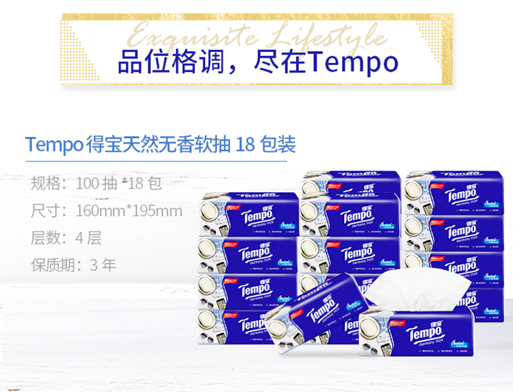 得宝(TEMPO) 抽纸 M码 无香4层100抽*18包 新旧包装混发 纸巾卫生纸