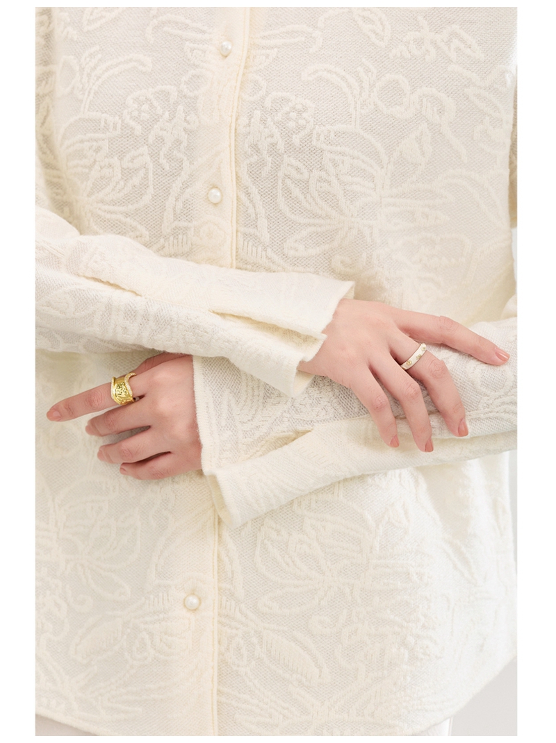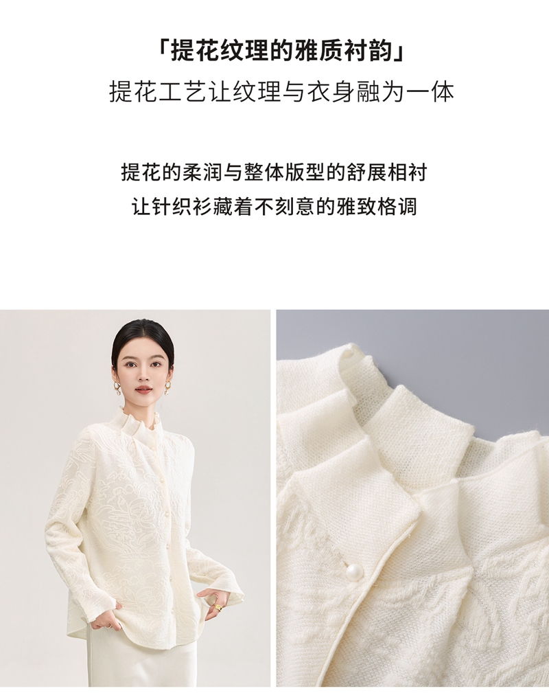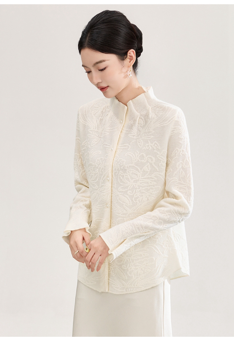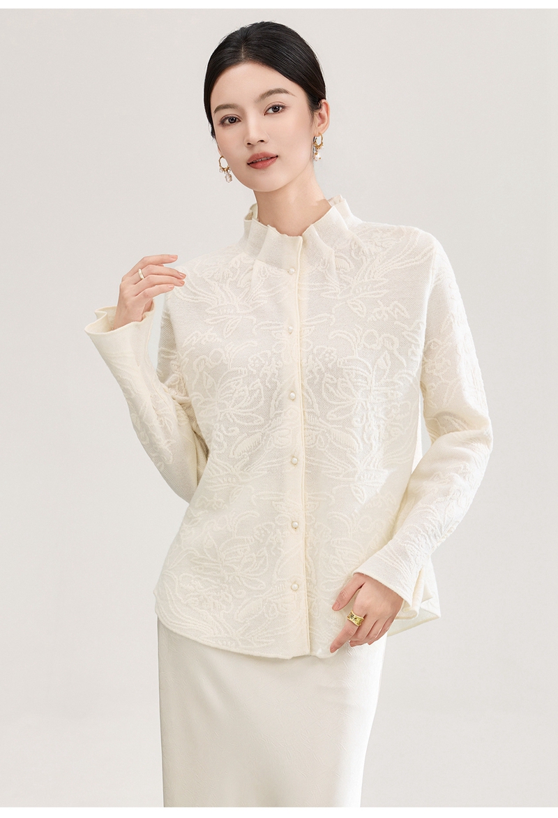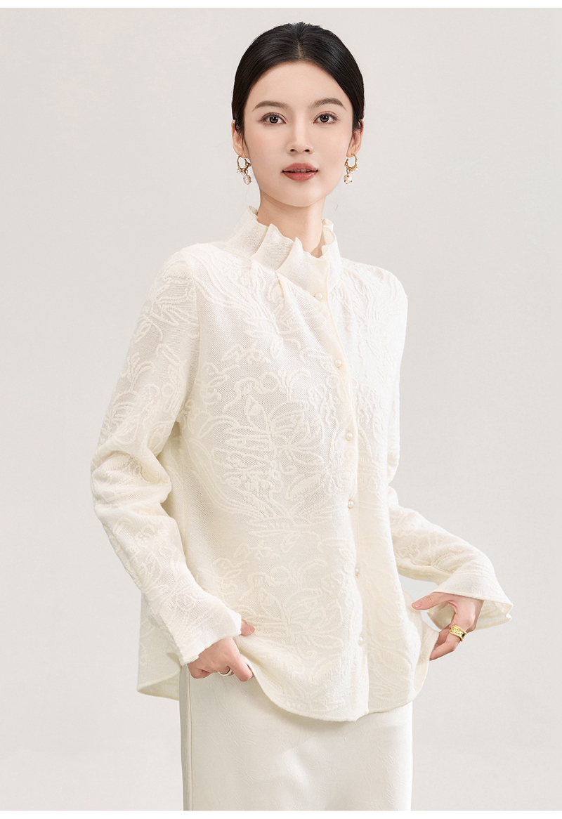 2026春装立体交织提花木耳边立领微喇长袖单排扣针织衬衣