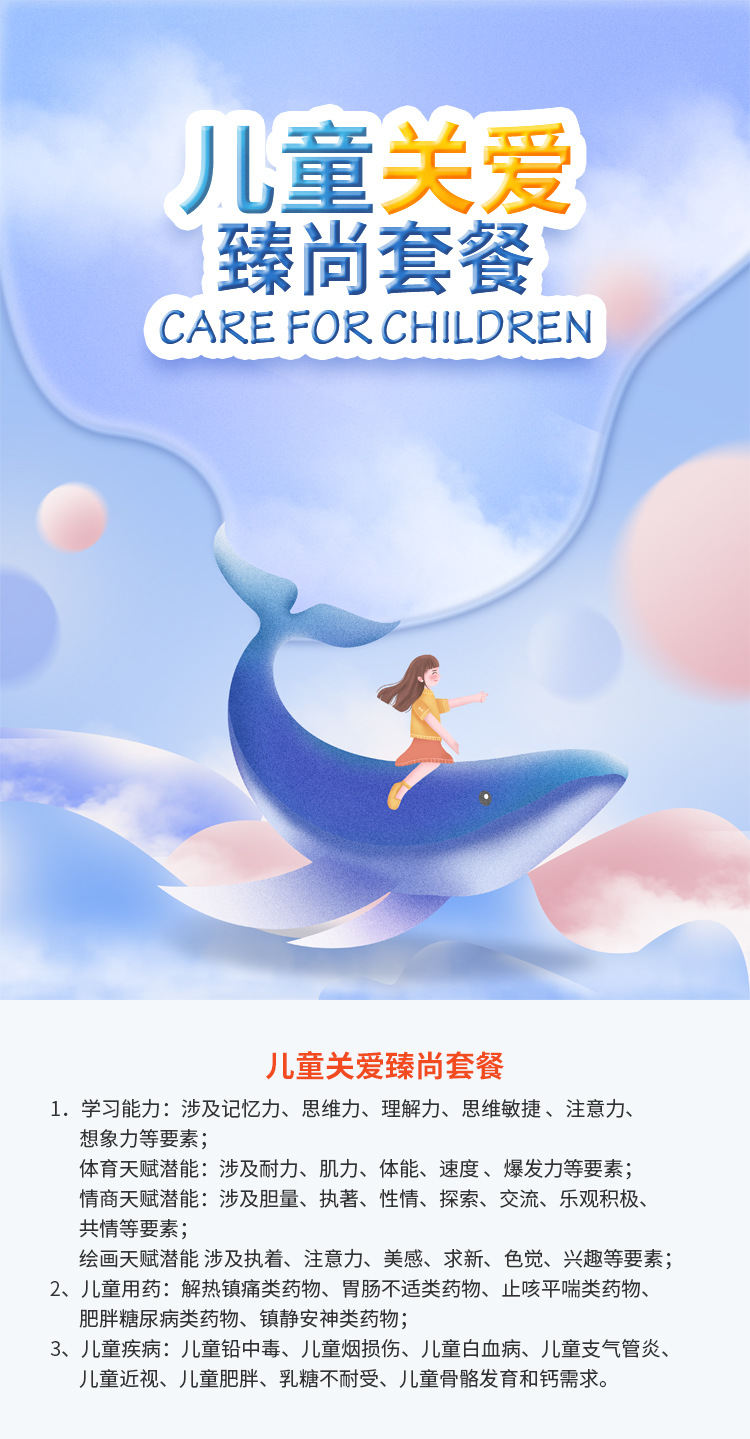 【基因检测-儿童关爱臻尚套餐】基因评估检测儿童学习能力、体育天赋潜能、情商天赋潜能、绘画天赋潜能、儿童用药、儿童疾病