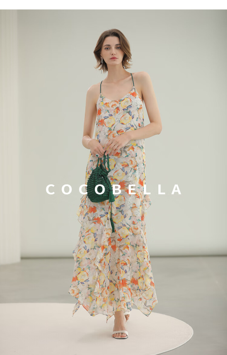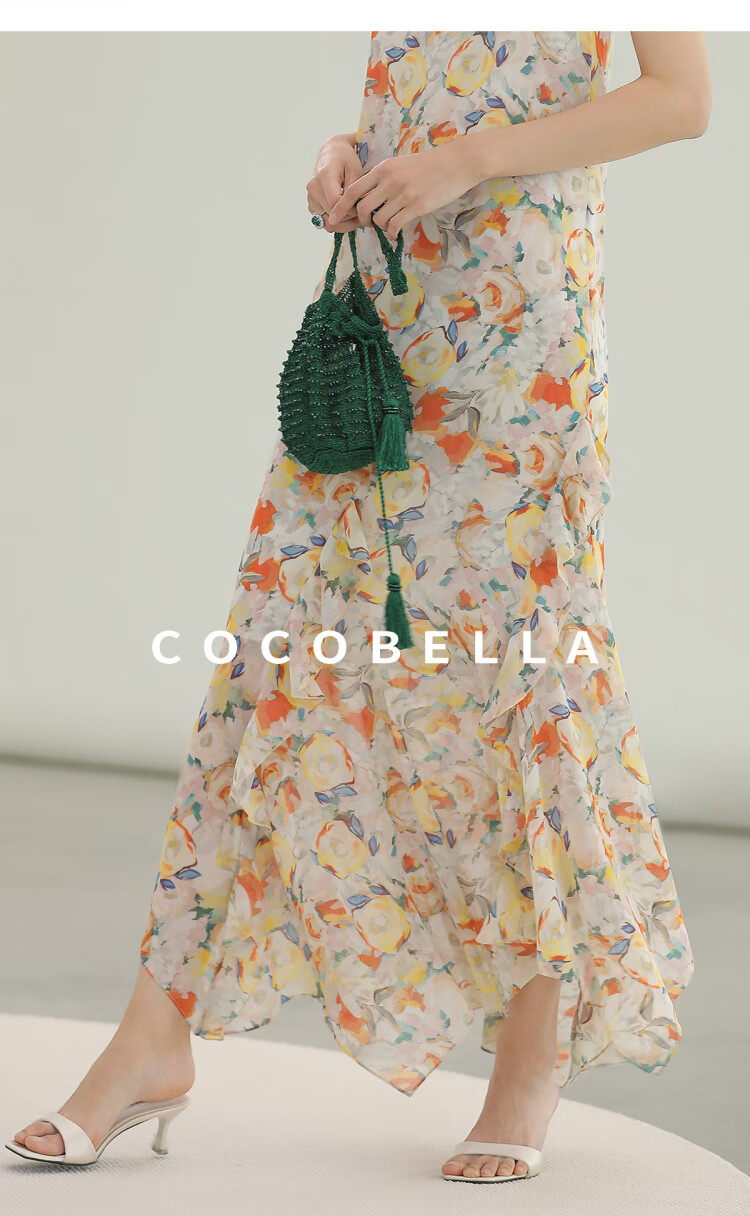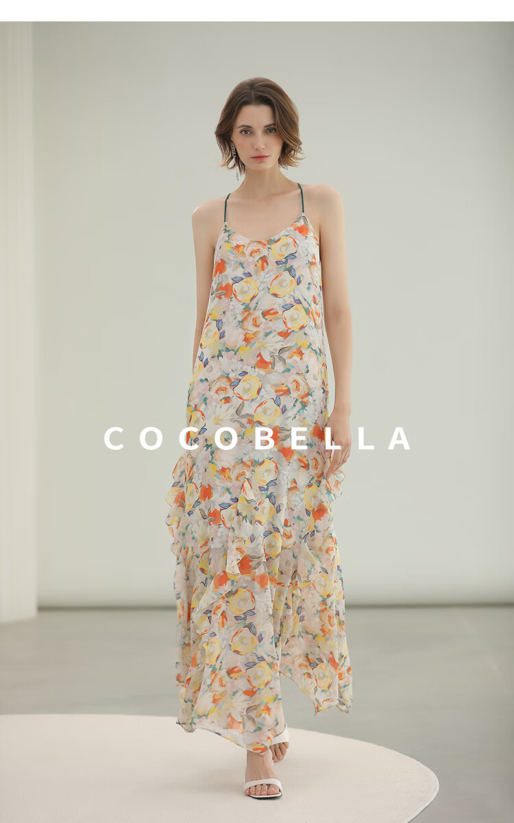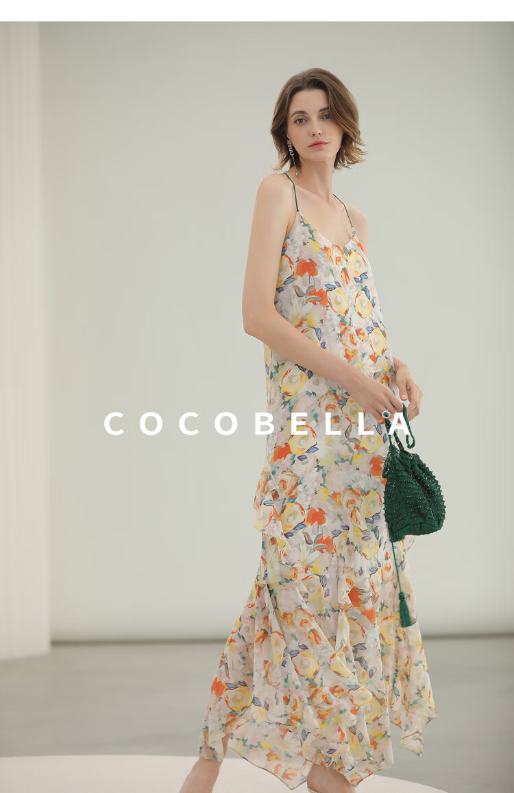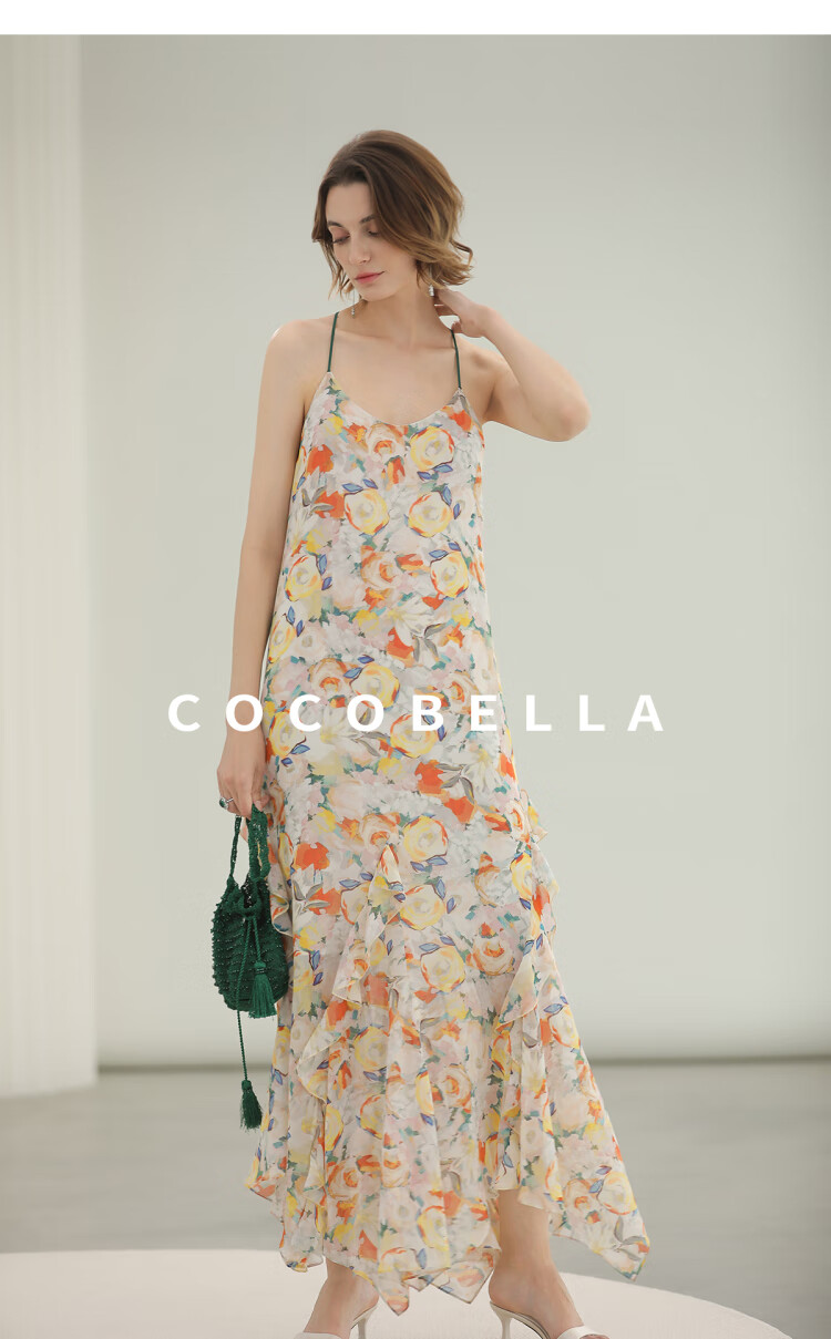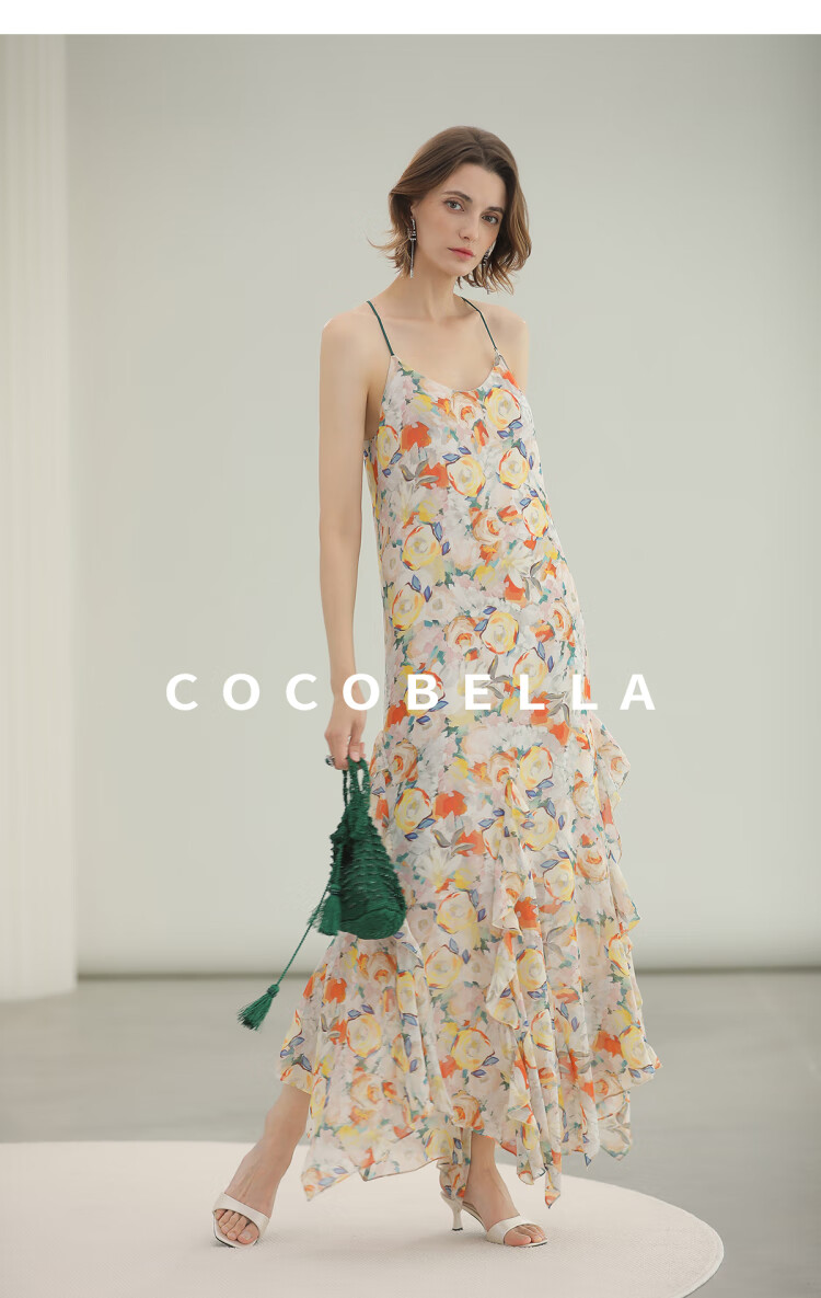 COCOBELLA灵动荷叶边亮彩花卉连衣裙夏飘逸鱼尾吊带裙FR3092