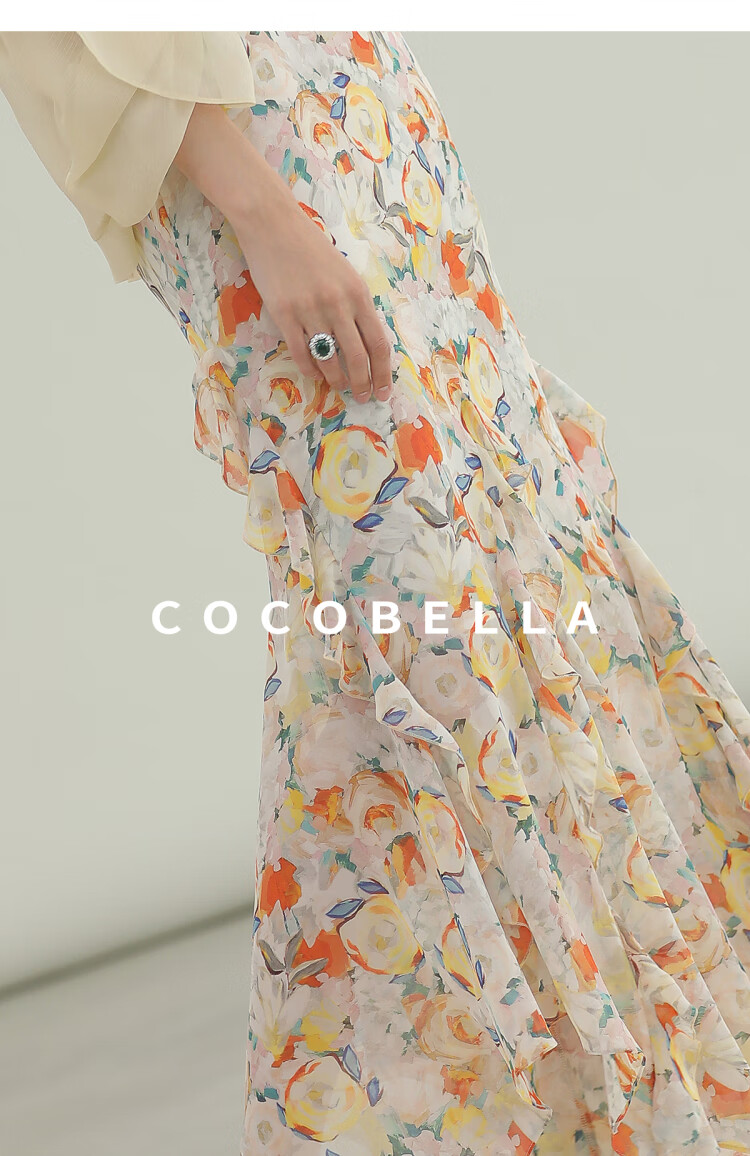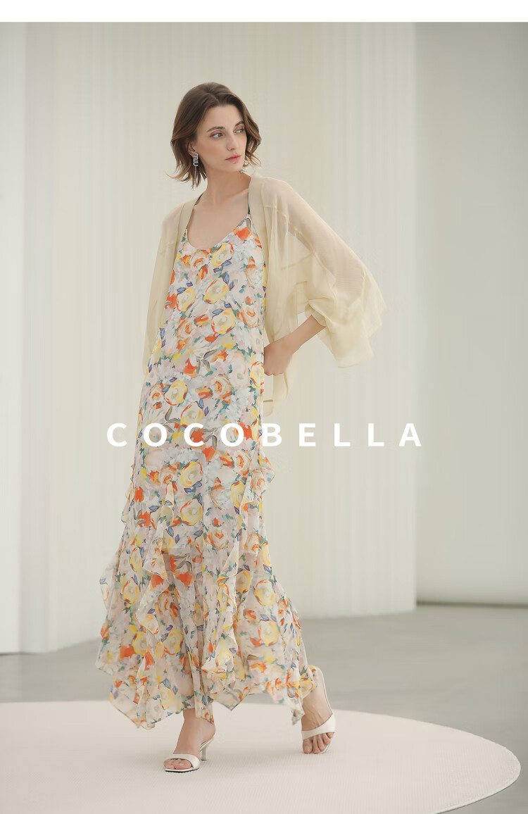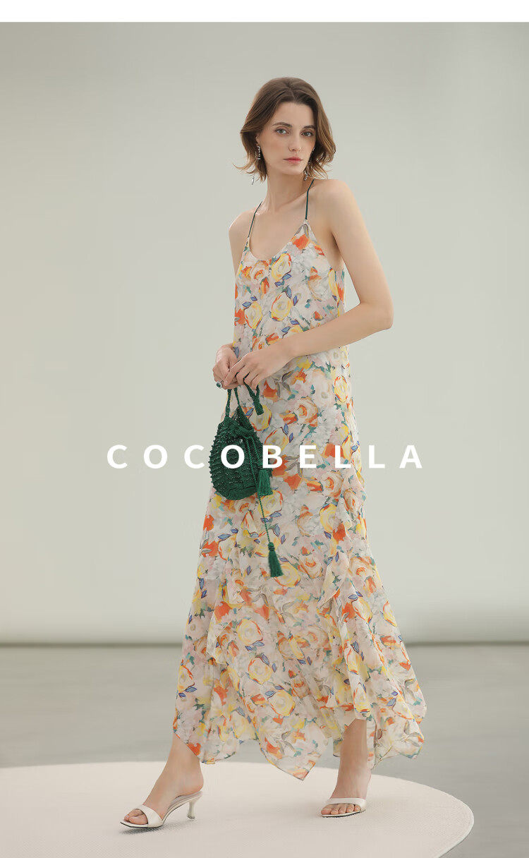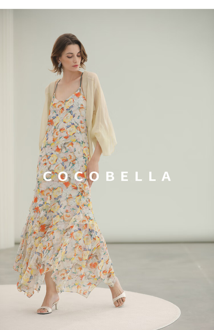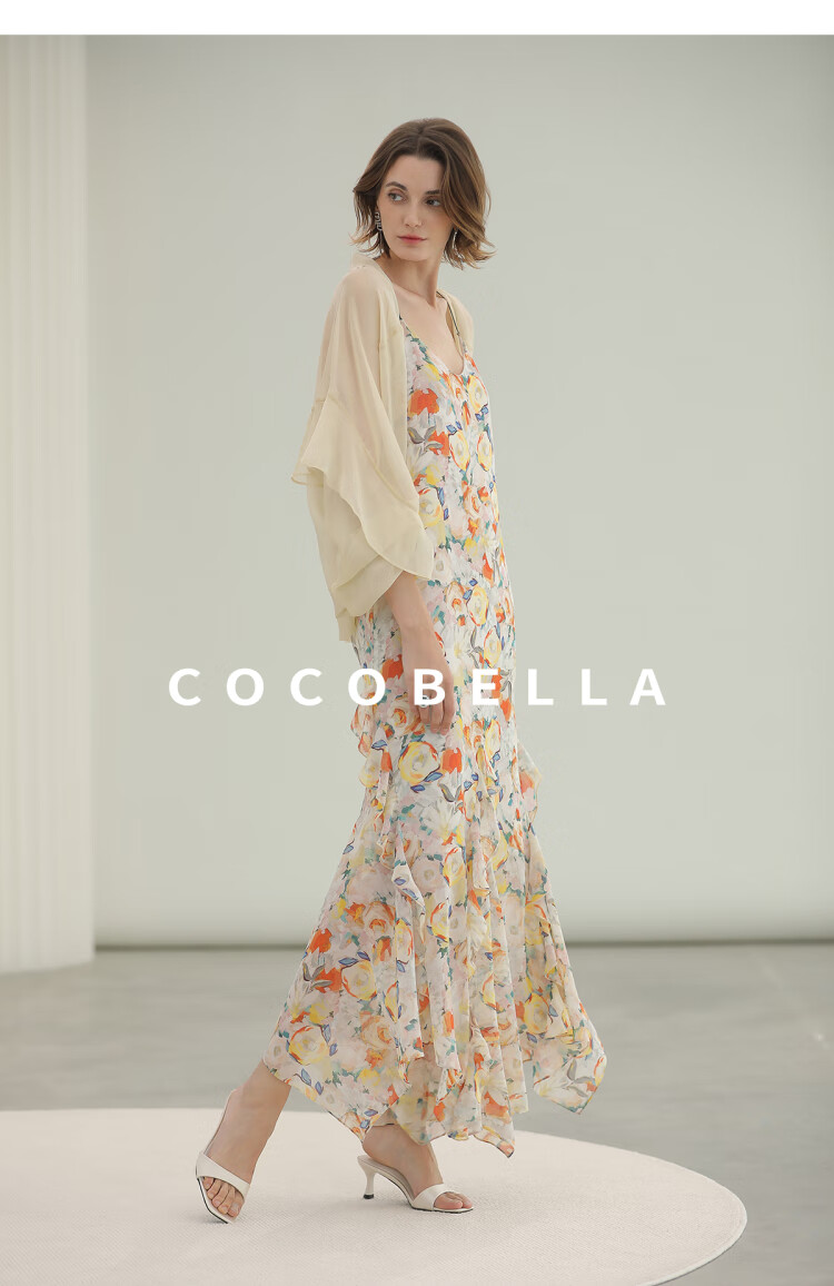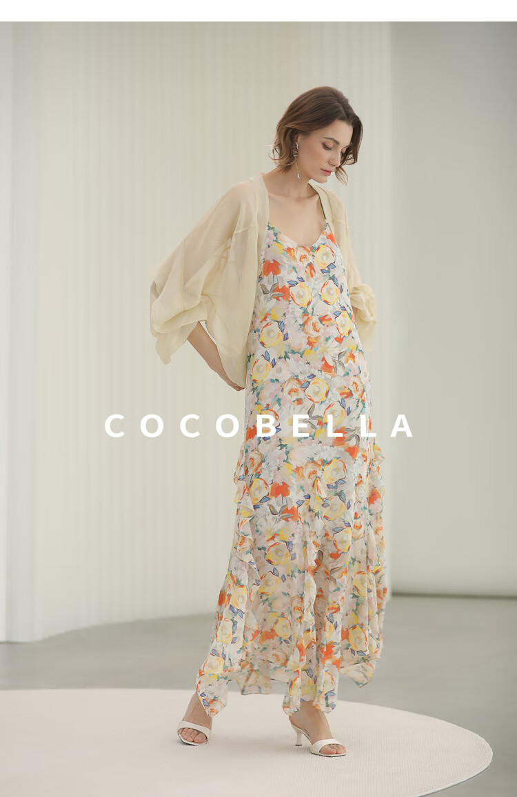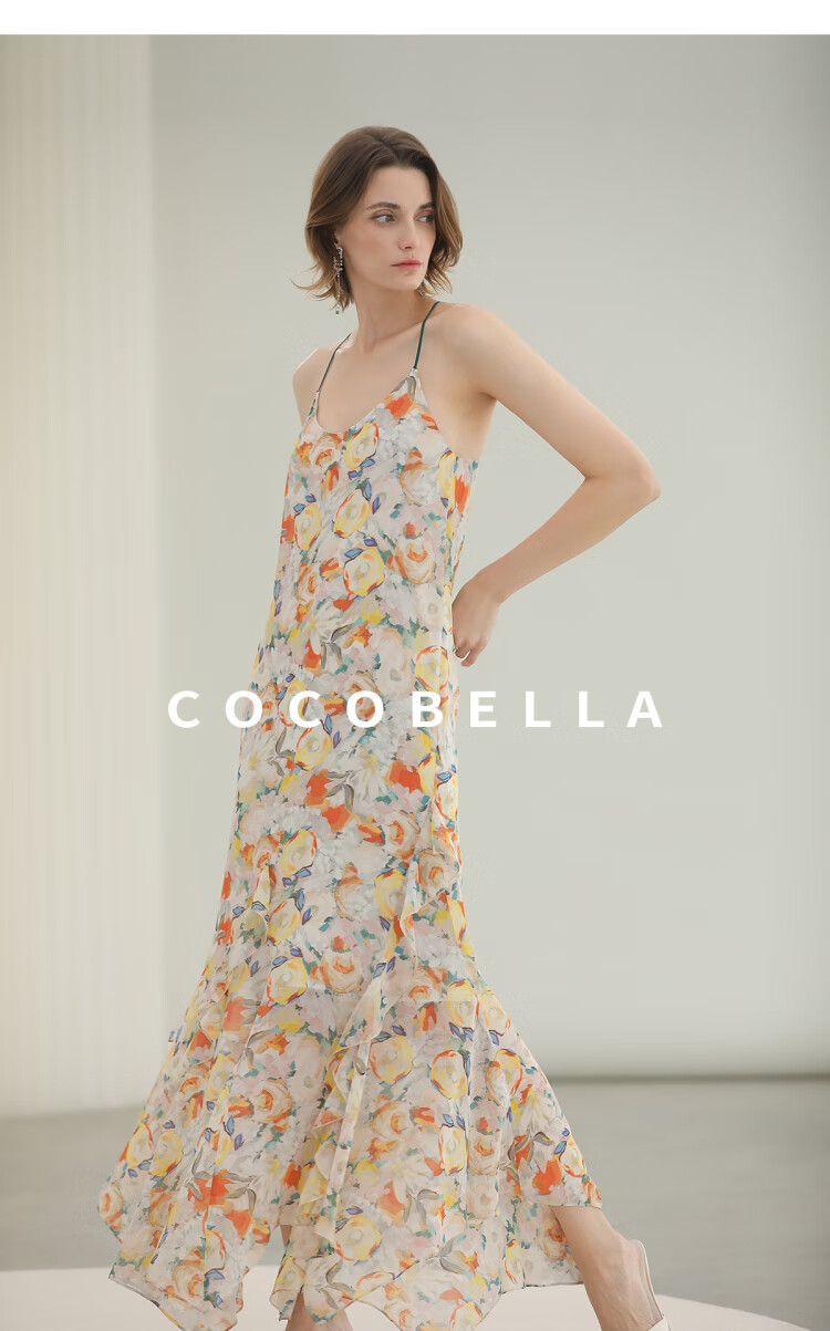 COCOBELLA灵动荷叶边亮彩花卉连衣裙夏飘逸鱼尾吊带裙FR3092