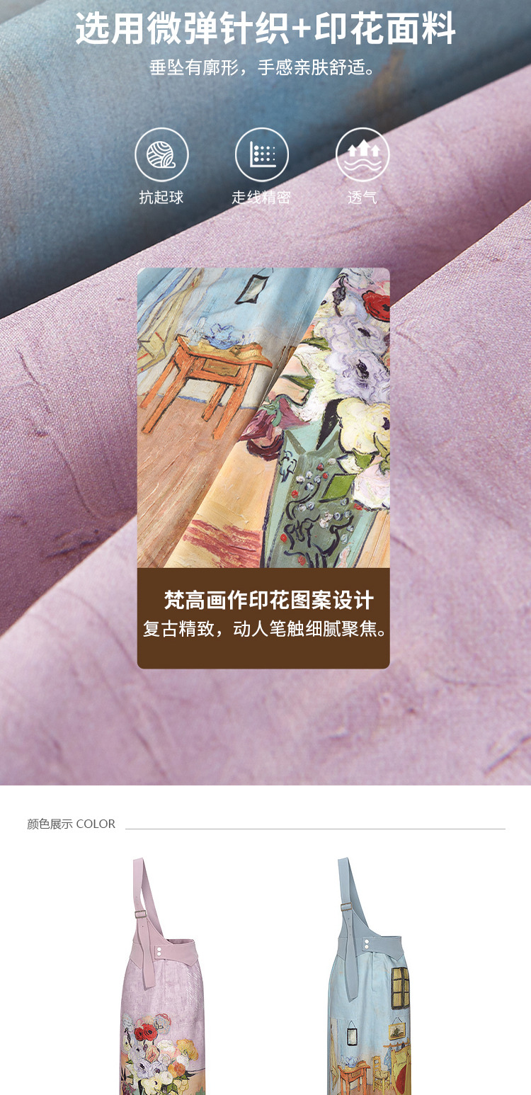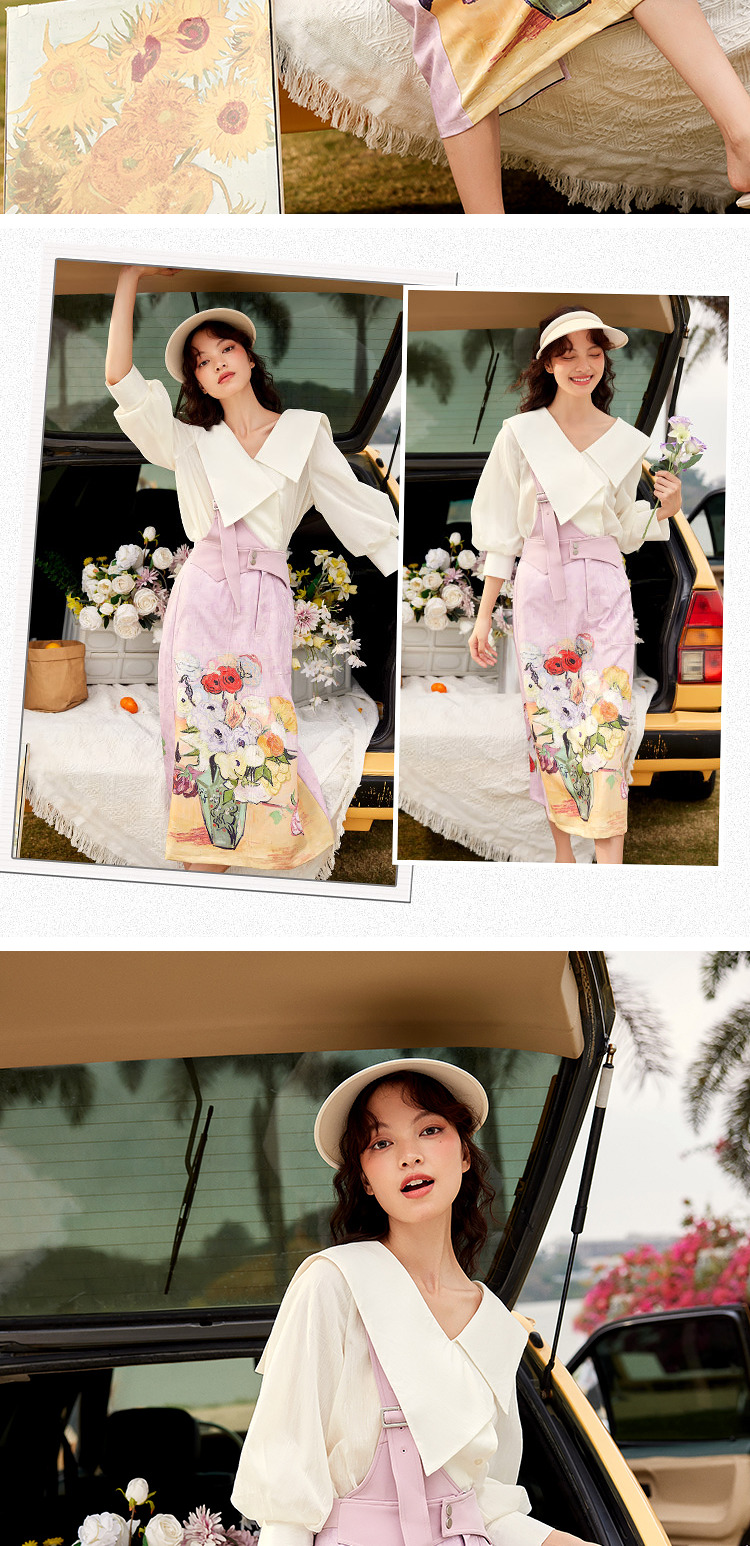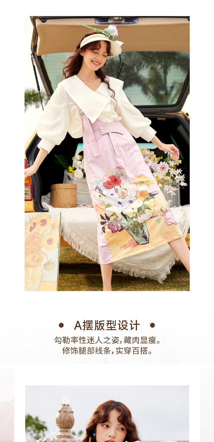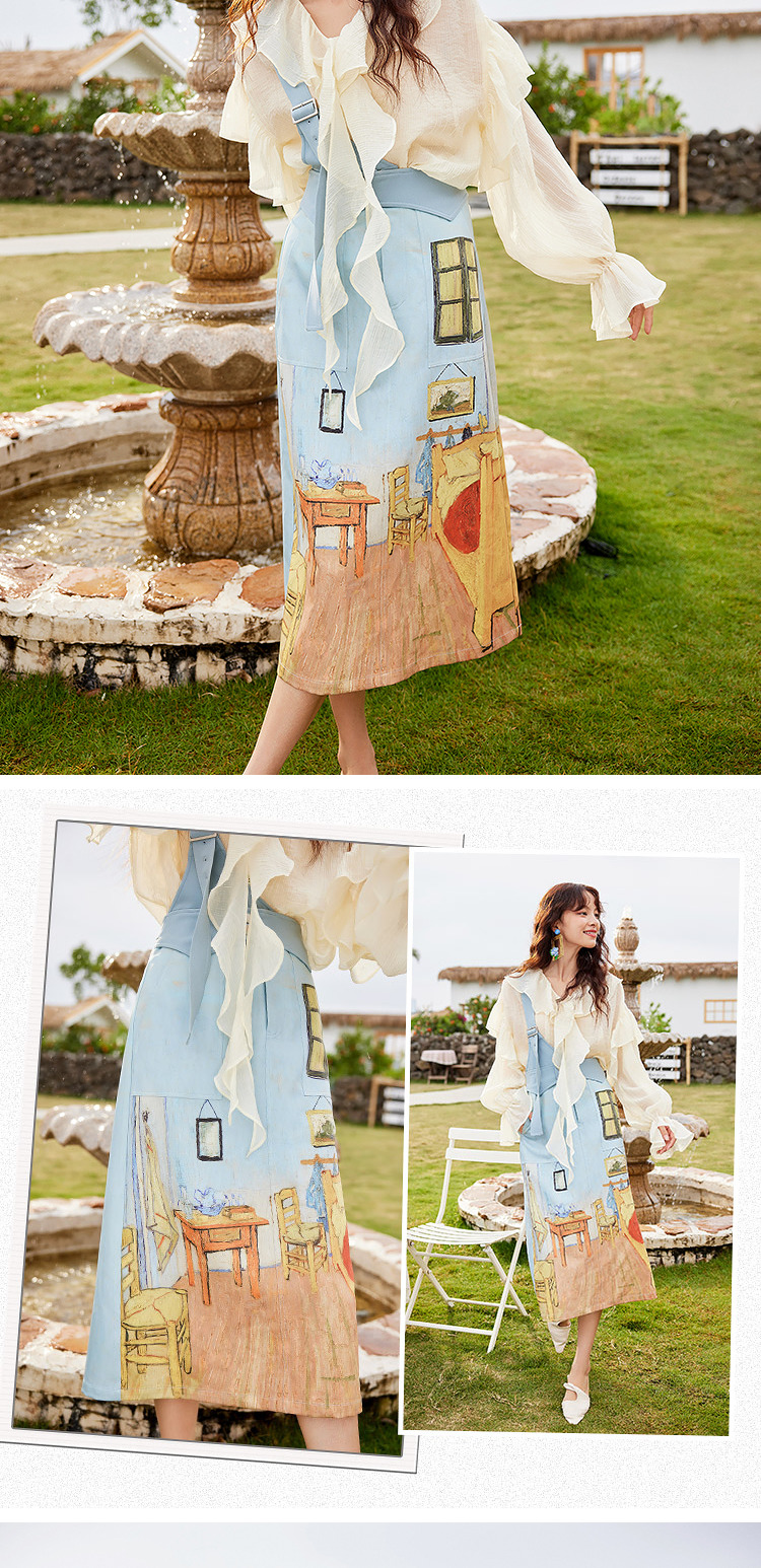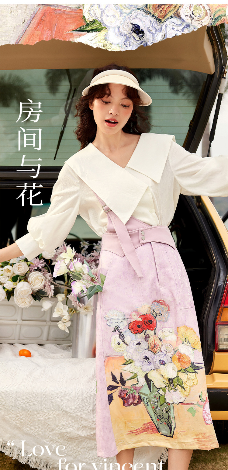 两三事梵高艺术房间与花复古油画印花单边背带半身裙