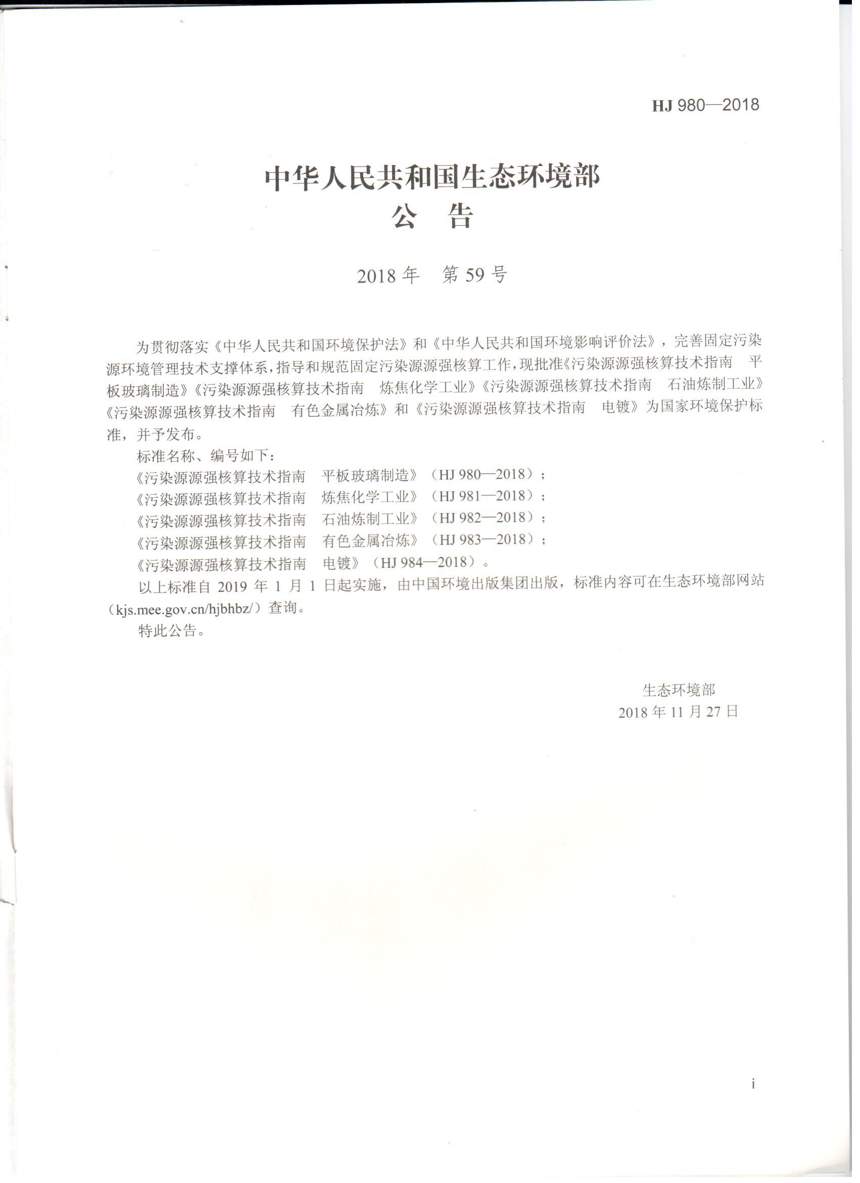 HJ 980-2018 污染源源强核算技术指南 平板玻璃制造 环境保护标准