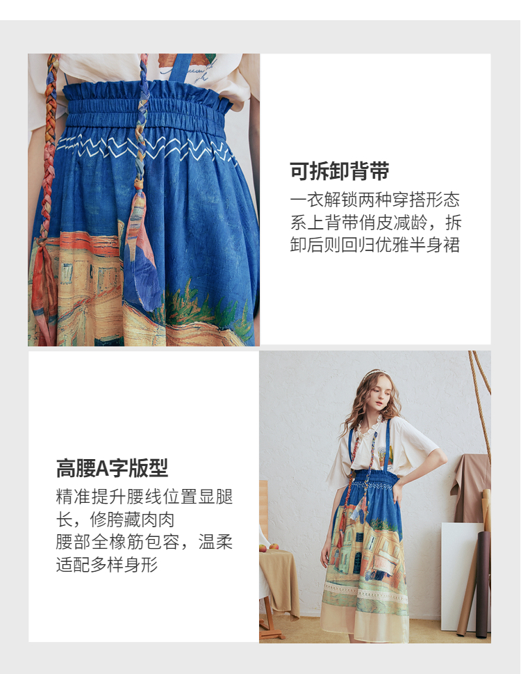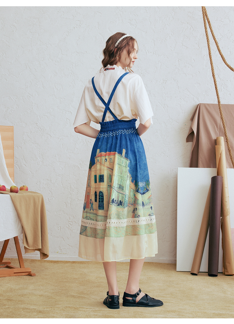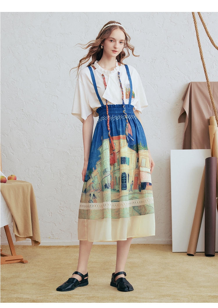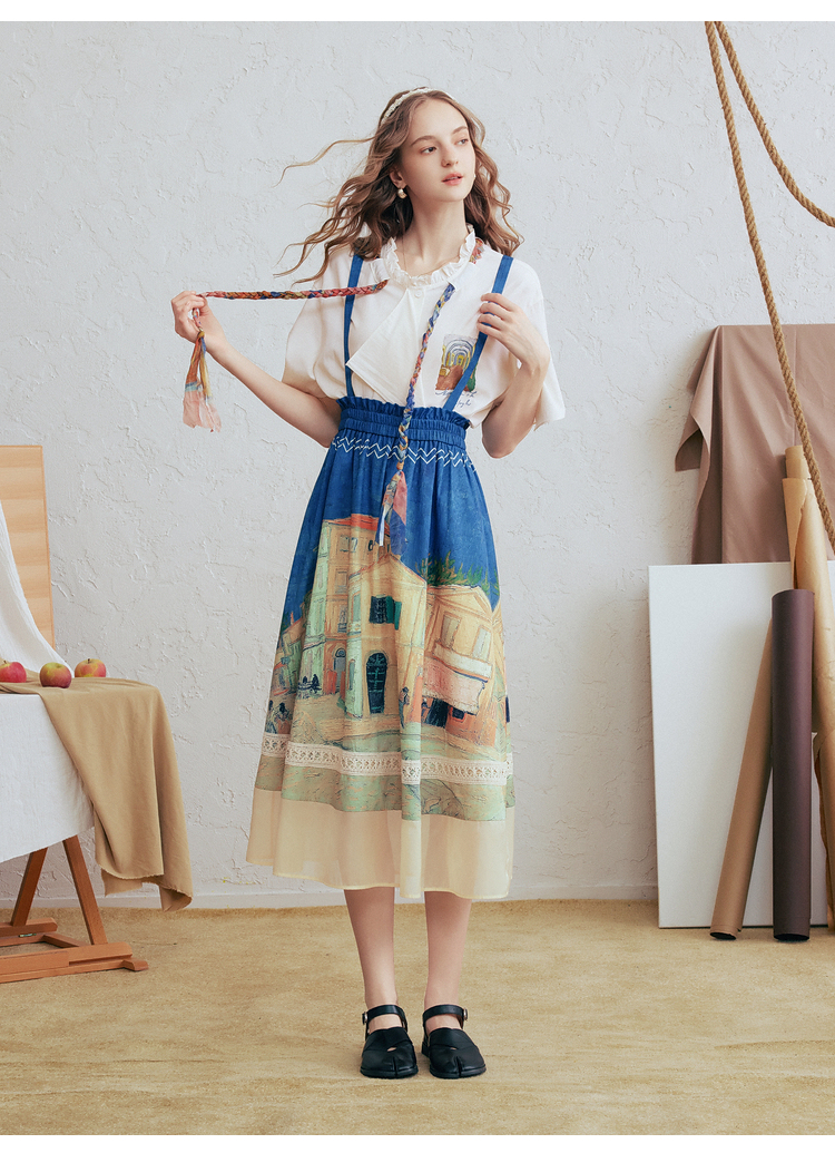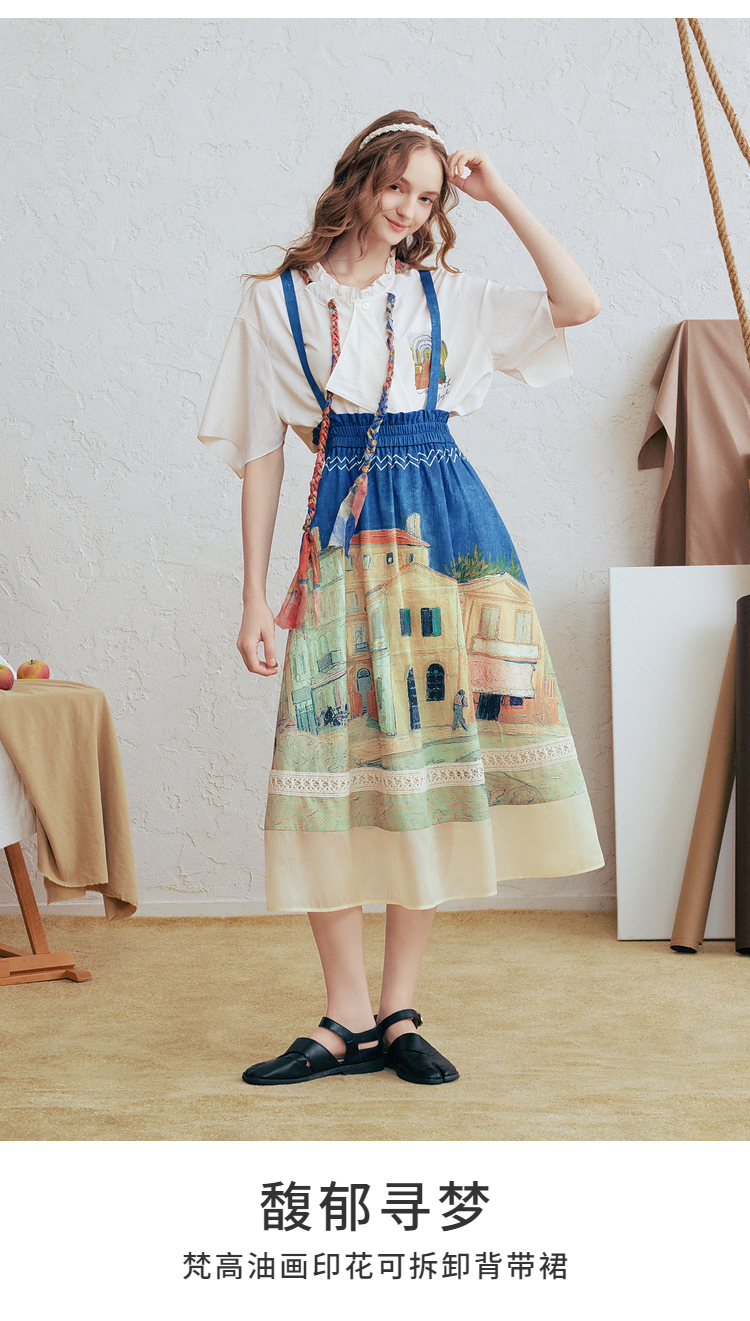 两三事梵高文艺 馥郁寻梦 2026春季新款文艺风印花可拆背带半身裙