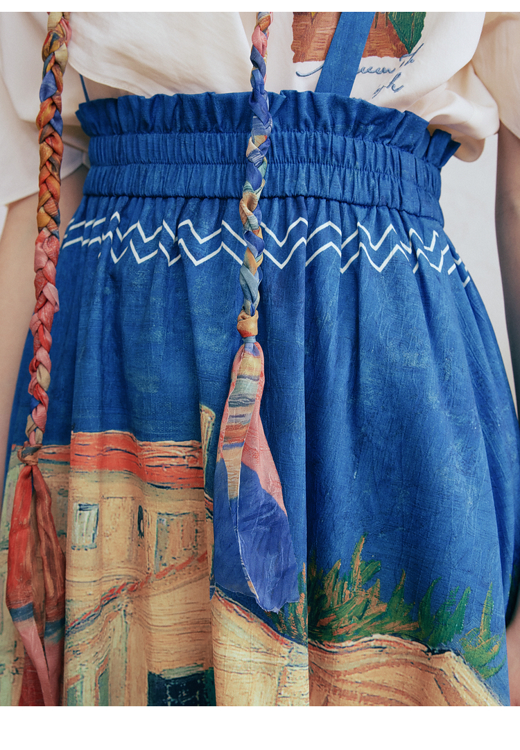 两三事梵高文艺艺术长廊2025夏季新款复古印花抽绳绑带两穿半身裙