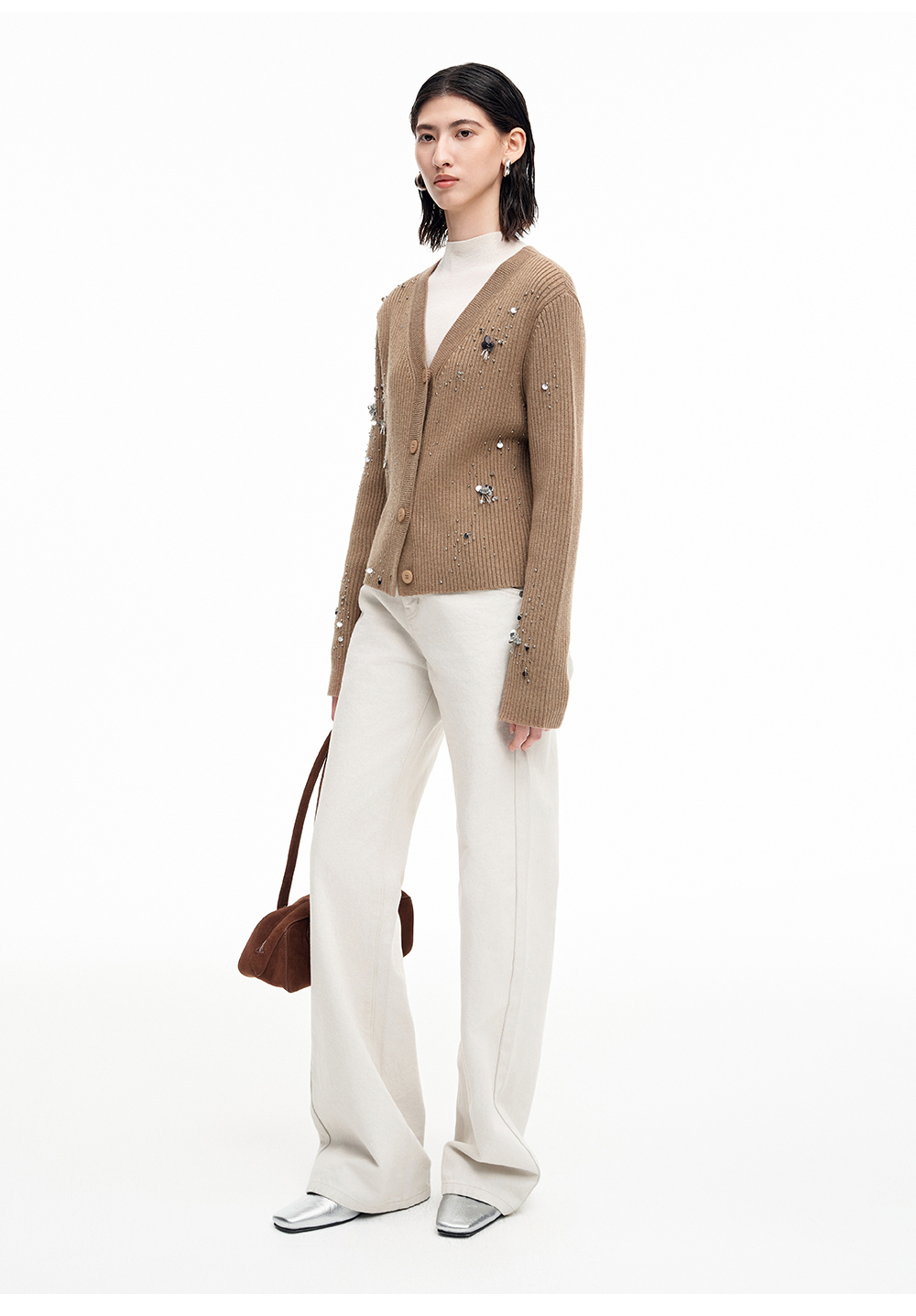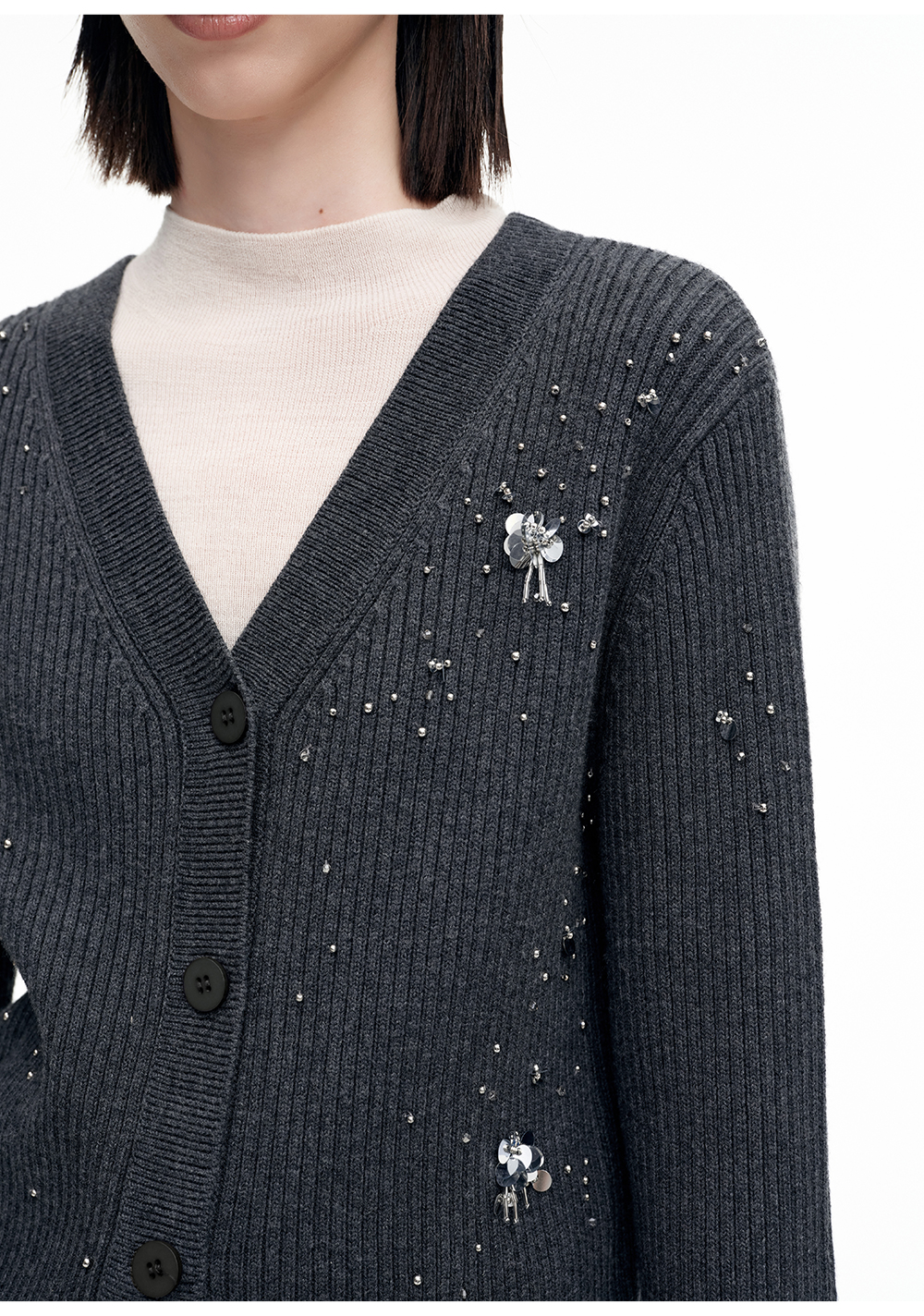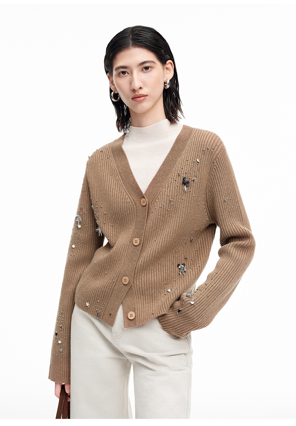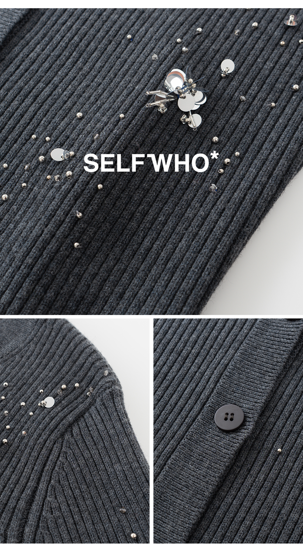 SELFWHO绵羊毛混纺钉珠装饰繁花V领针织开衫女2025秋新款毛衣外套