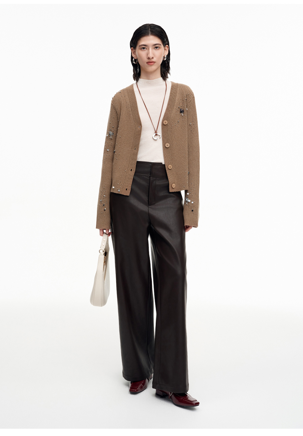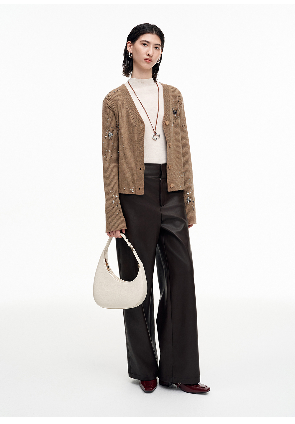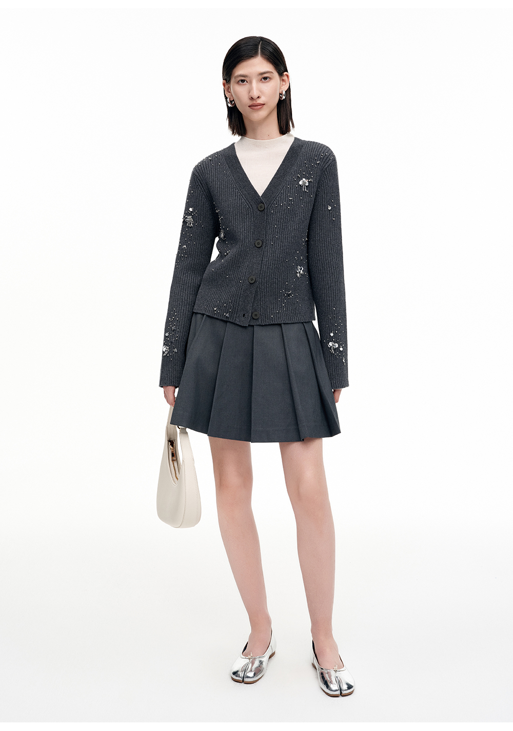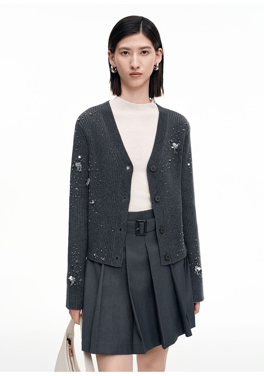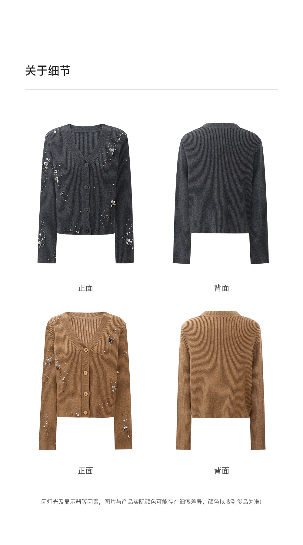 SELFWHO绵羊毛混纺钉珠装饰繁花V领针织开衫女2025秋新款毛衣外套