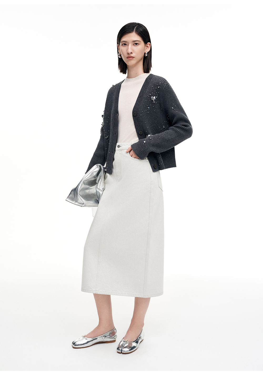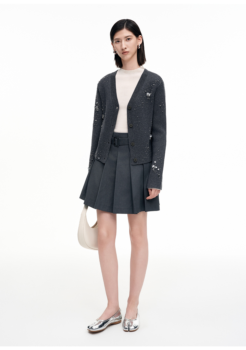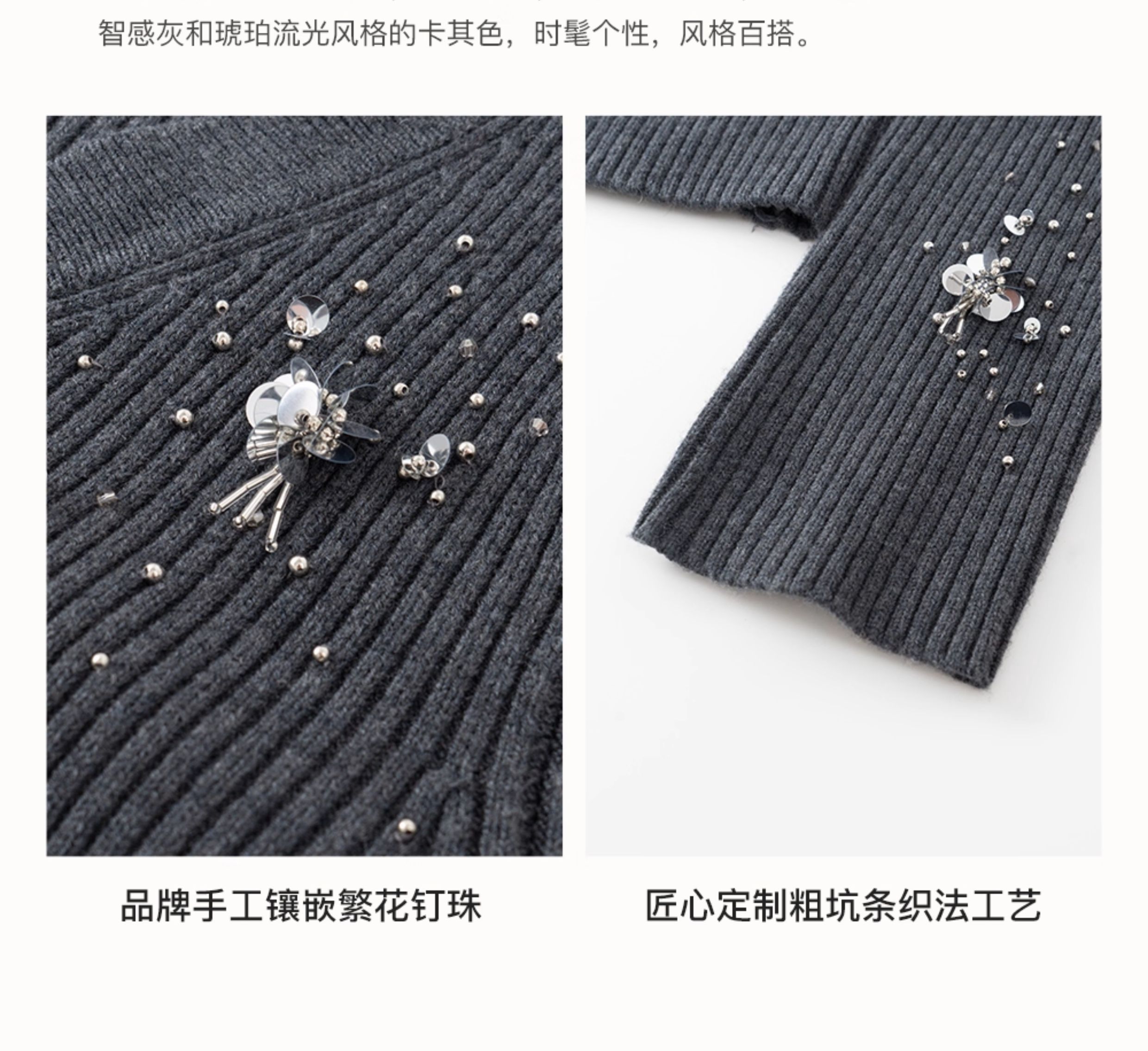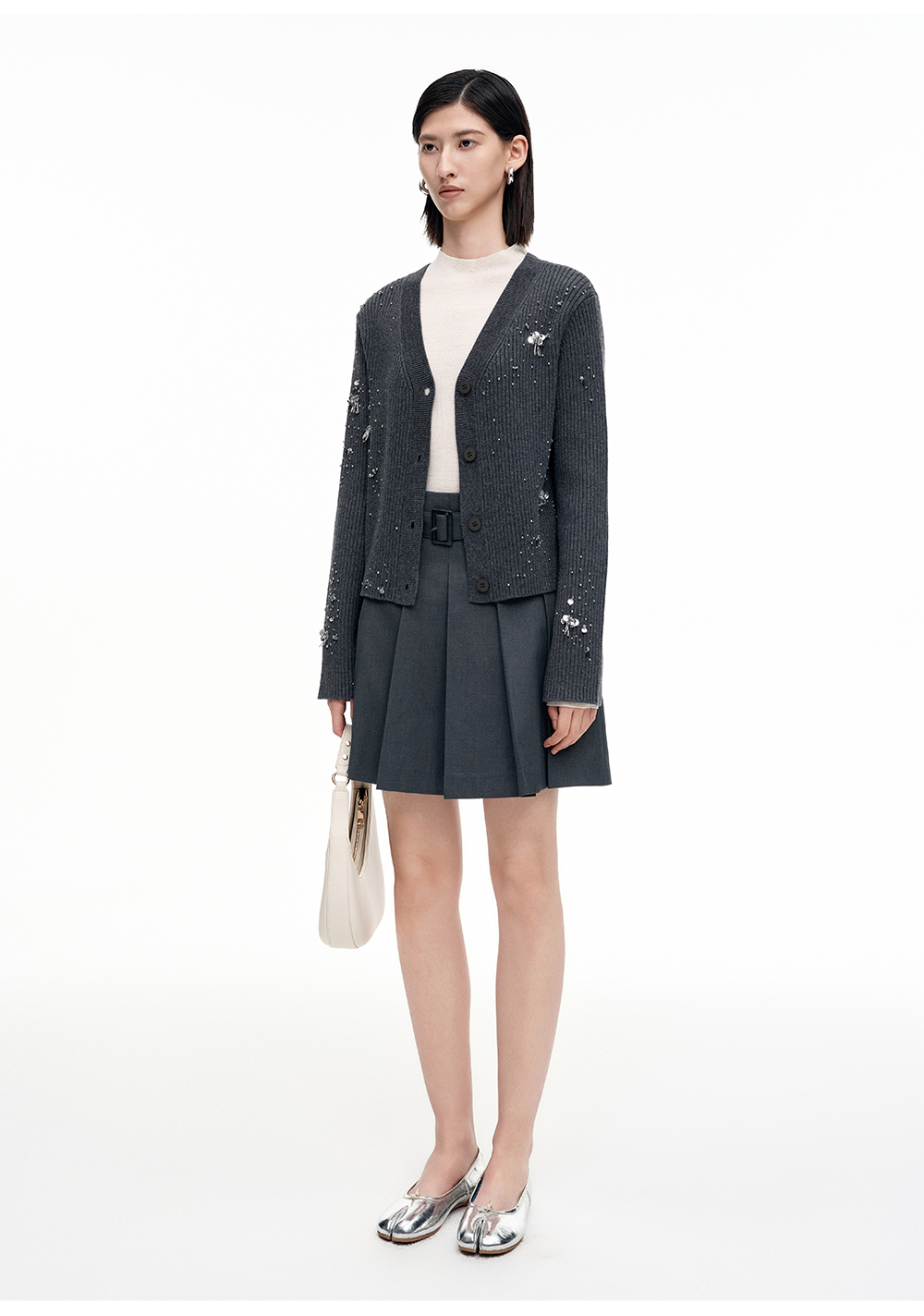 SELFWHO绵羊毛混纺钉珠装饰繁花V领针织开衫女2025秋新款毛衣外套