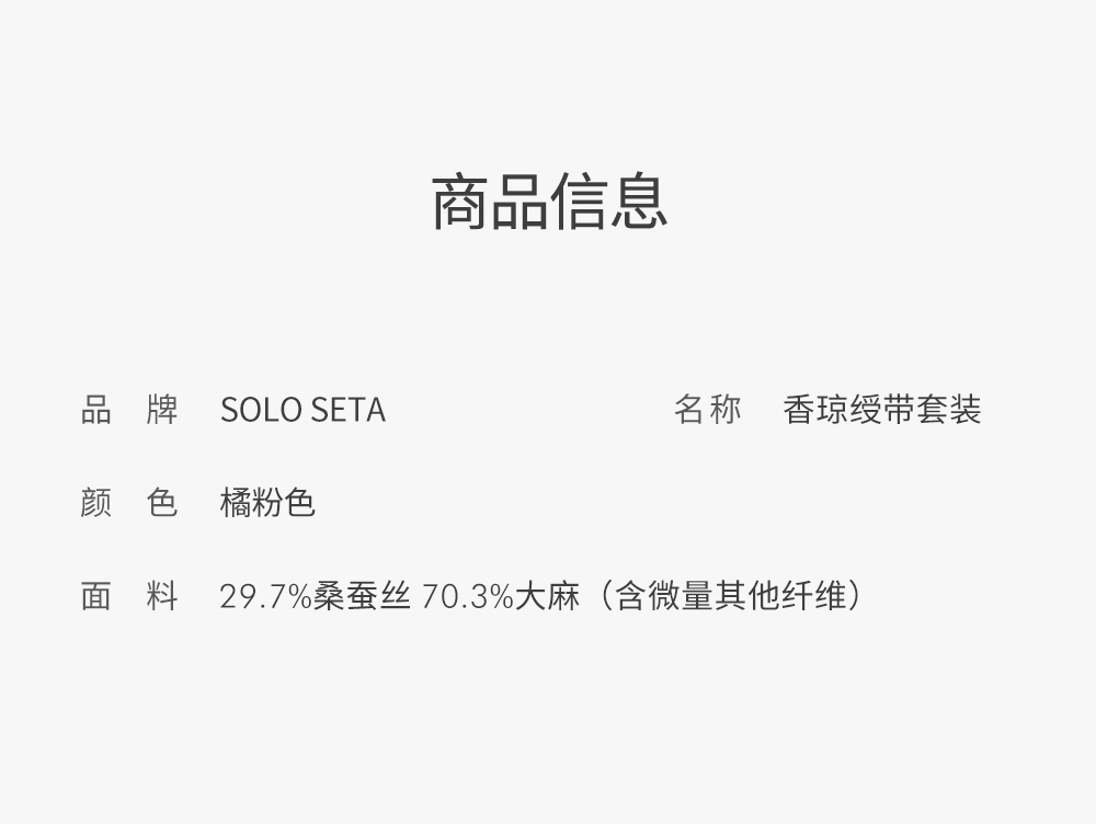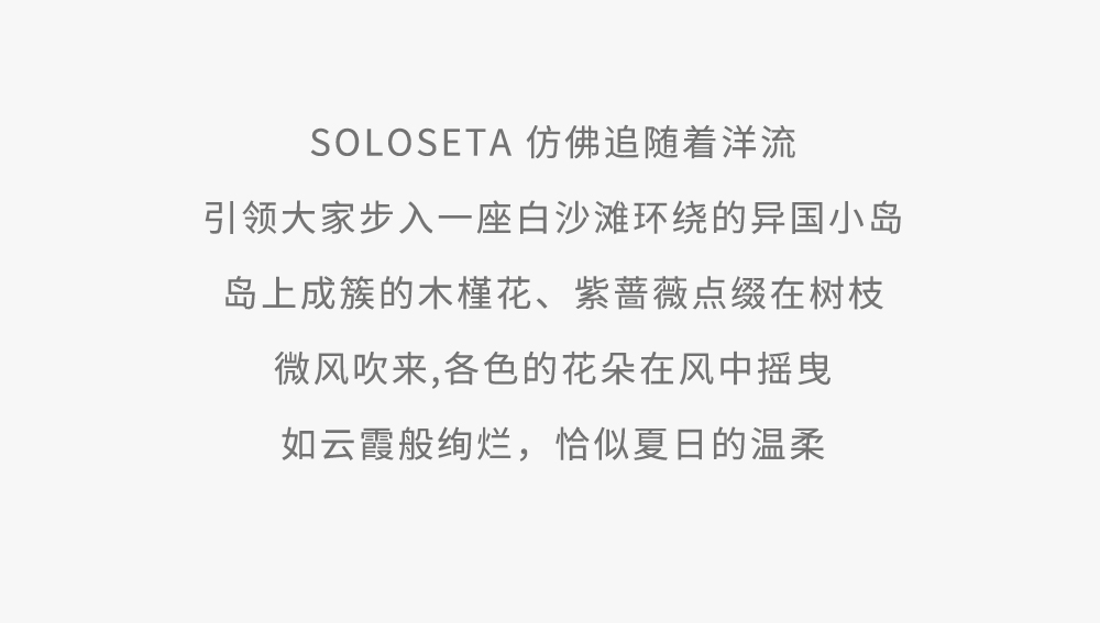 - soloseta专注于真丝织物,灵感源自意大利语,中文含义为“只做真丝”的意思。让睡衣变时尚,居家和外出瞬间切换,使其更具有出街,度假,参加宴会等功能。