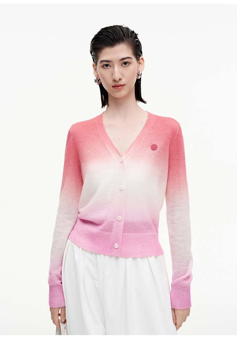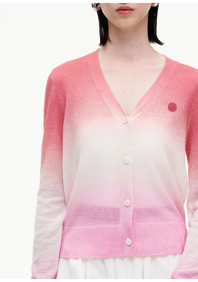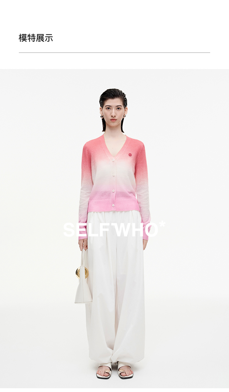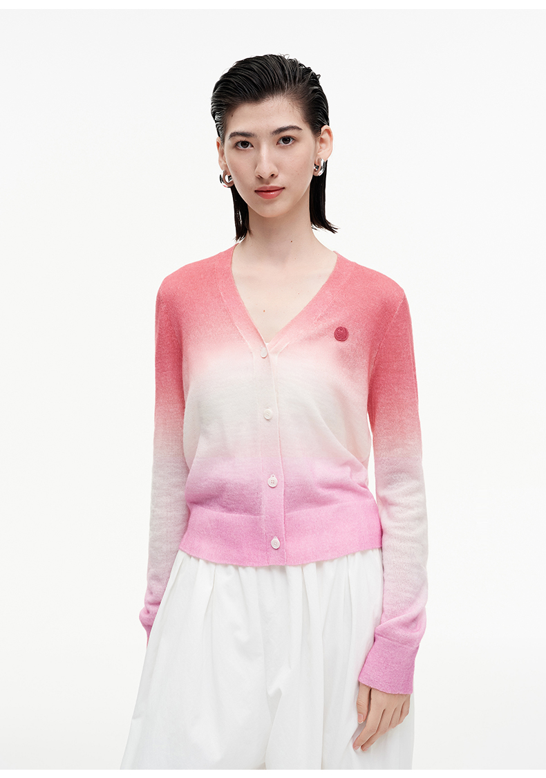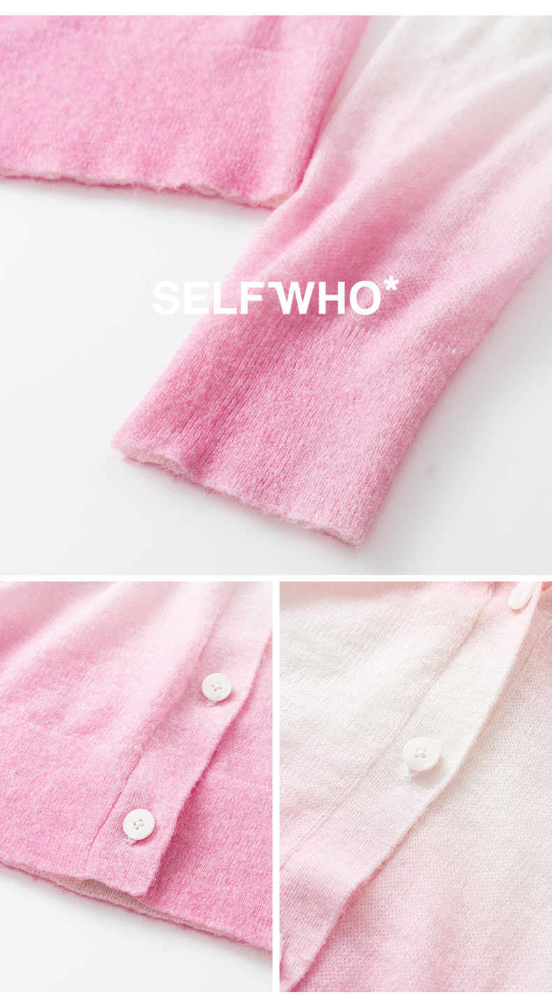 SELFWHO笑脸衣橱羊毛马海毛渐变撞色针织衫女2025秋新款V领短开衫