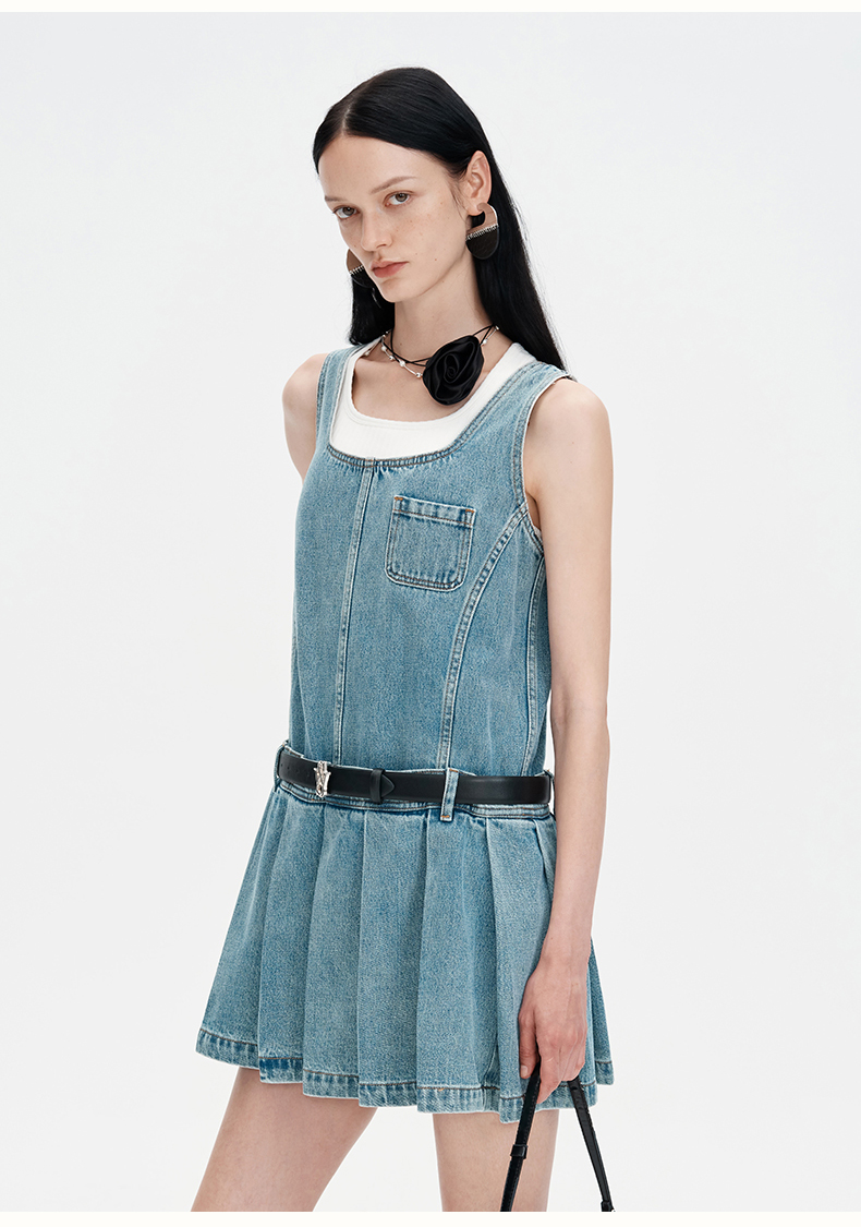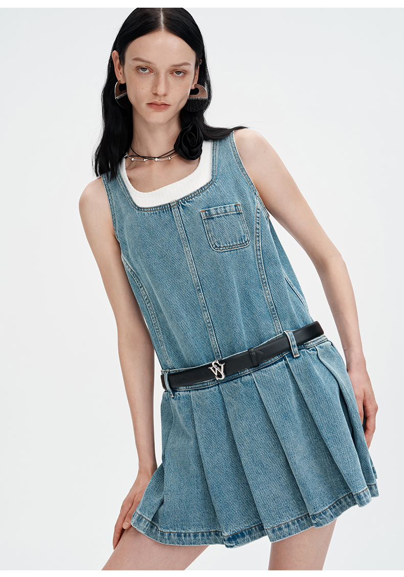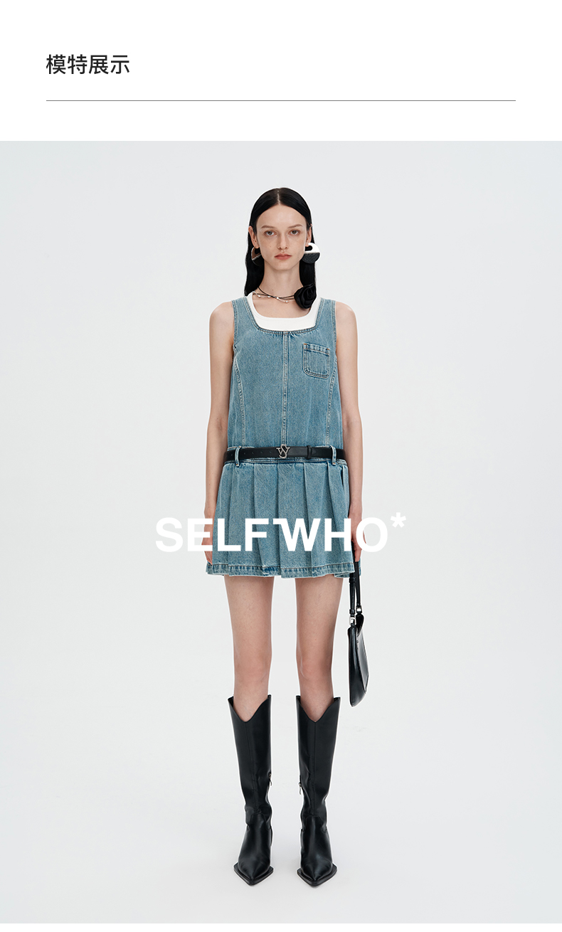 SELFWHO浮影牛仔系列纯棉牛仔连衣裙女秋2024新款拼接a字百褶裙子
