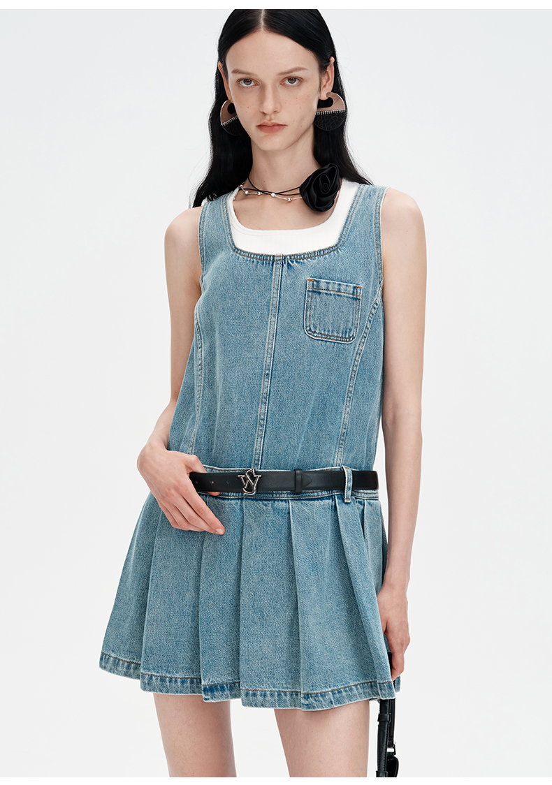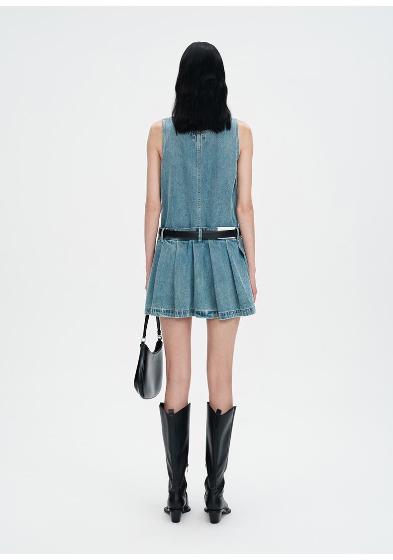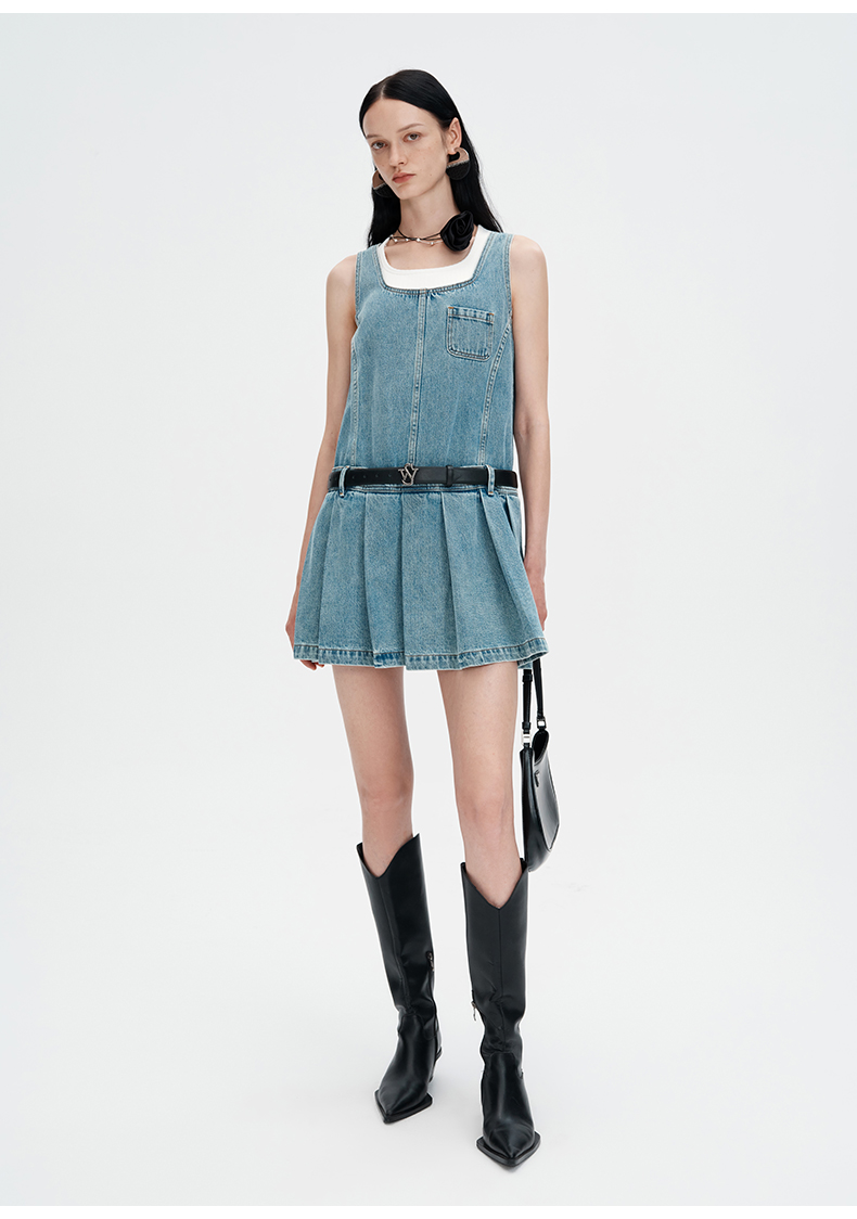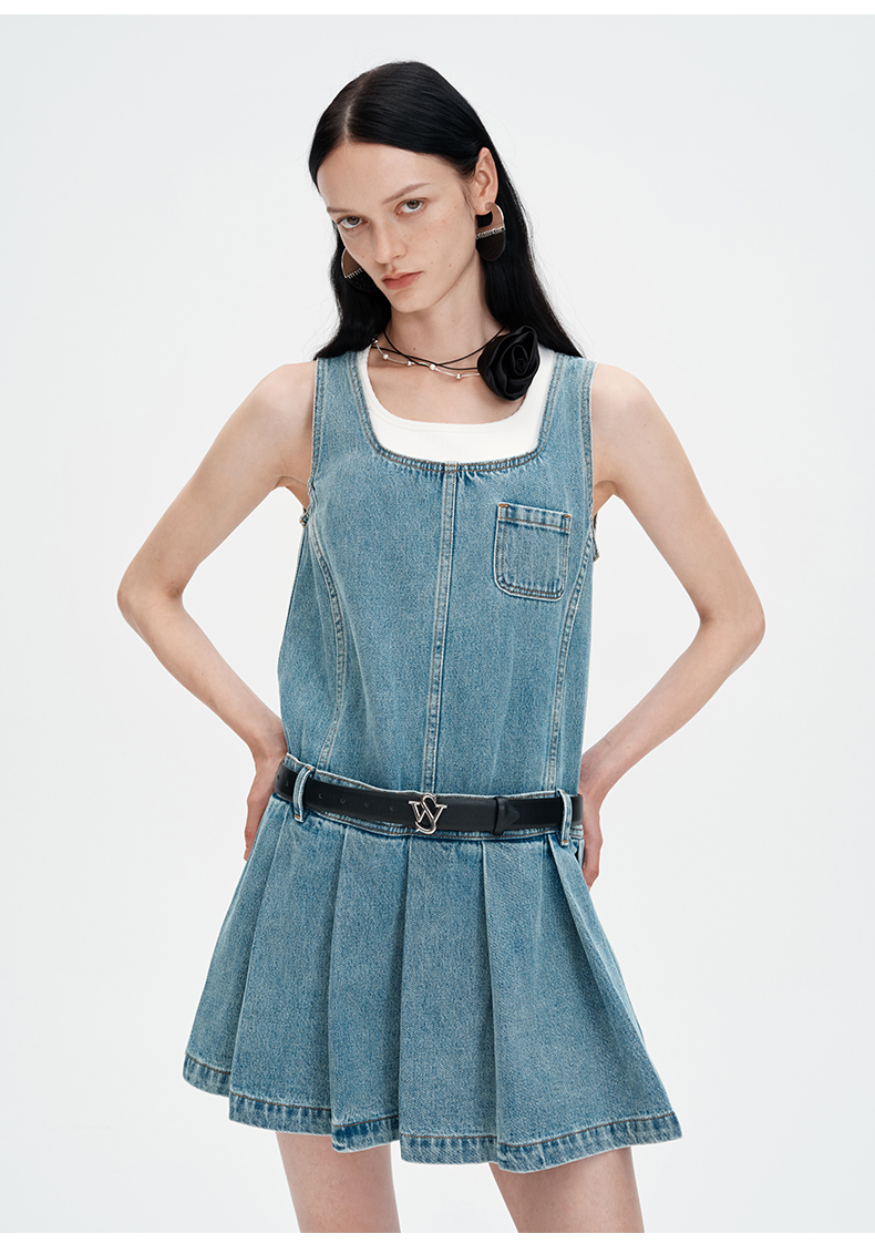 SELFWHO浮影牛仔系列纯棉牛仔连衣裙女秋2024新款拼接a字百褶裙子