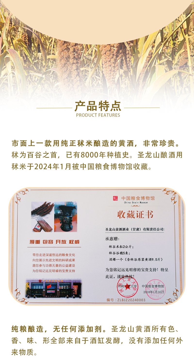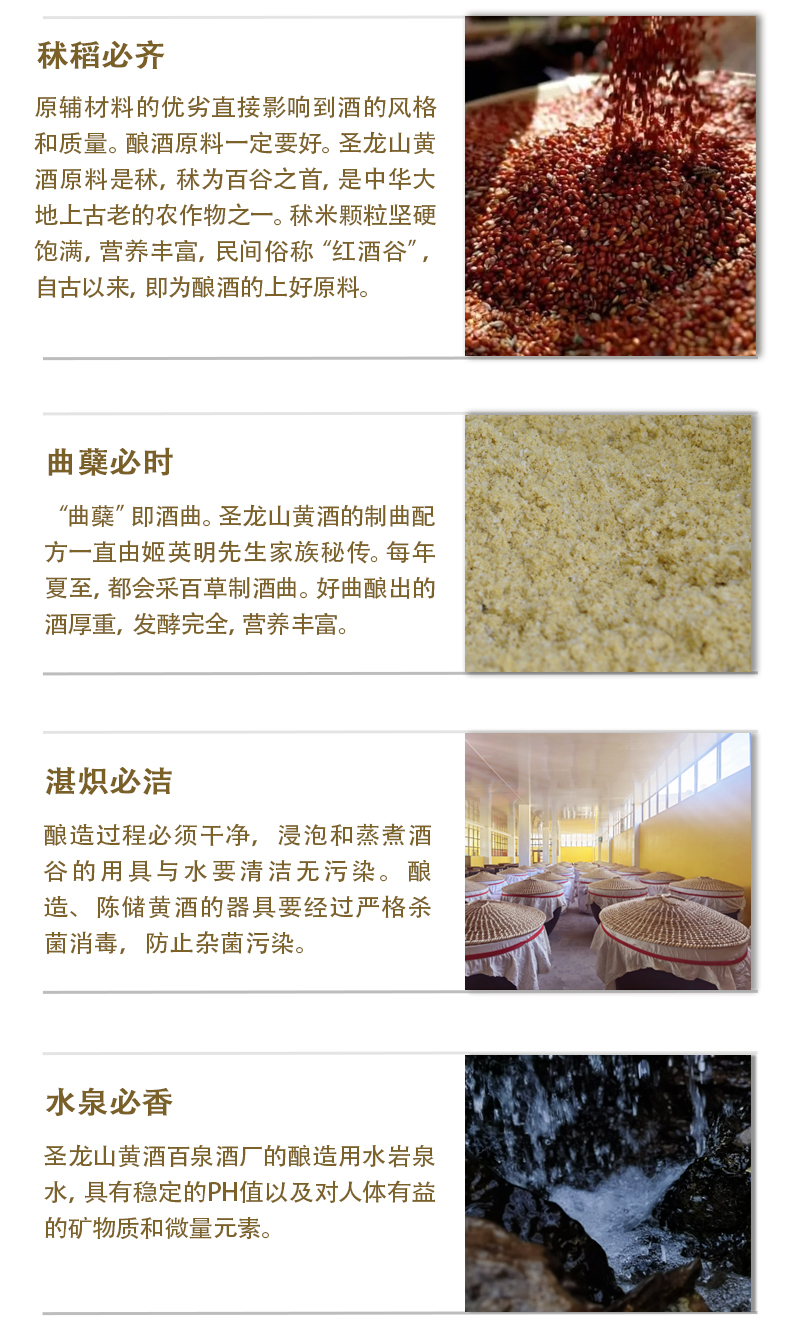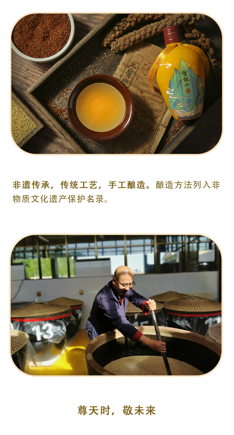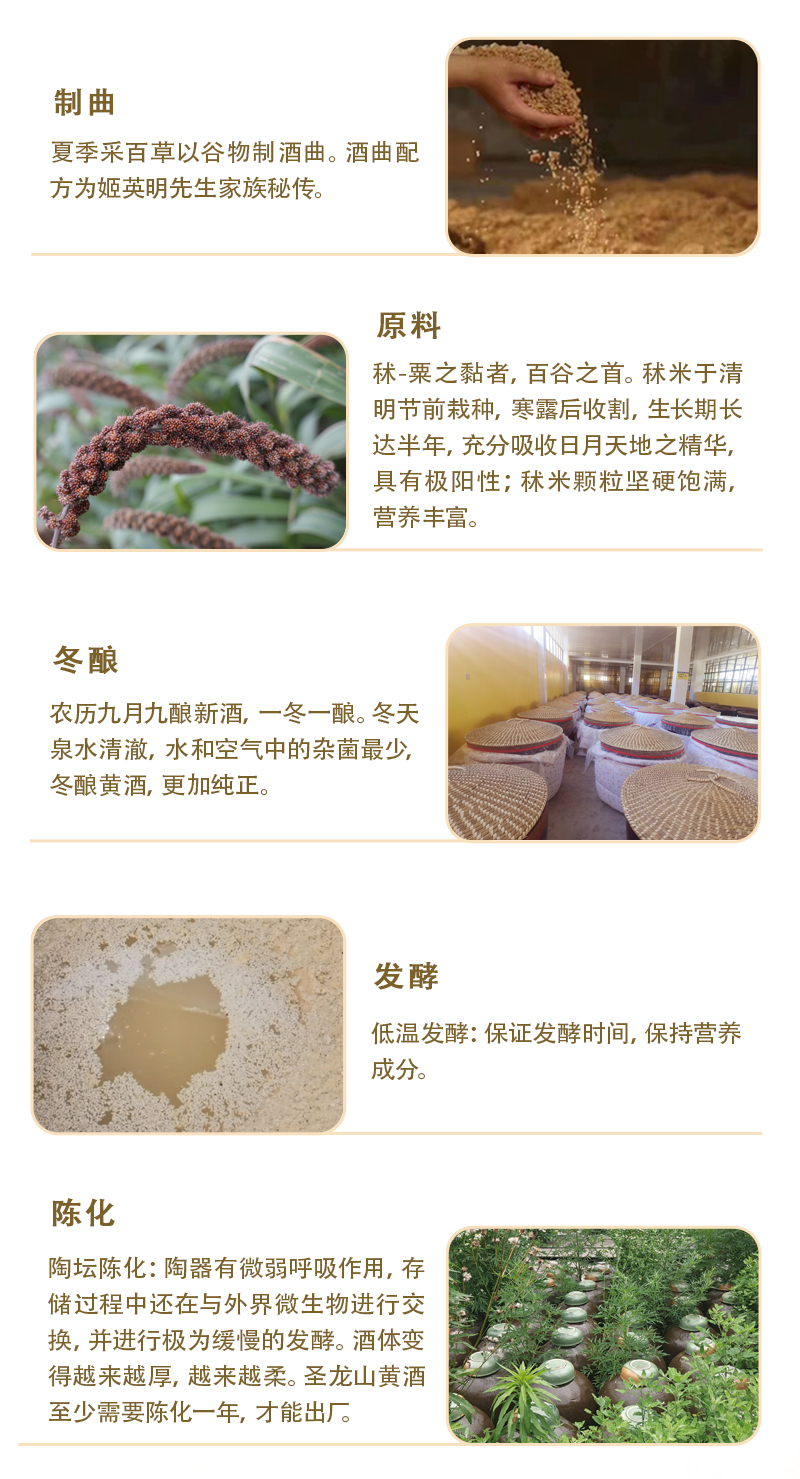 圣龙山品牌起源 用实业把濒临灭绝的华族五谷之首秫(酒谷),拯救回来! 用祖传秘制黄酒工艺,带动陇山里的农民共同富裕! 用古老的黄酒仪礼文化,把敬天法祖信仰普及开来 让华族发祥聖地,重新散发他应有的智慧