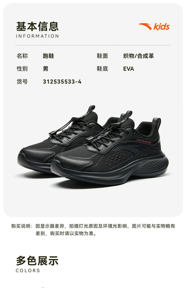 安踏儿童2025夏秋季男大童抽绳网面轻便舒适运动跑鞋312535533