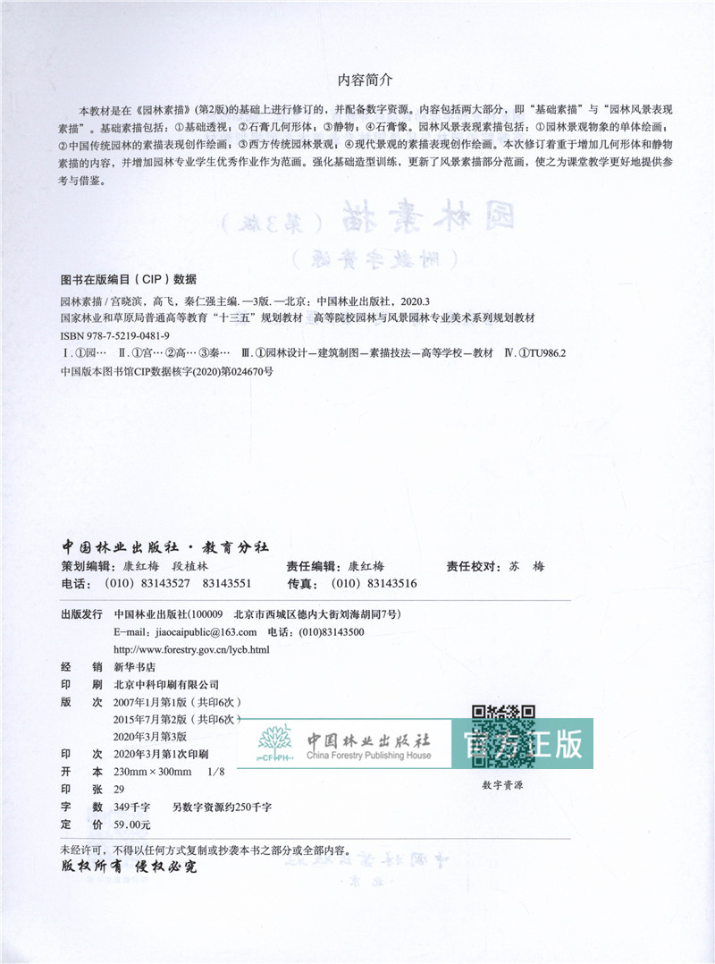 园林素描 第3版宫晓滨 0481 林业和草原局高等教育十三五规划教材 高等院校园林与风景园林专*美术系列规划教材 中国林业出版社