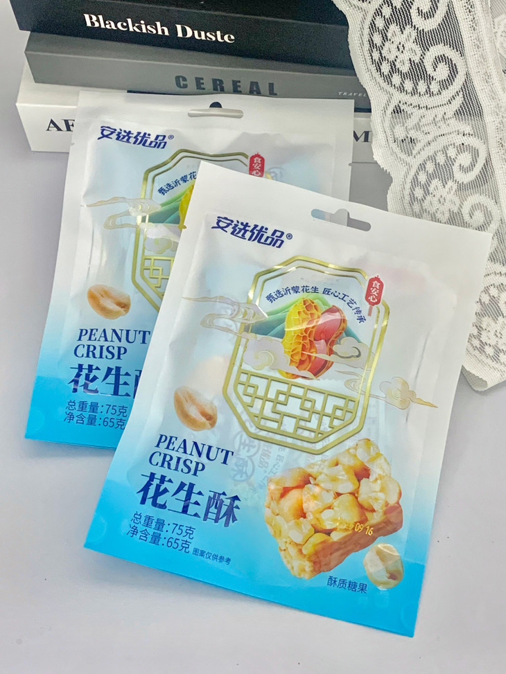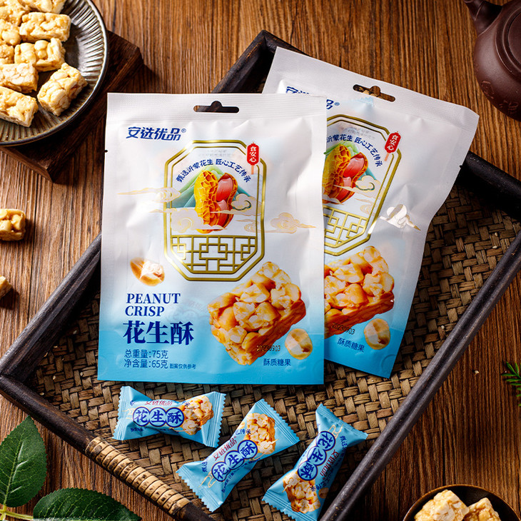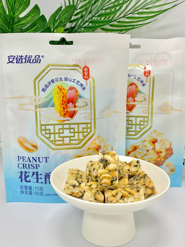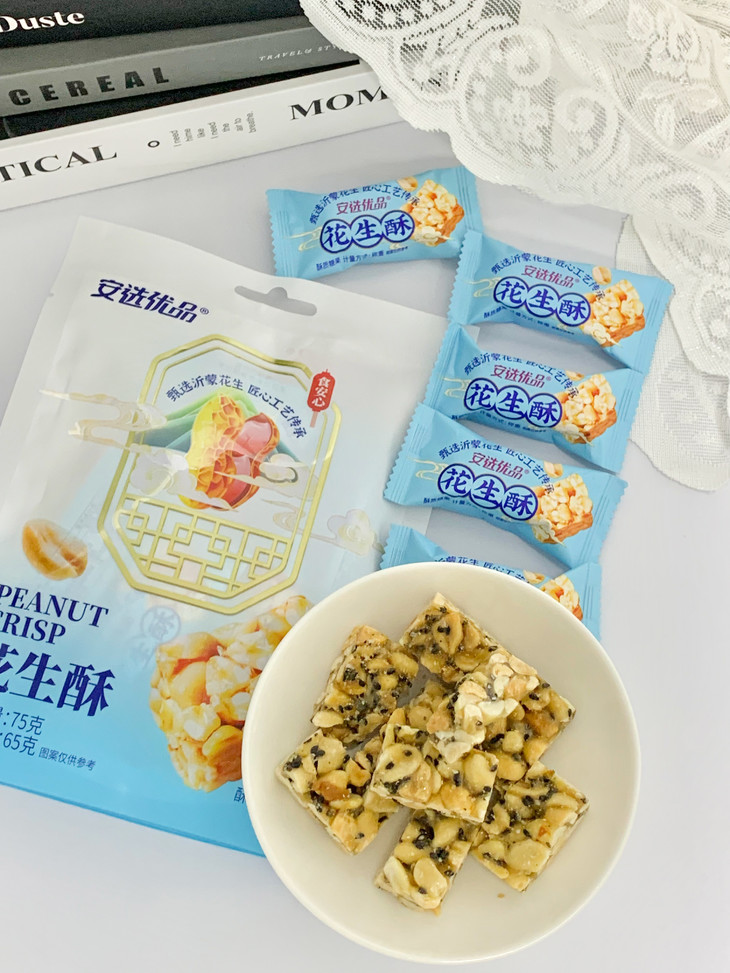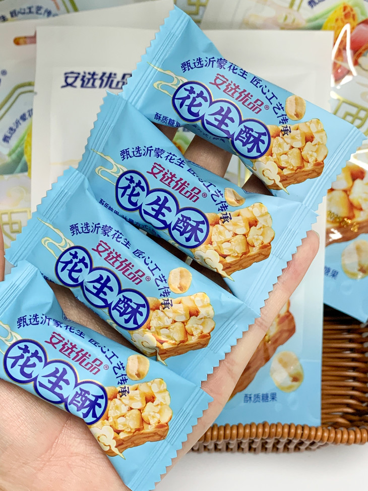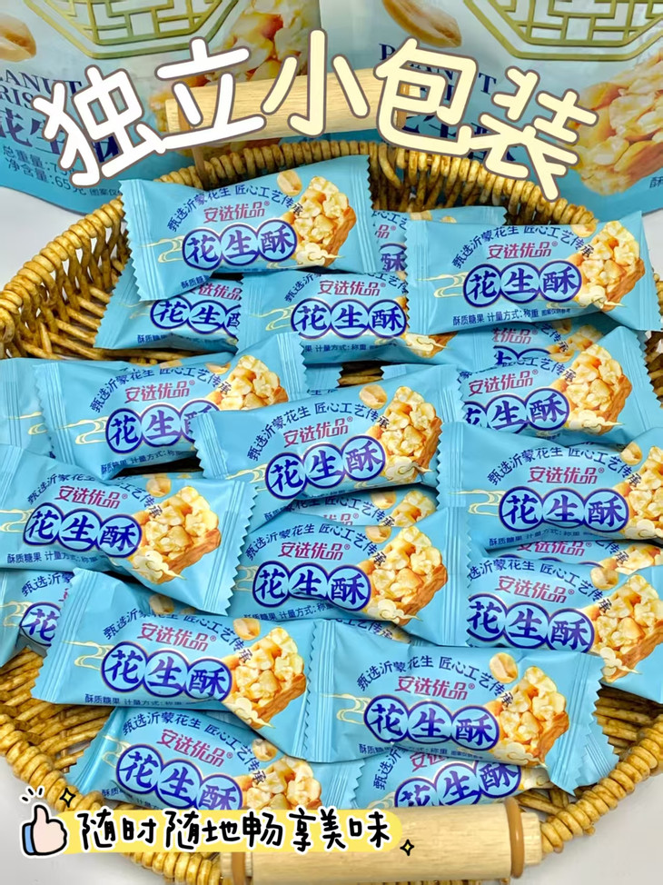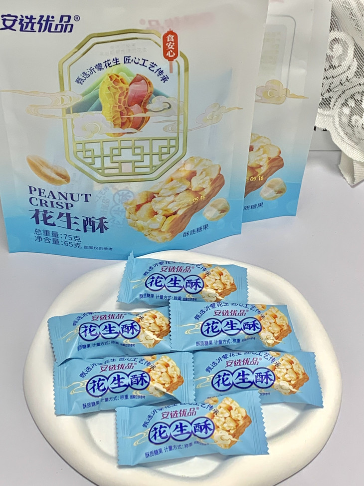 【商品名称】花生酥 【上架规格】65g*5袋 【保质期】9个月 【生产日期】最近 【储存条件】置于阴凉干燥处,避免阳光直射 【发货地】山东临沂 【生产地】山东临沂 【发货快递】四通一达、邮政随机发货 【不发货地区】四川省(凉山、甘孜、阿坝)、新疆、西藏、港澳台 【加运费地区】北京 上海 深圳 广西 云南 四川+1元/件,甘肃 宁夏 青海 内蒙 海南+3元/件 【发货时效】72小时 【售后规则】 1、食品类不支持7天无理由退换货,不支持拦截拒收 2:若收到产品有质量问题或者破损少件,请签收24小时内对产品拍照+快递箱面单照片联系售后处理 3:个人喜好/口味问题不在售后范围内