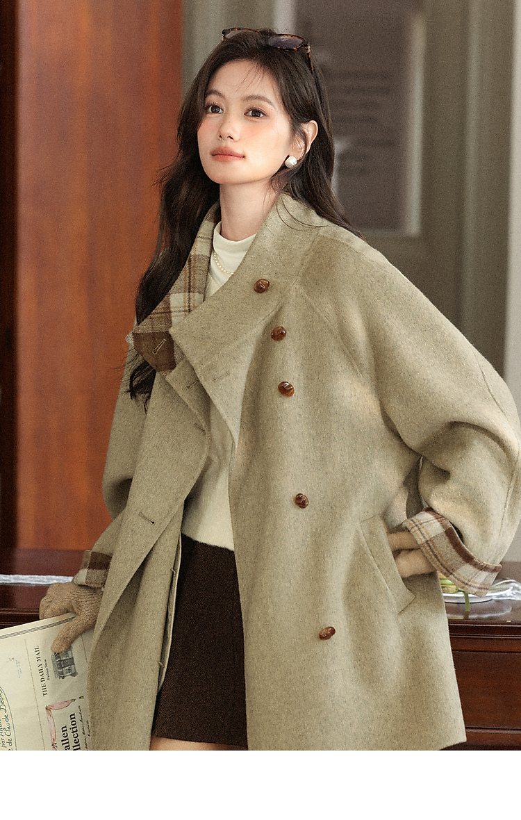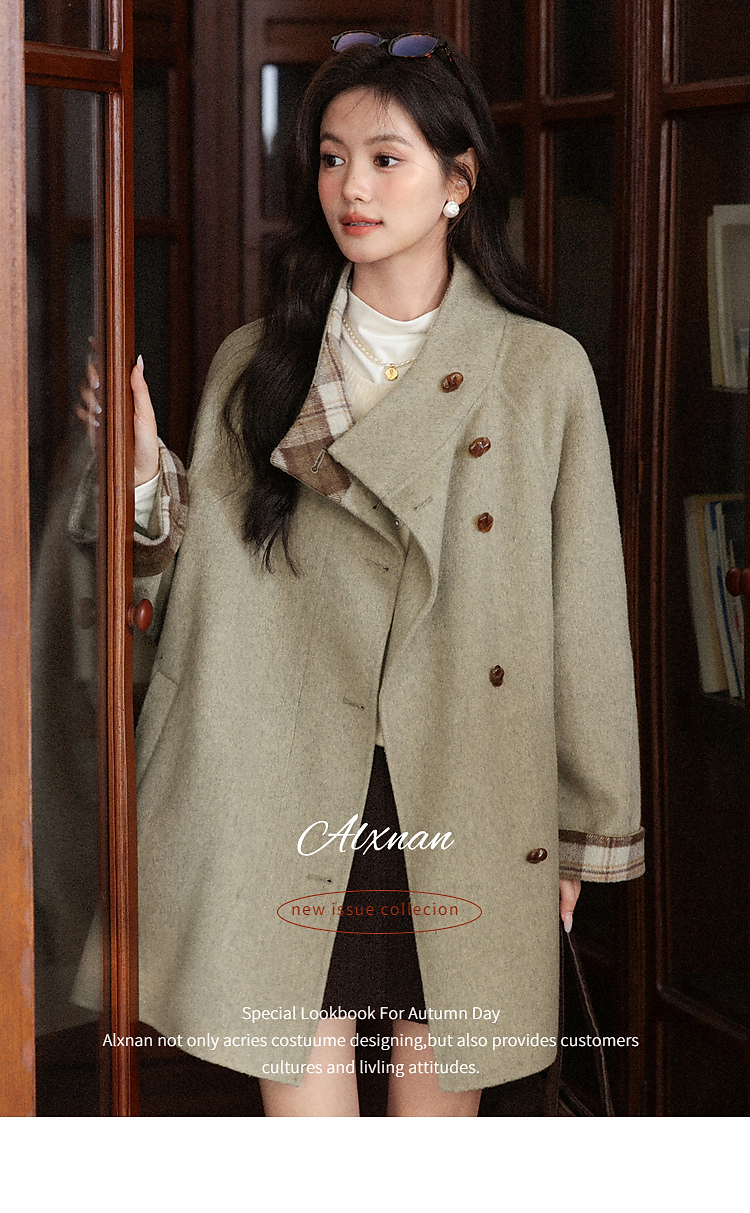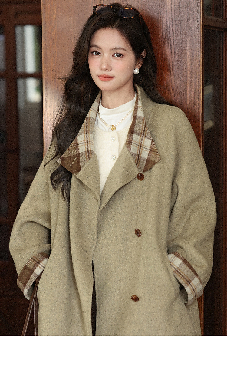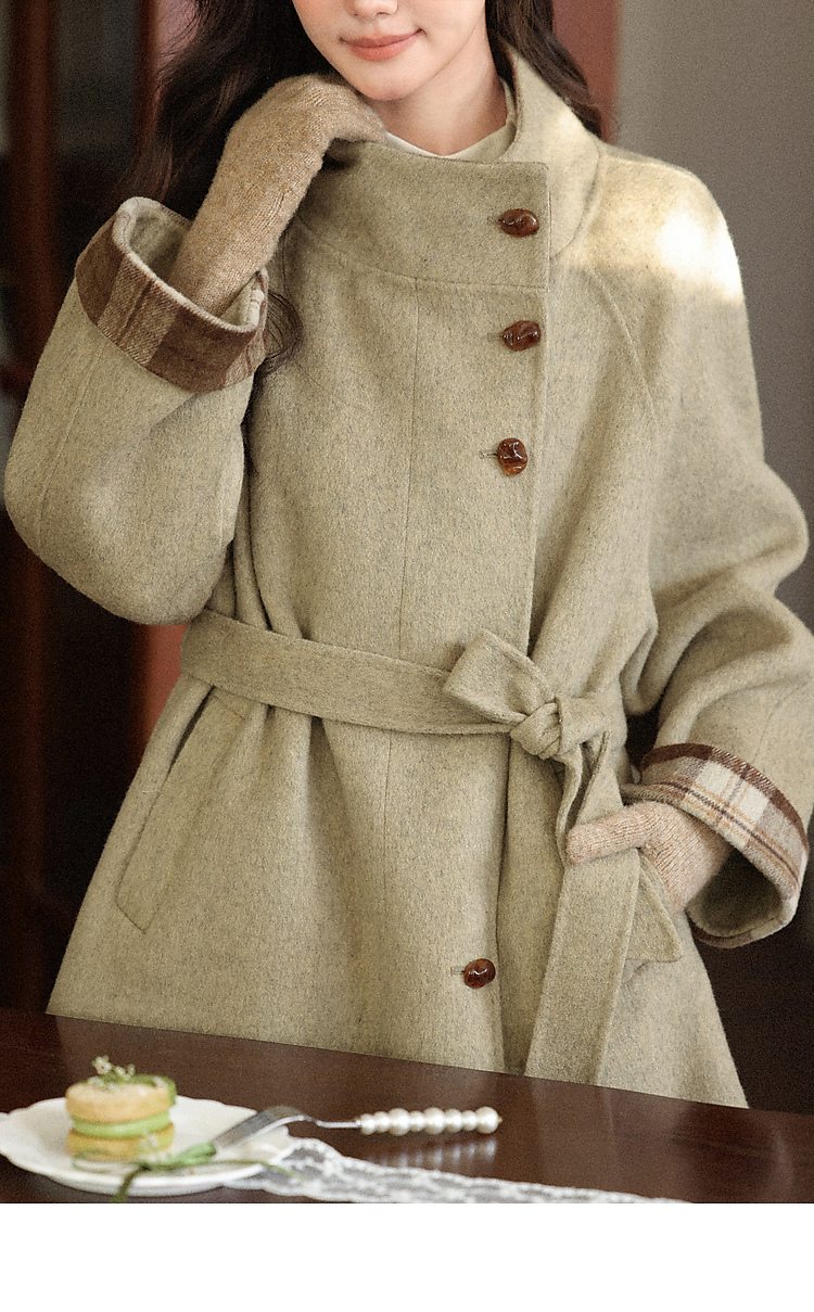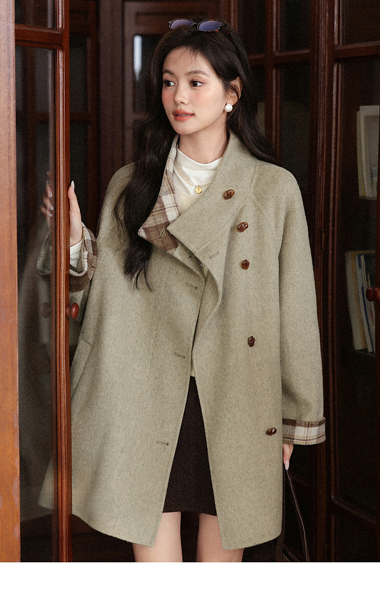 鹿向南「橡果森林」绿色毛呢外套女秋冬新款高级感宽松中长款大衣