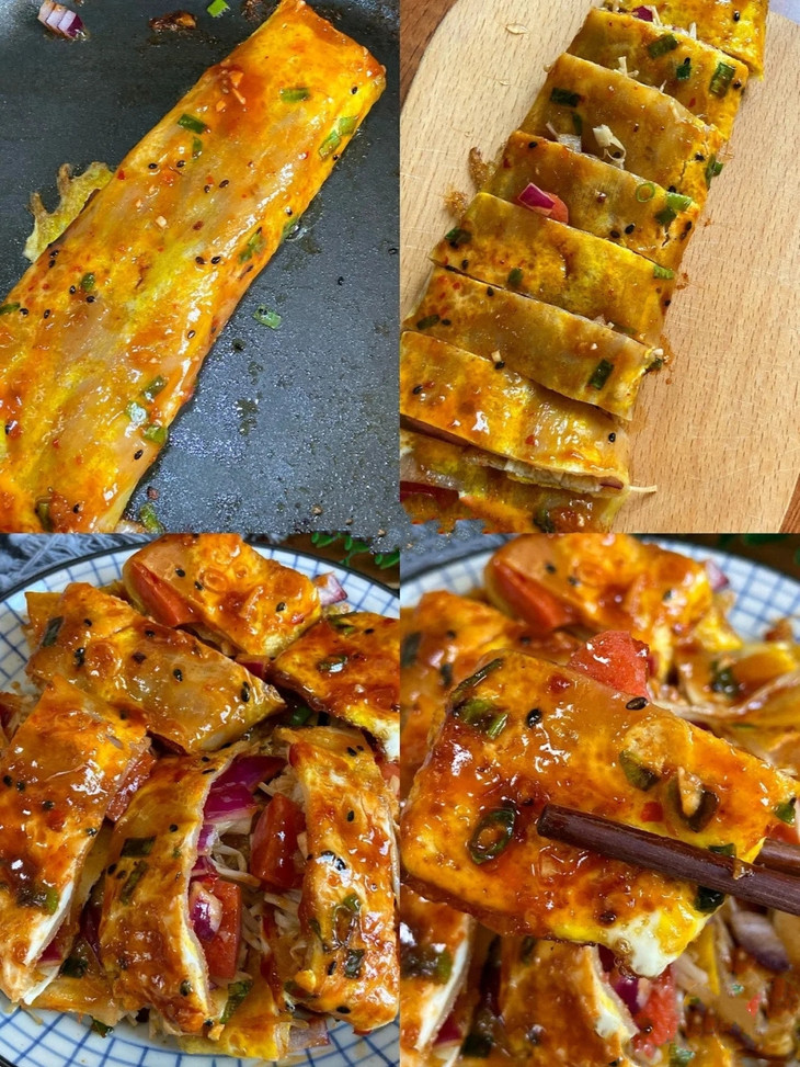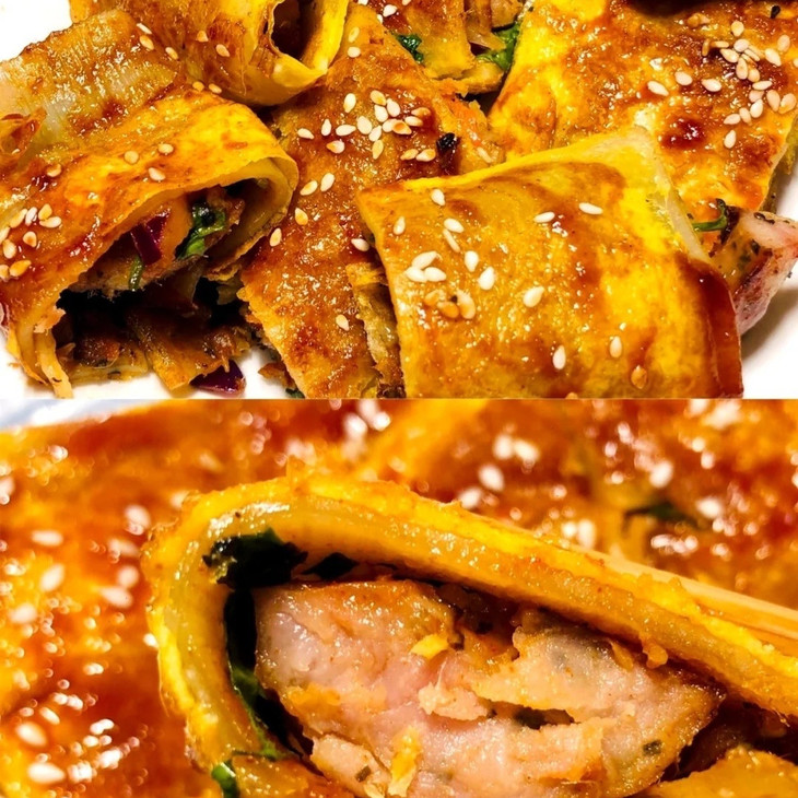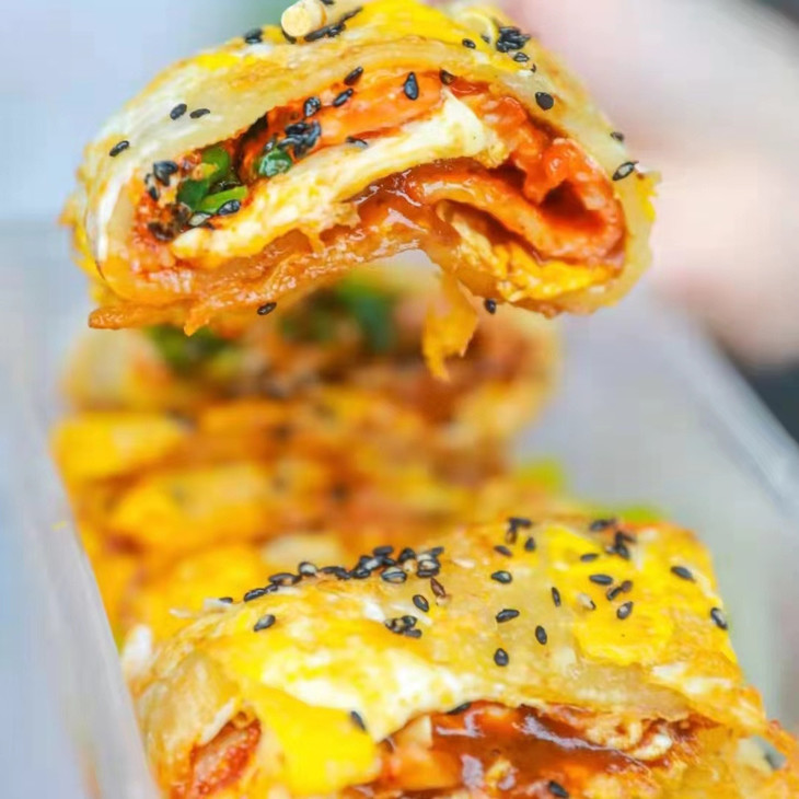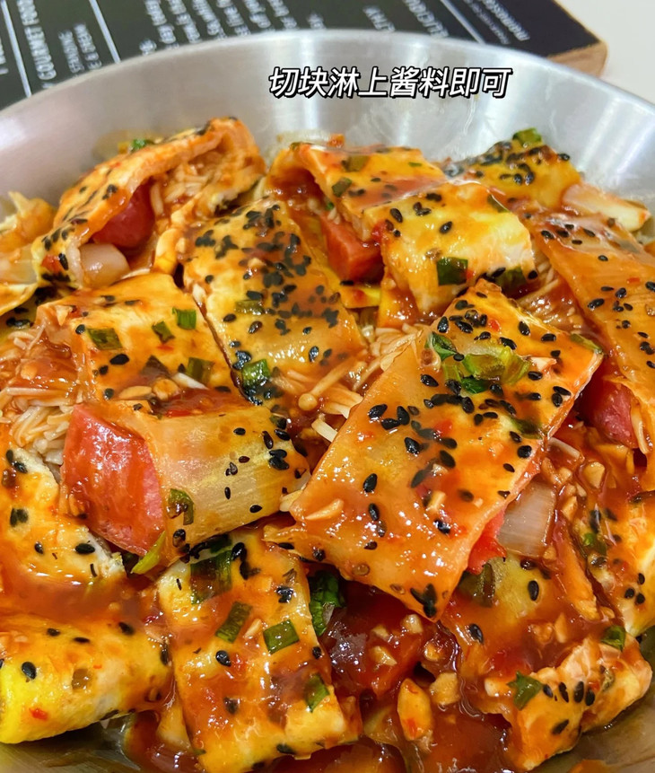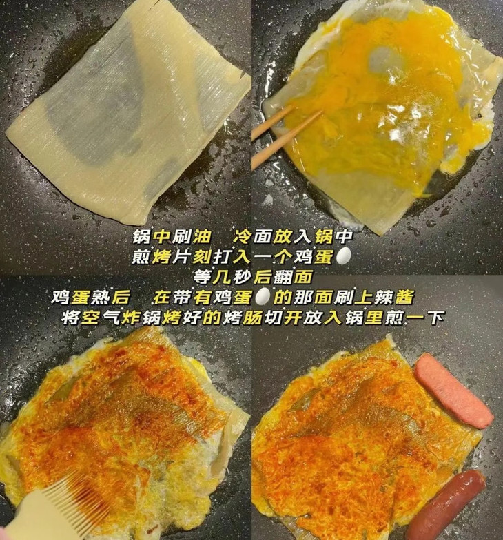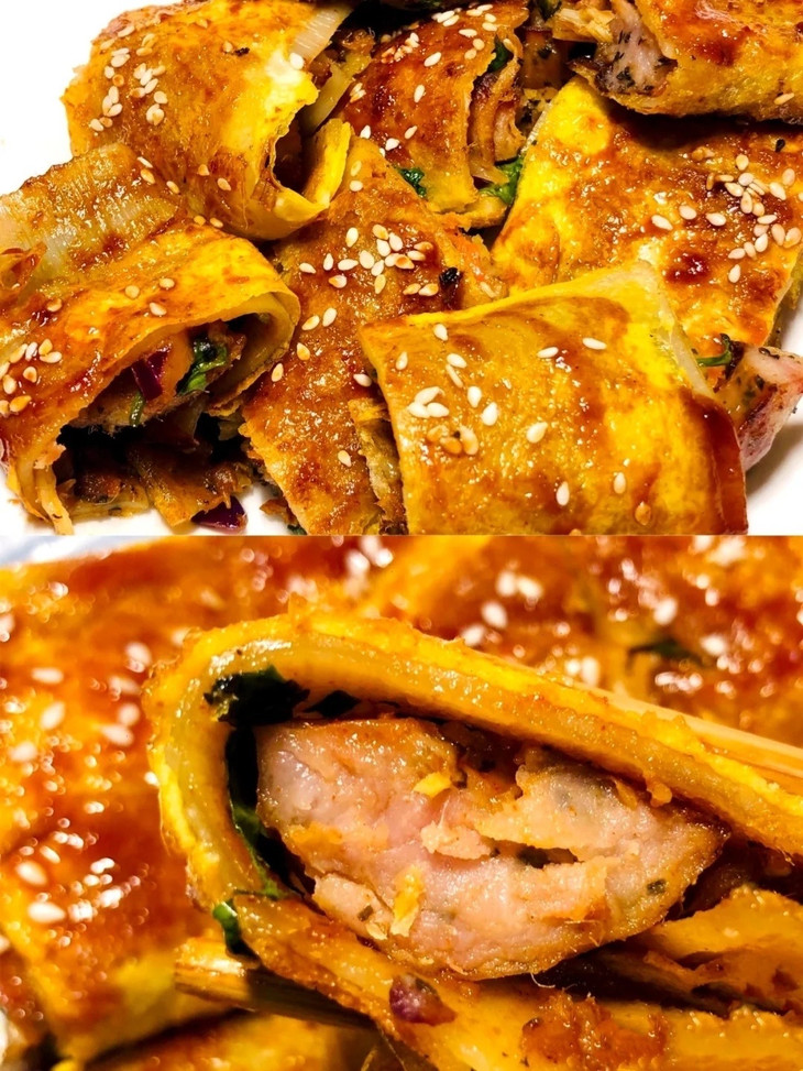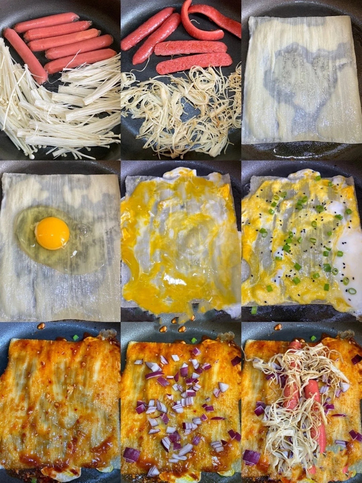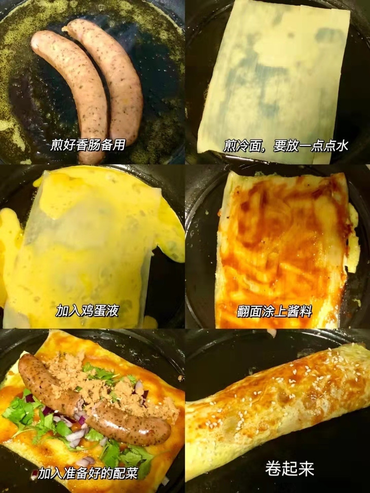 🉑️食材 奥斯托马烤冷面、洋葱、香菜、香肠、肉松、蟹肉棒、鸡蛋、白芝麻、大蒜(可根据自己喜好添加) 🉑️做法 ①洋葱、香菜、大蒜切成碎,准备好酱料 ②煎好香肠和蟹肉棒 3 油锅煎面皮,要往锅里加一点点水,加入鸡蛋液,煎一会等鸡蛋液差不多凝固了就翻面,刷上酱料 ④加入准备好的配菜,卷起来,再煎一会会,出锅!