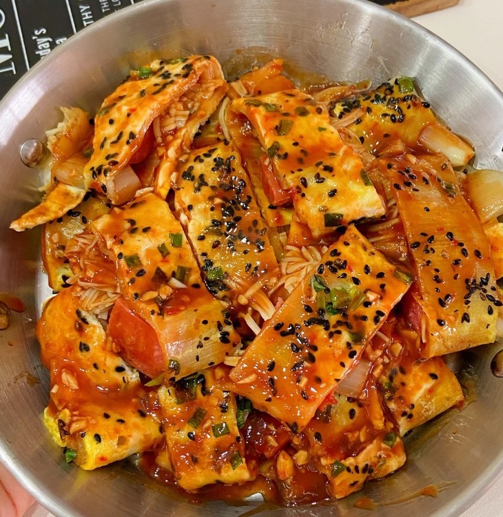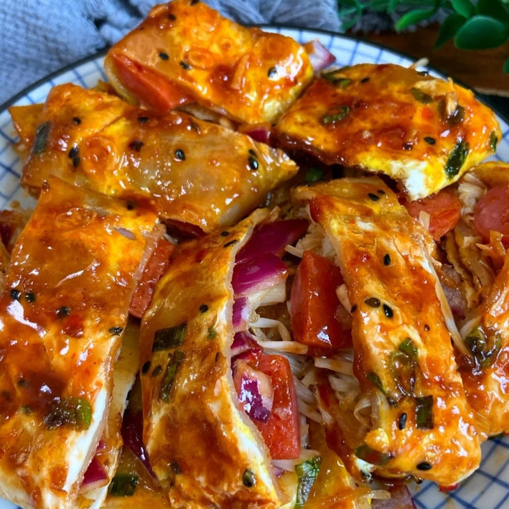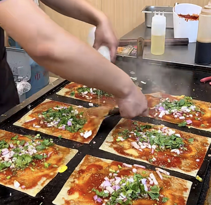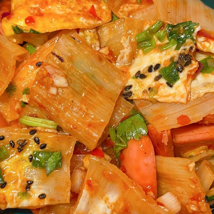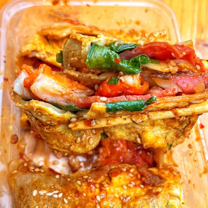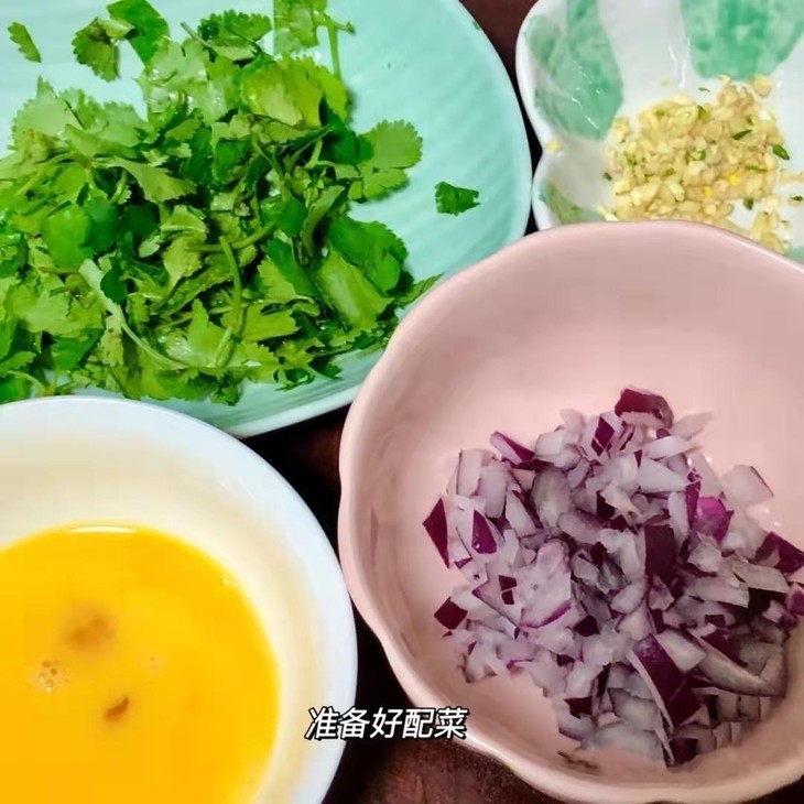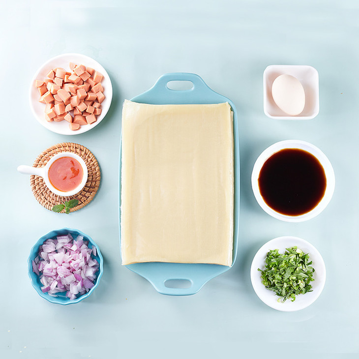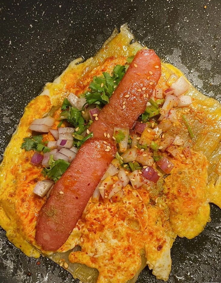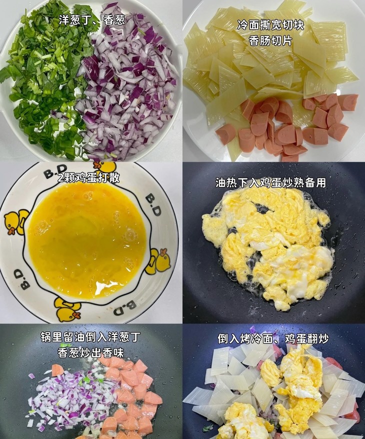 🉑️食材 奥斯托马烤冷面、洋葱、香菜、香肠、肉松、蟹肉棒、鸡蛋、白芝麻、大蒜(可根据自己喜好添加) 🉑️做法 ①洋葱、香菜、大蒜切成碎,准备好酱料 ②煎好香肠和蟹肉棒 3 油锅煎面皮,要往锅里加一点点水,加入鸡蛋液,煎一会等鸡蛋液差不多凝固了就翻面,刷上酱料 ④加入准备好的配菜,卷起来,再煎一会会,出锅!