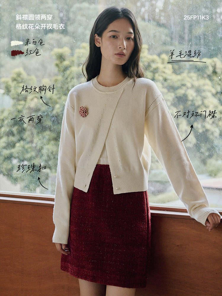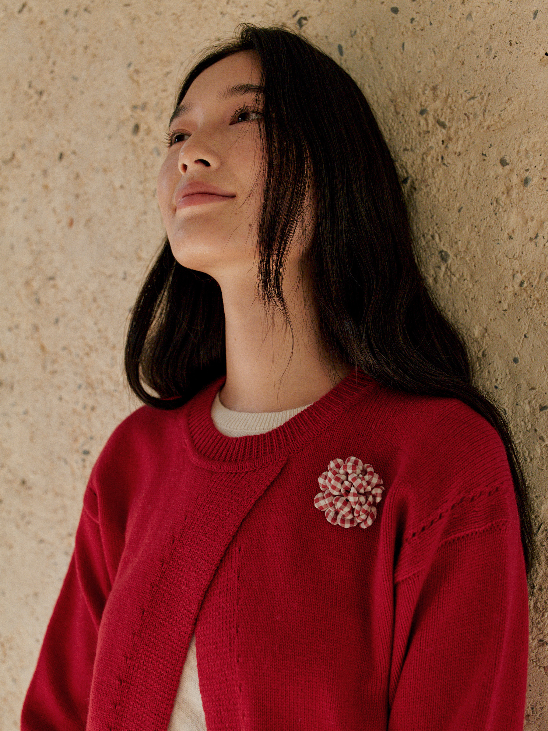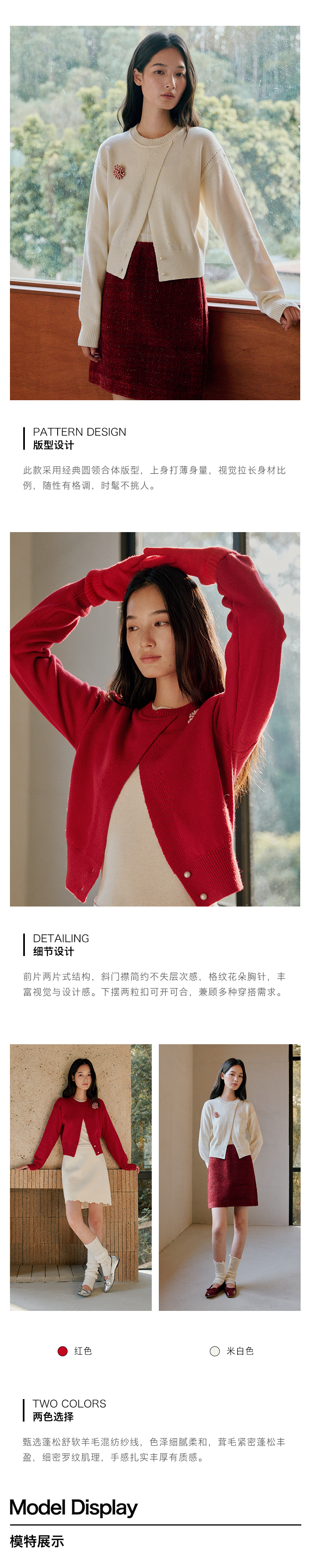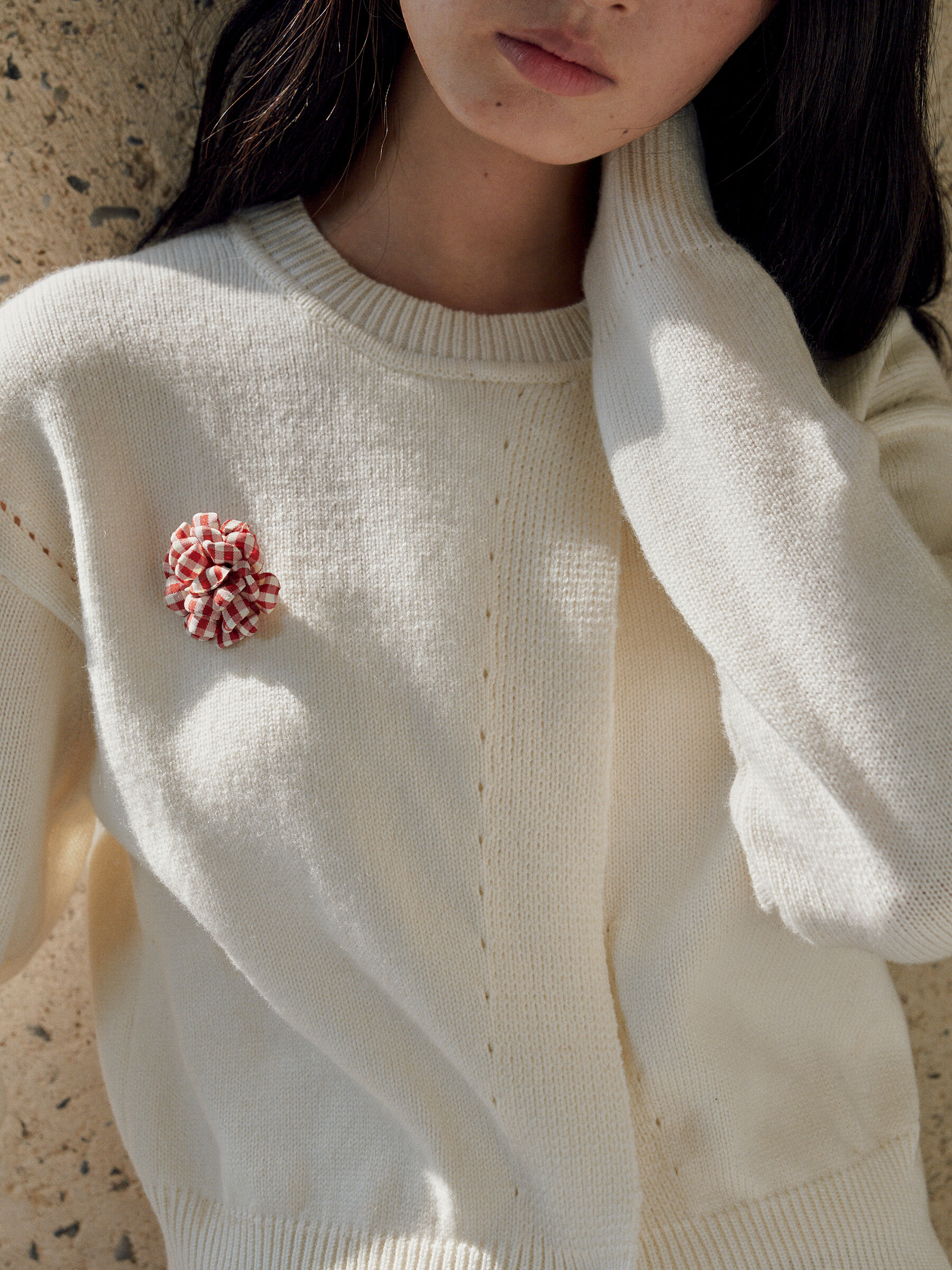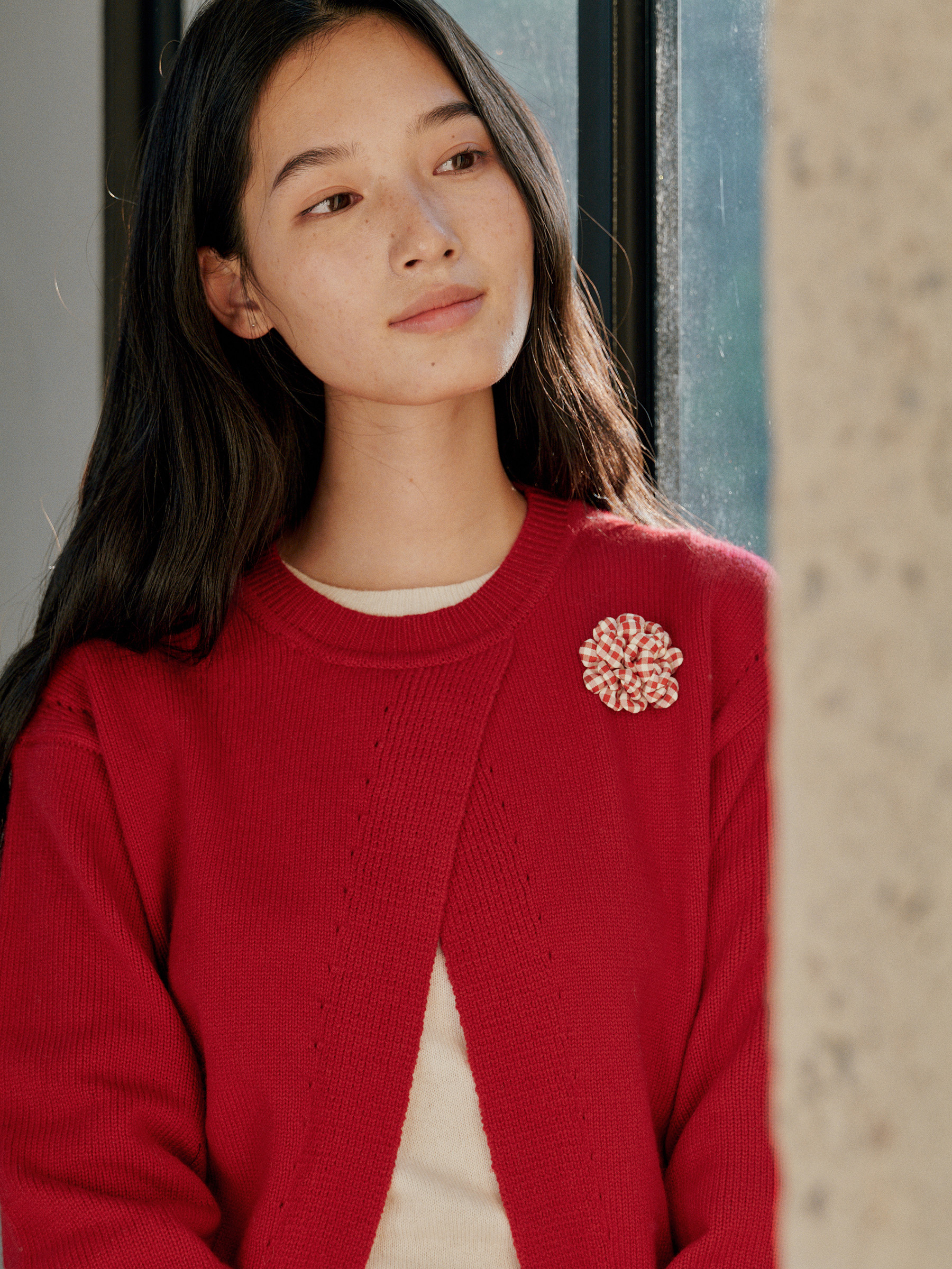 ForPoem 25/FW 原创设计斜襟圆领红白格纹花朵胸针两穿羊毛针织衫