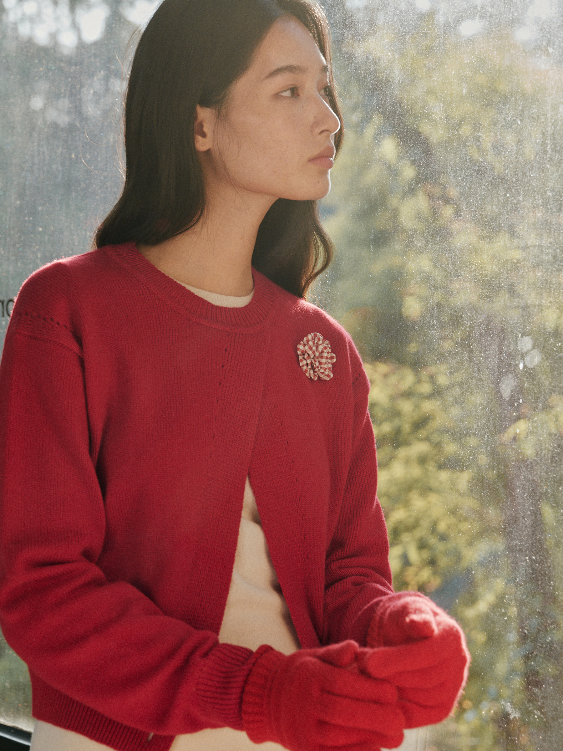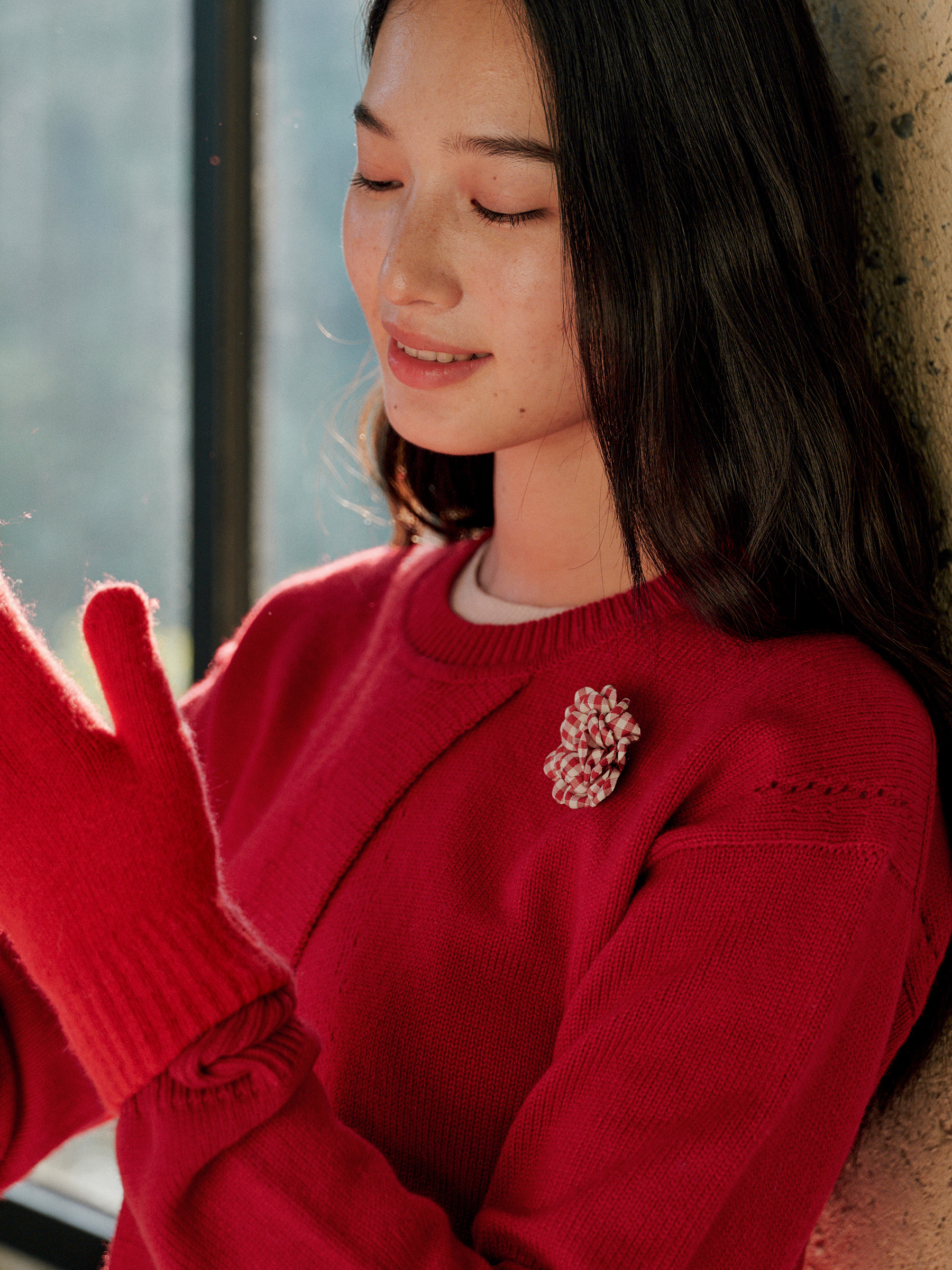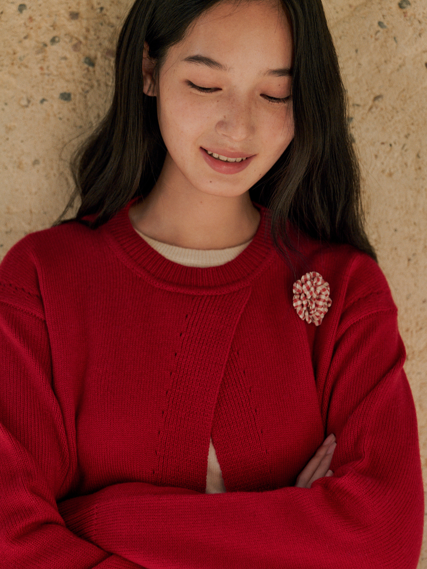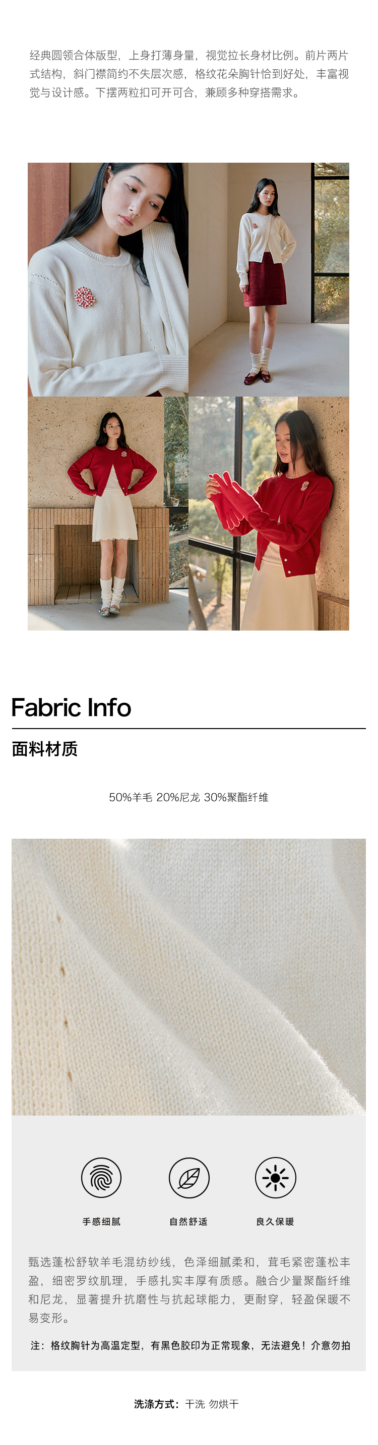 ForPoem 25/FW 原创设计斜襟圆领红白格纹花朵胸针两穿羊毛针织衫