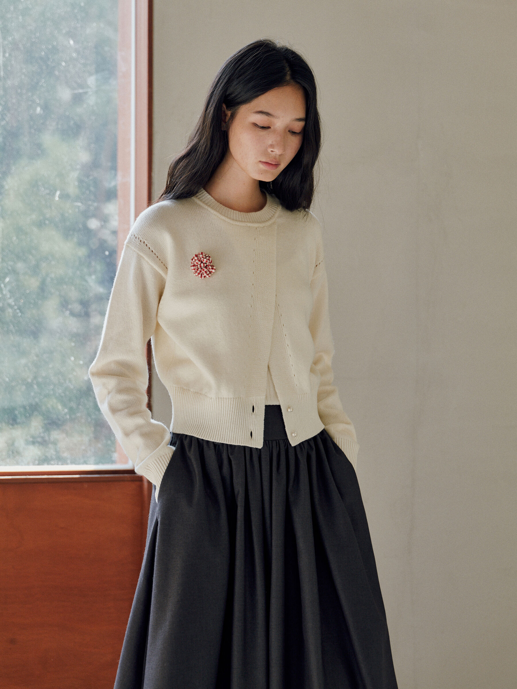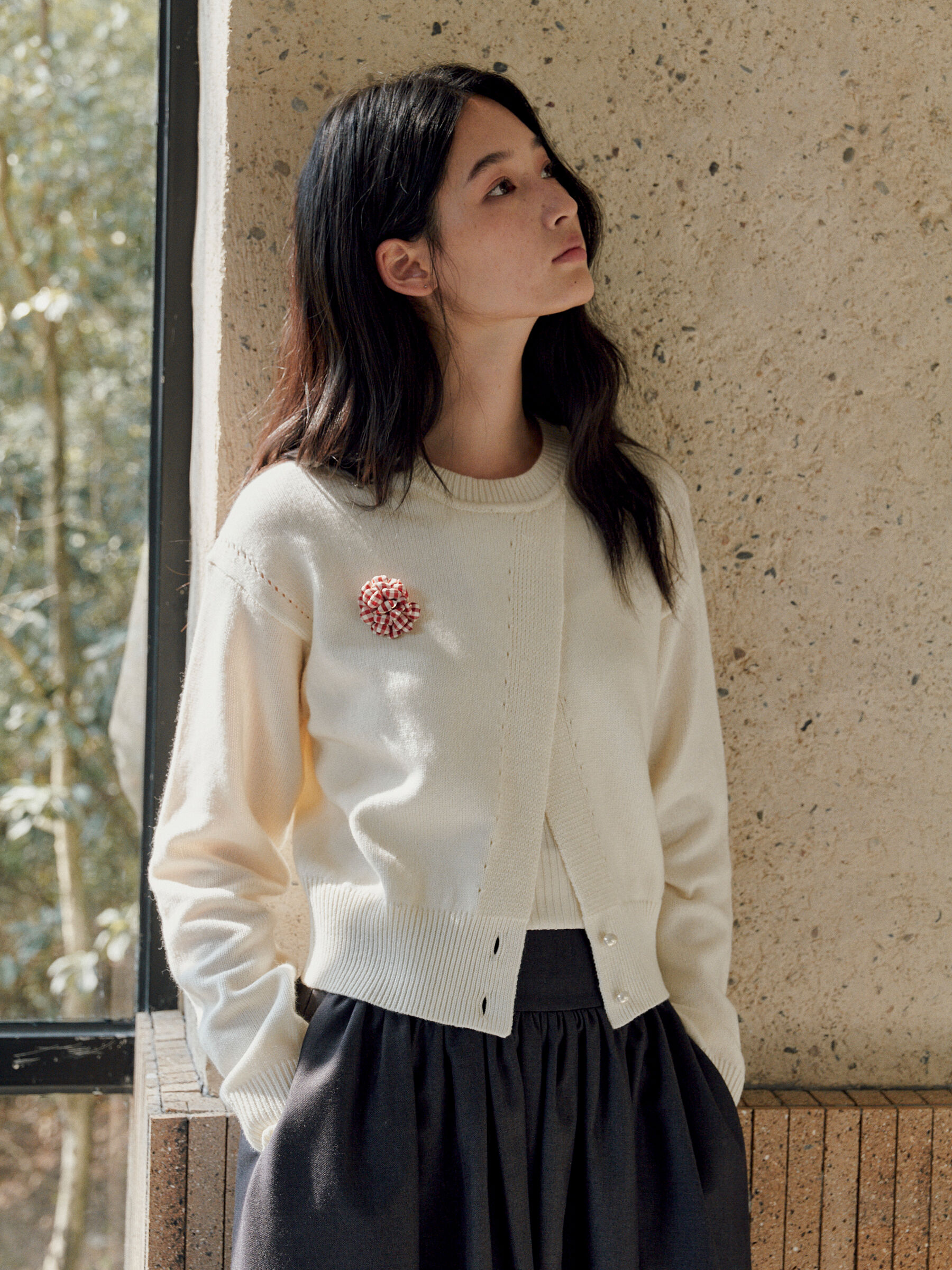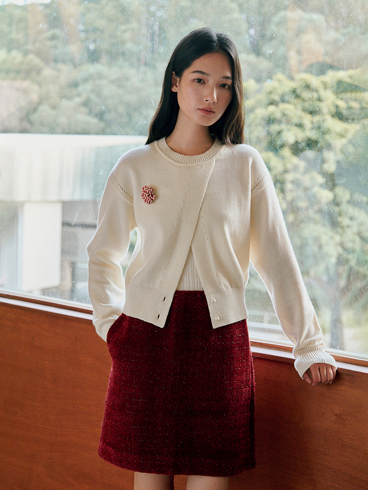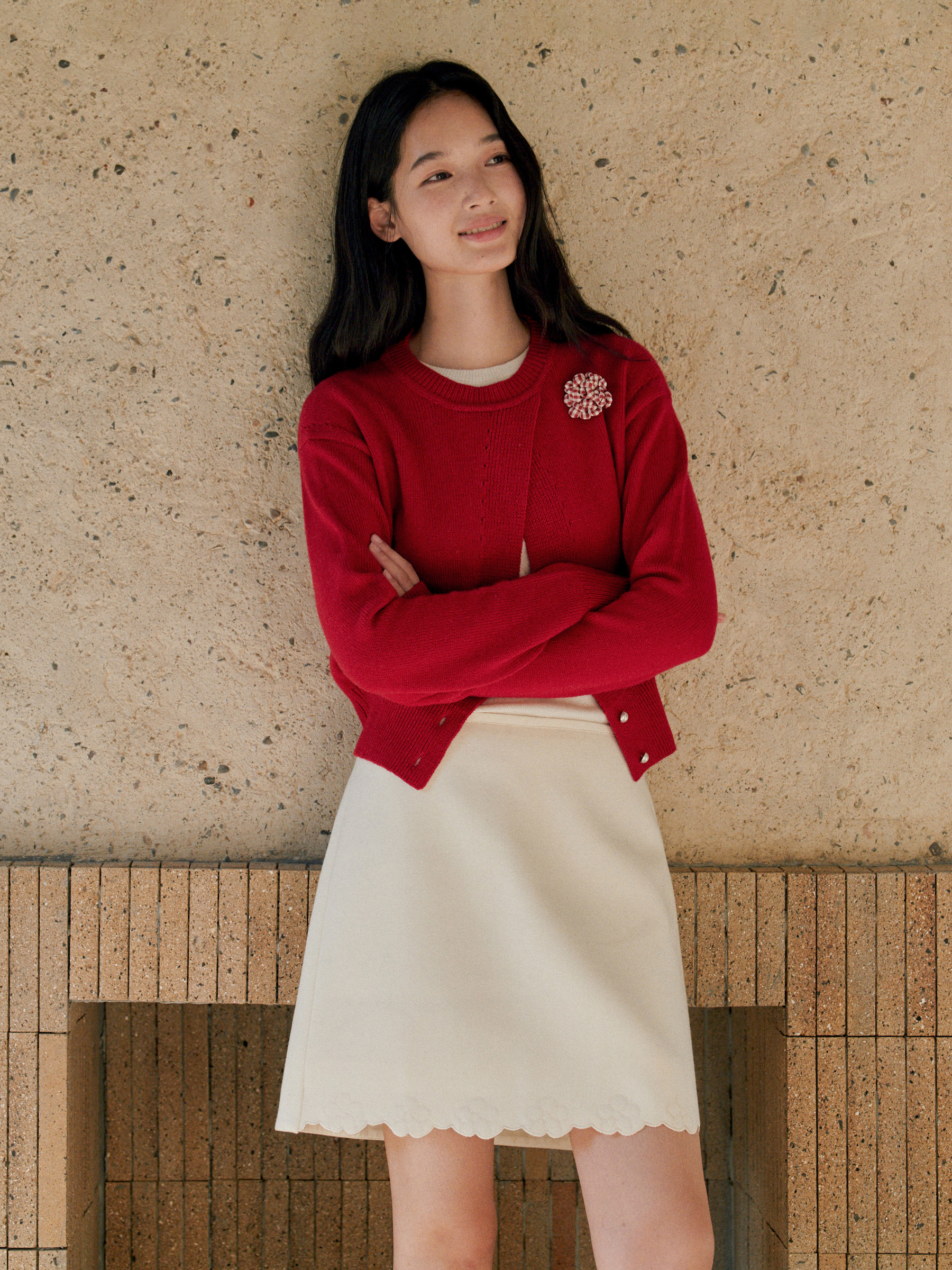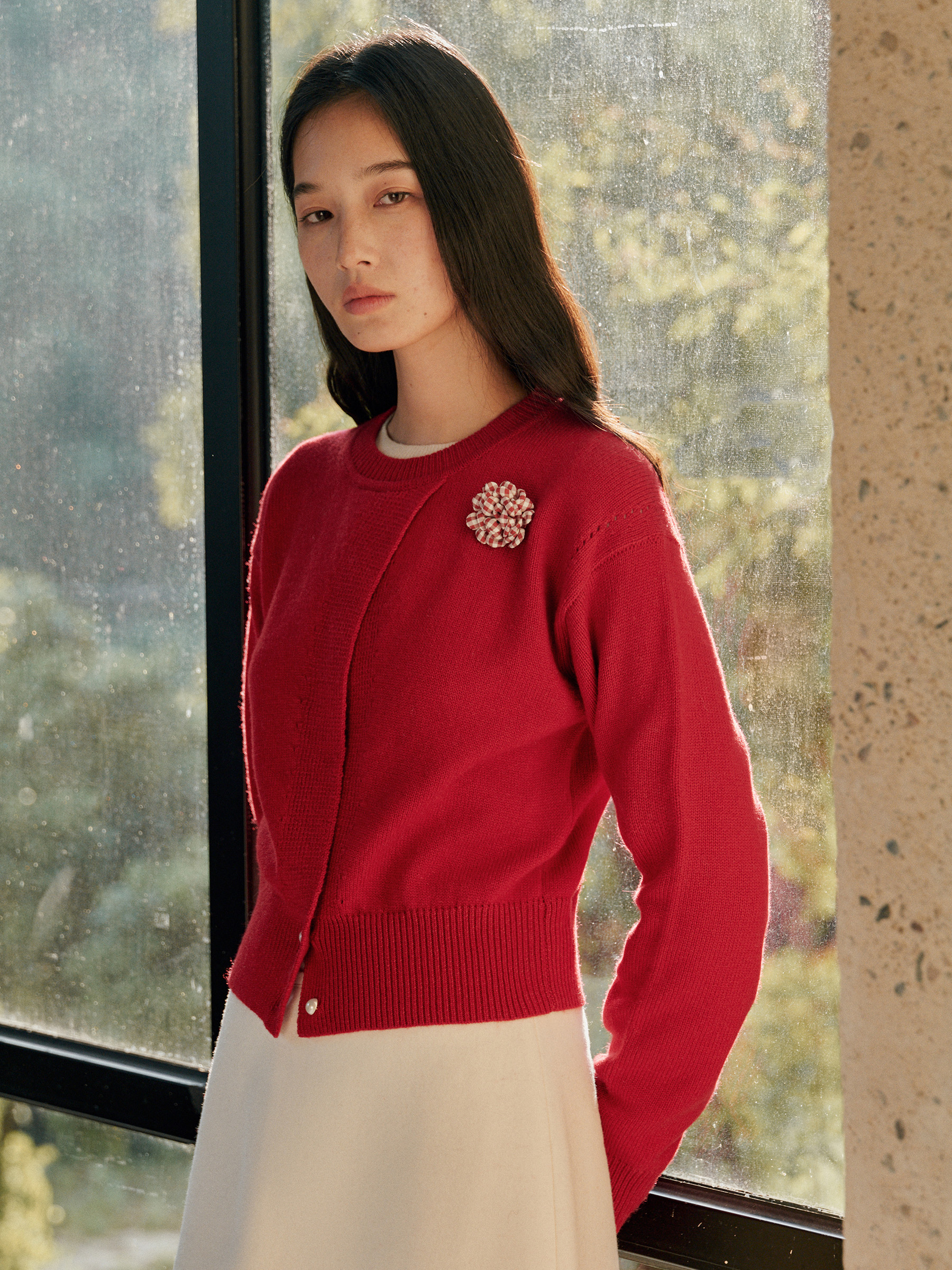 ForPoem 25/FW 原创设计斜襟圆领红白格纹花朵胸针两穿羊毛针织衫