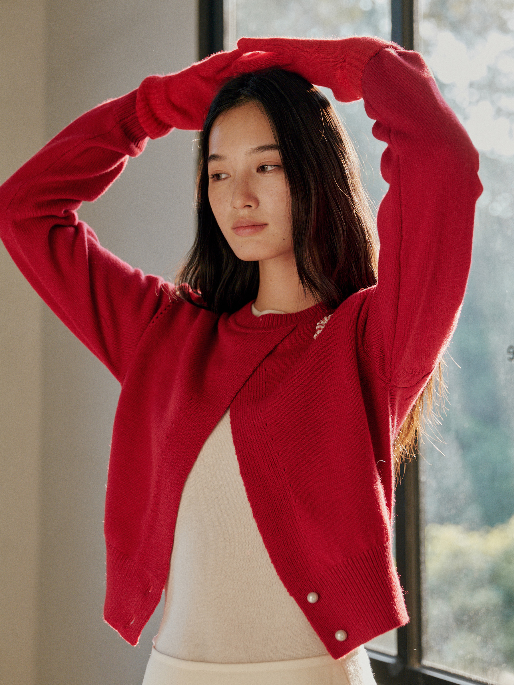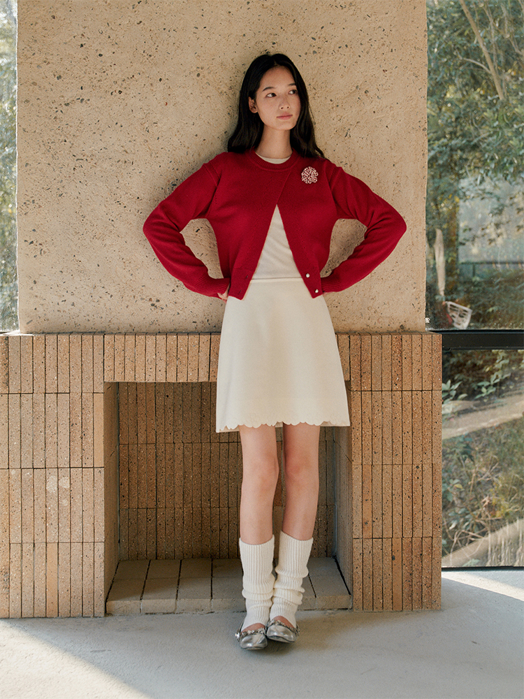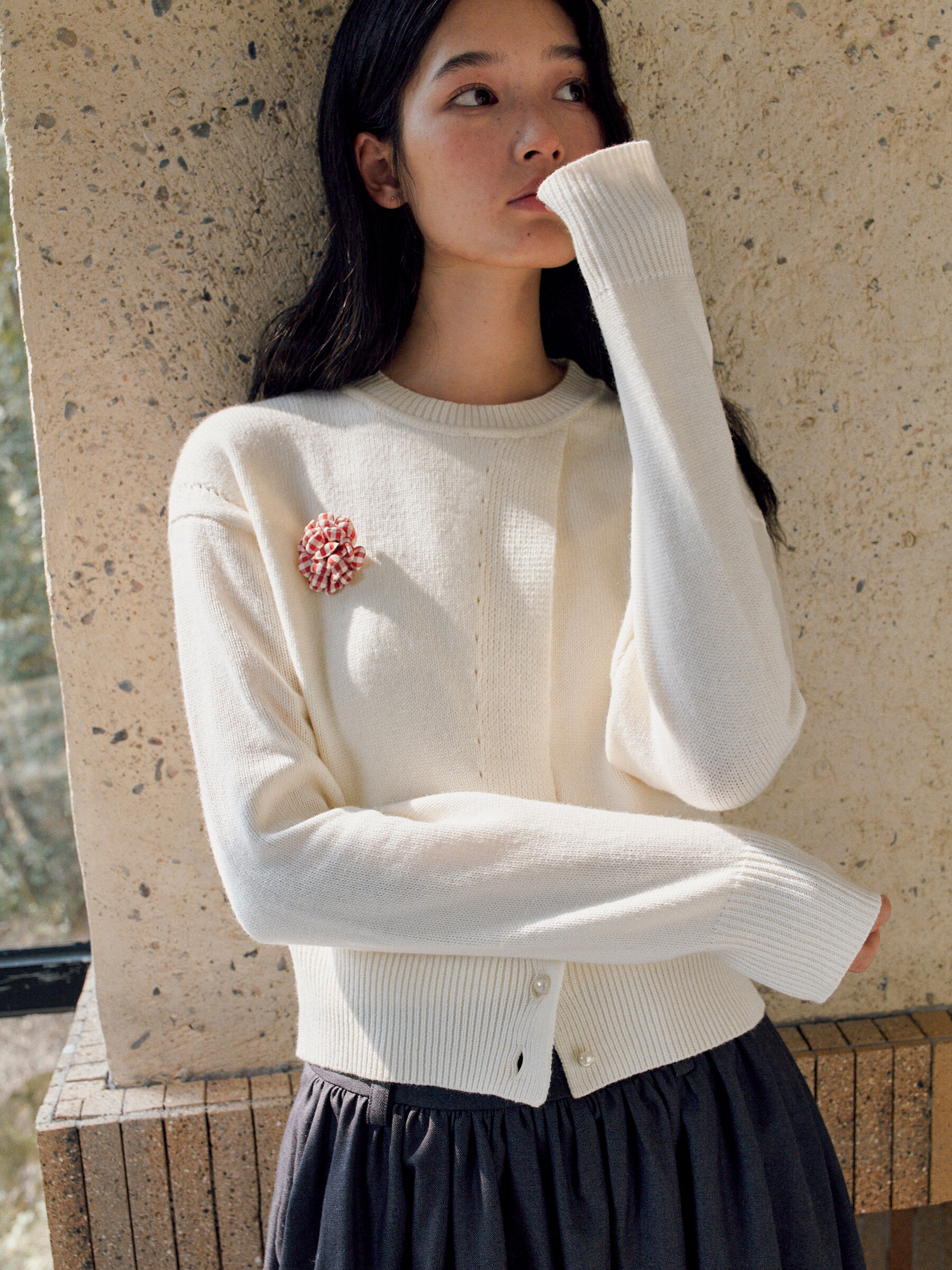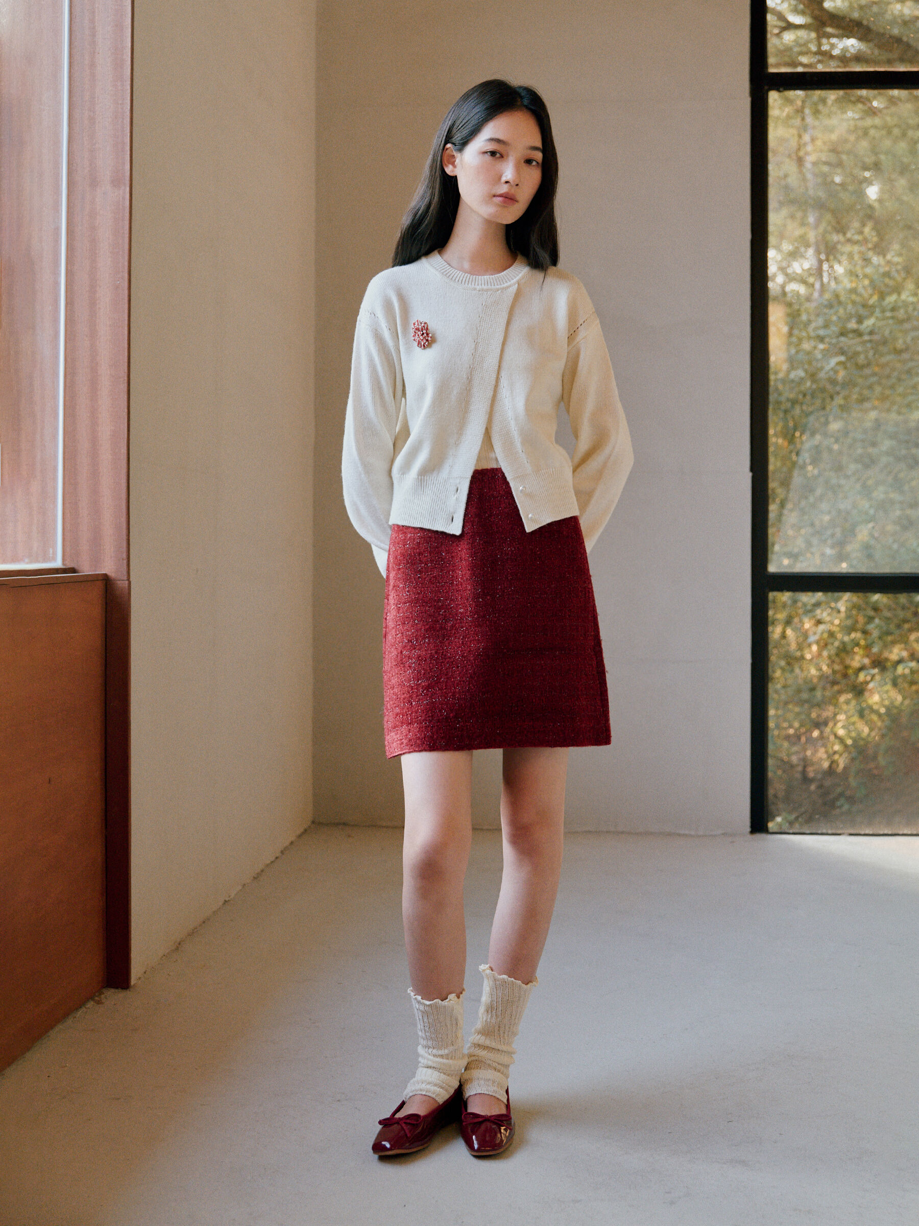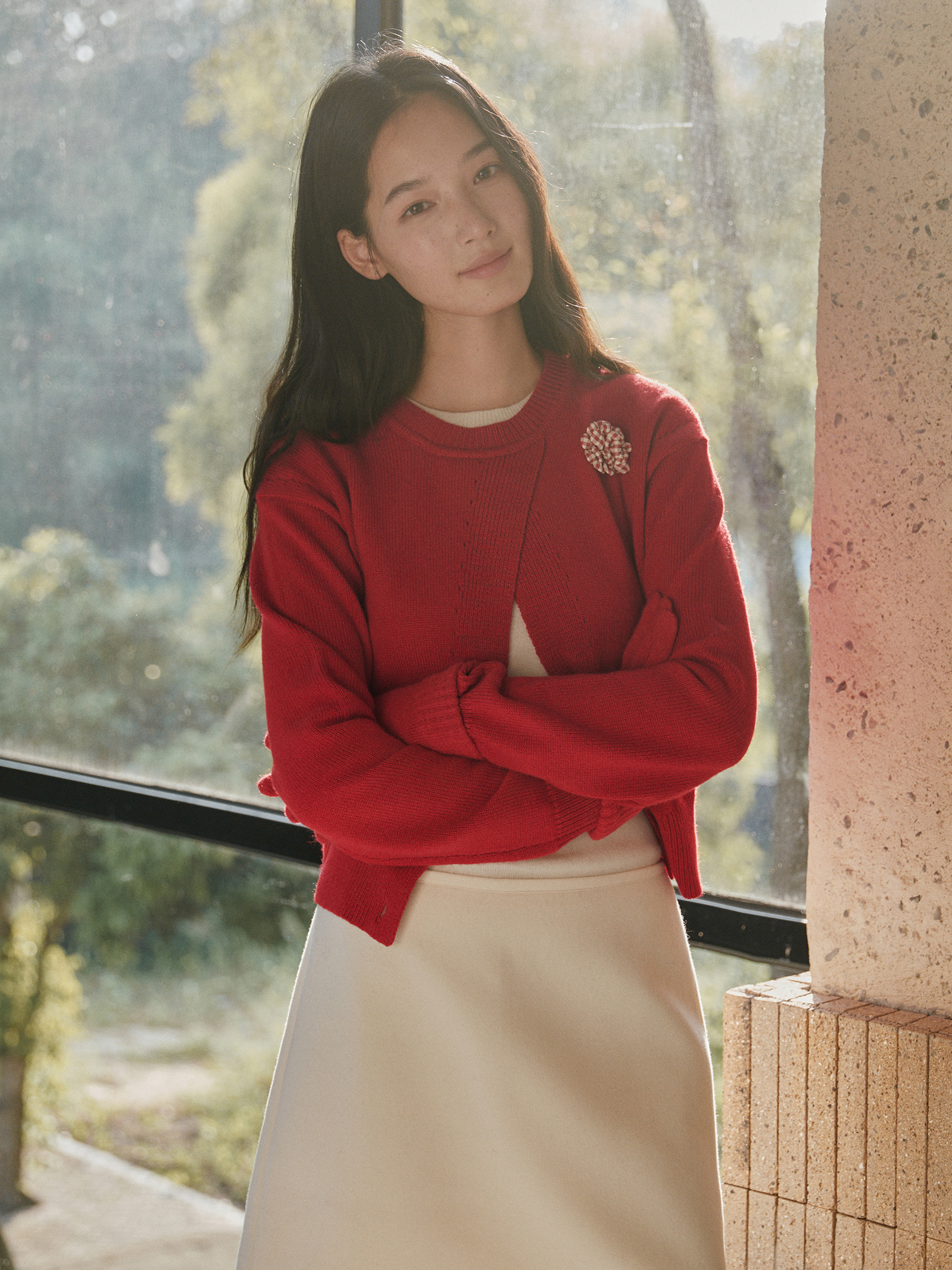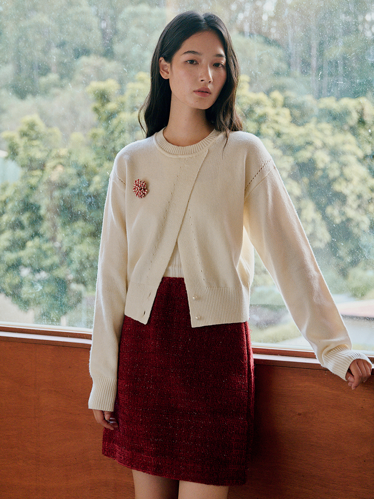 ForPoem 25/FW 原创设计斜襟圆领红白格纹花朵胸针两穿羊毛针织衫