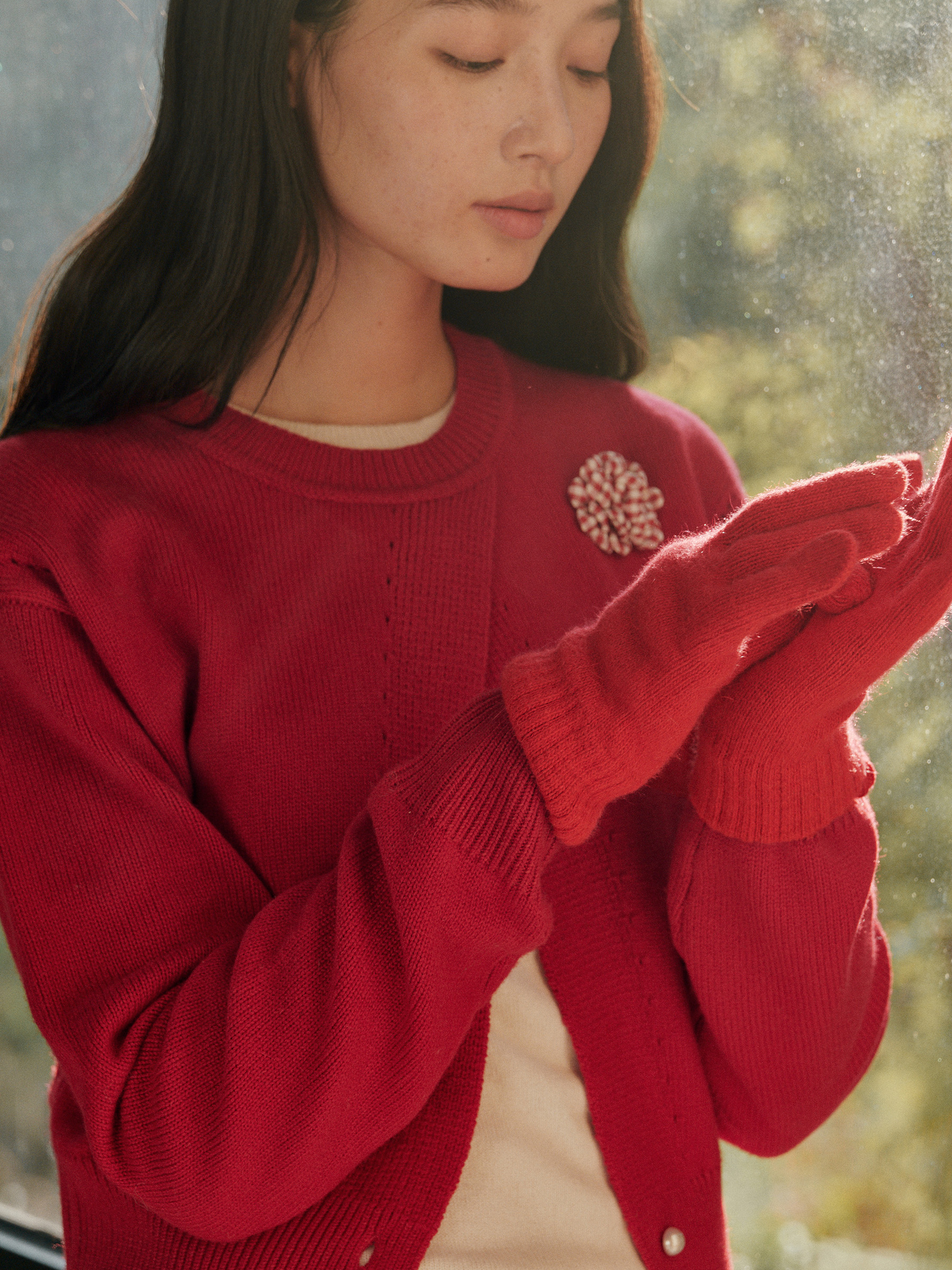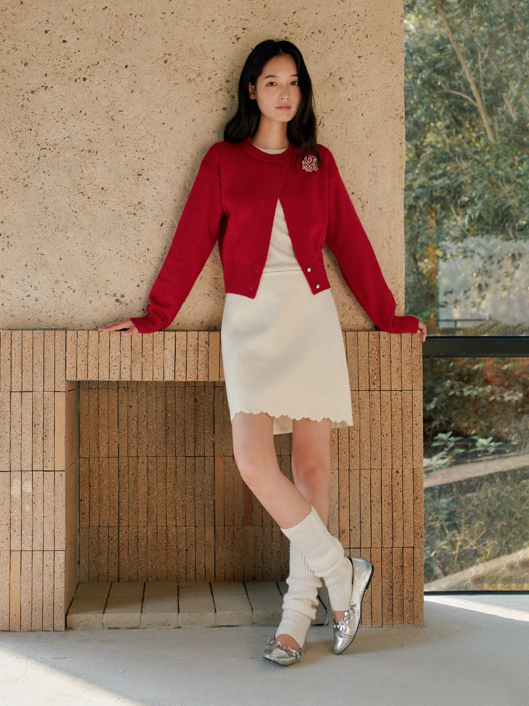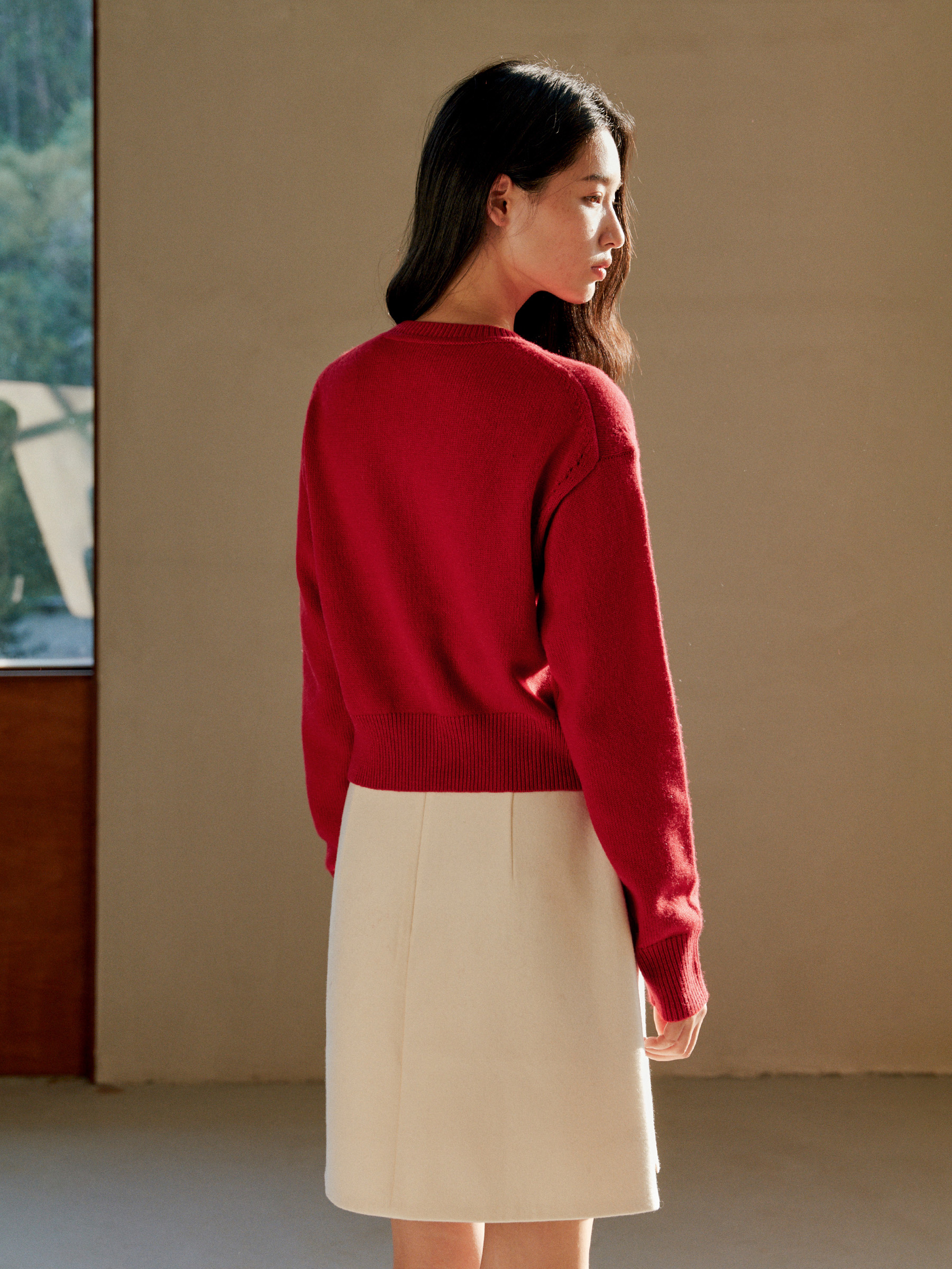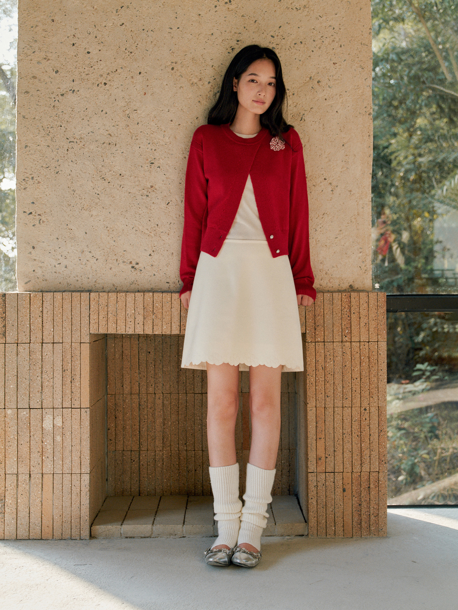 ForPoem 25/FW 原创设计斜襟圆领红白格纹花朵胸针两穿羊毛针织衫