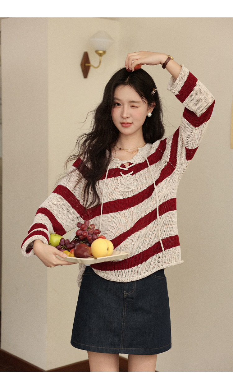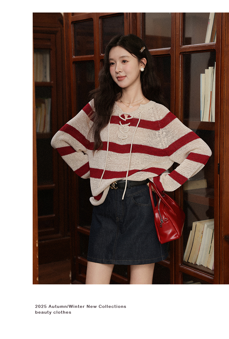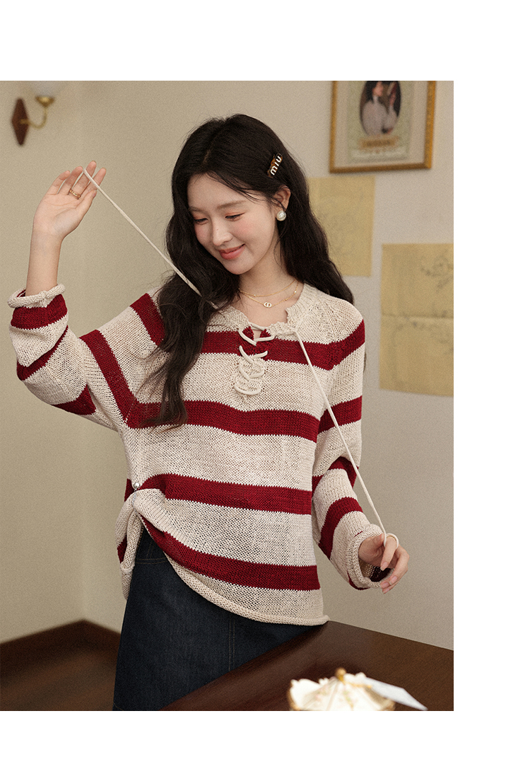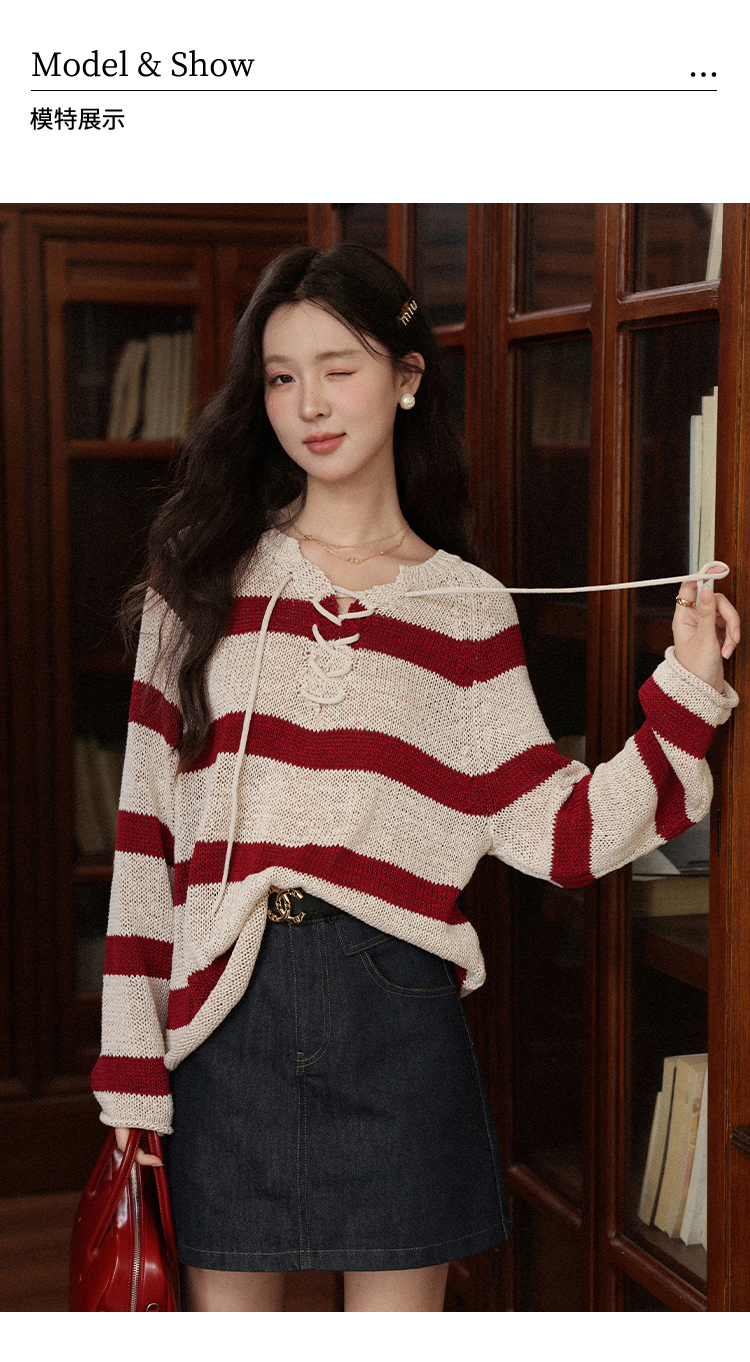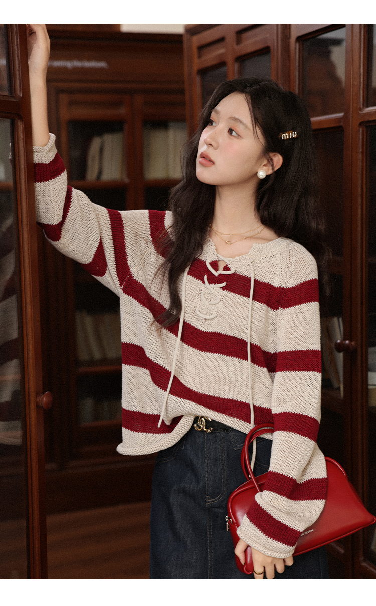 鹿向南「复古元素」复古红色镂空条纹针织衫女初秋慵懒风长袖上衣