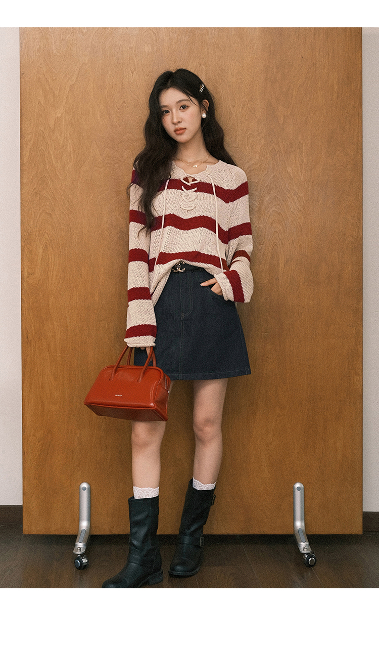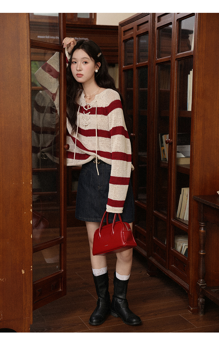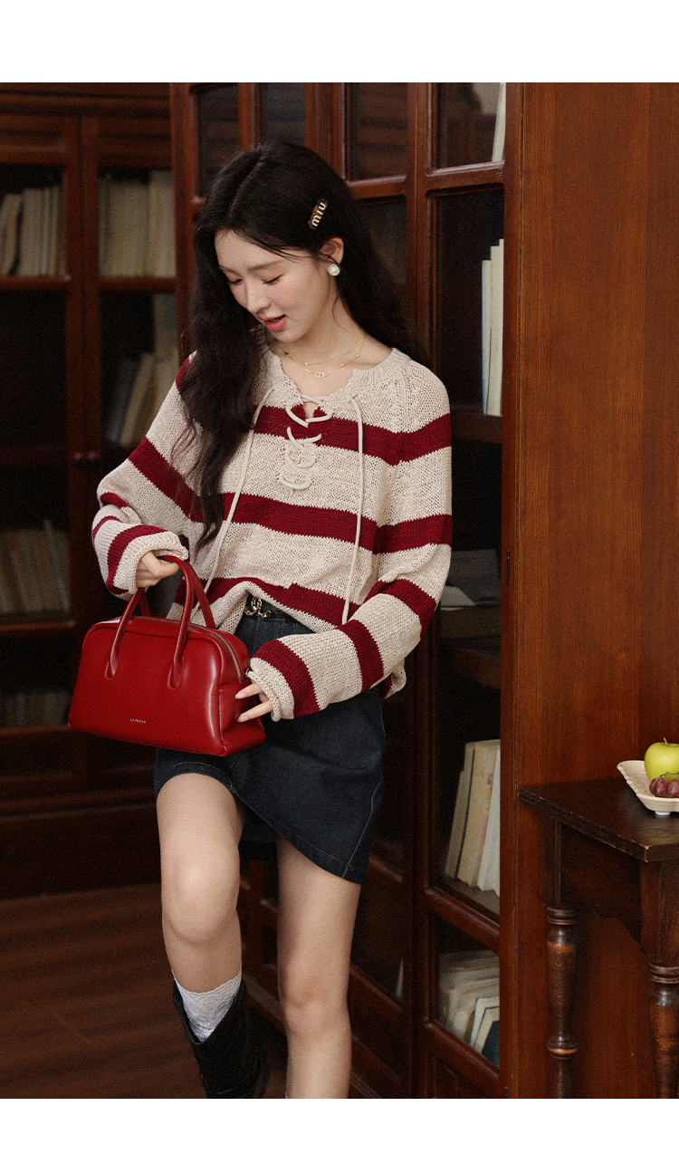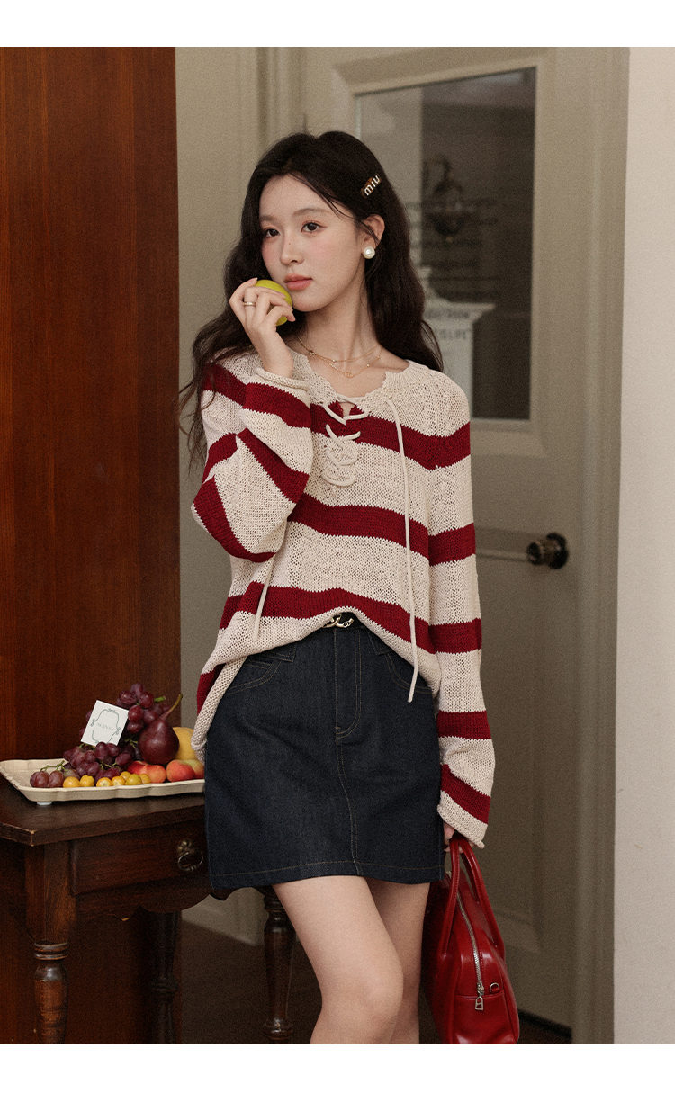 鹿向南「复古元素」复古红色镂空条纹针织衫女初秋慵懒风长袖上衣