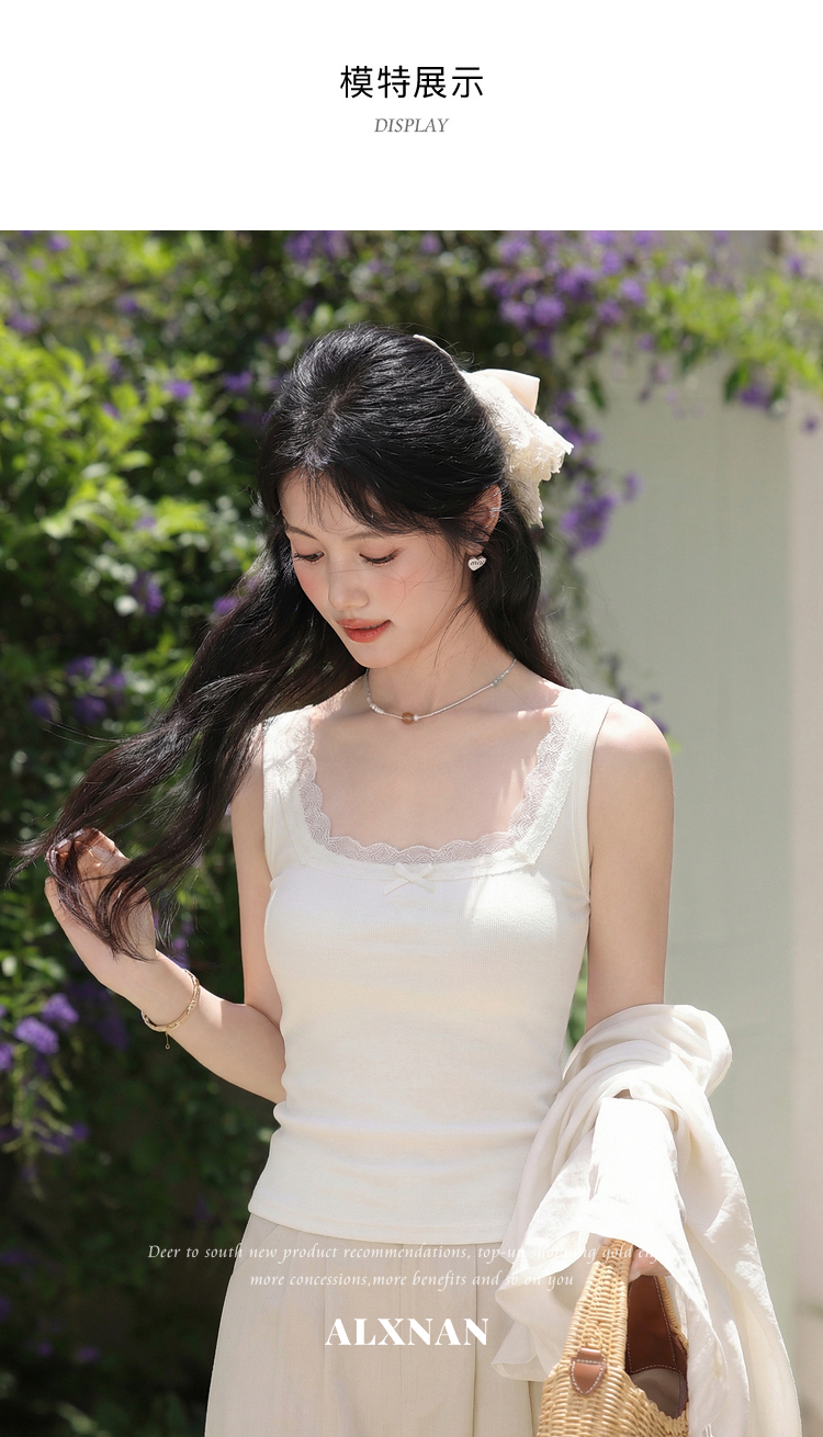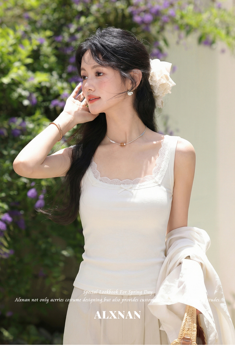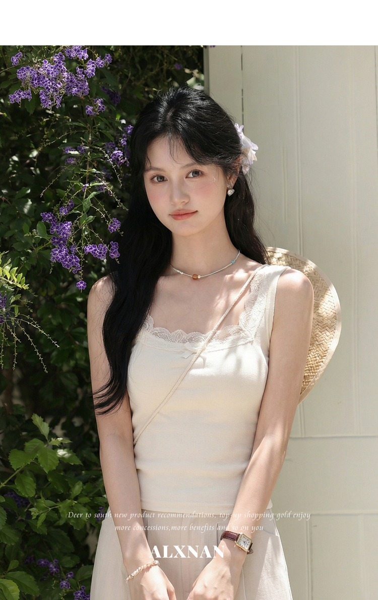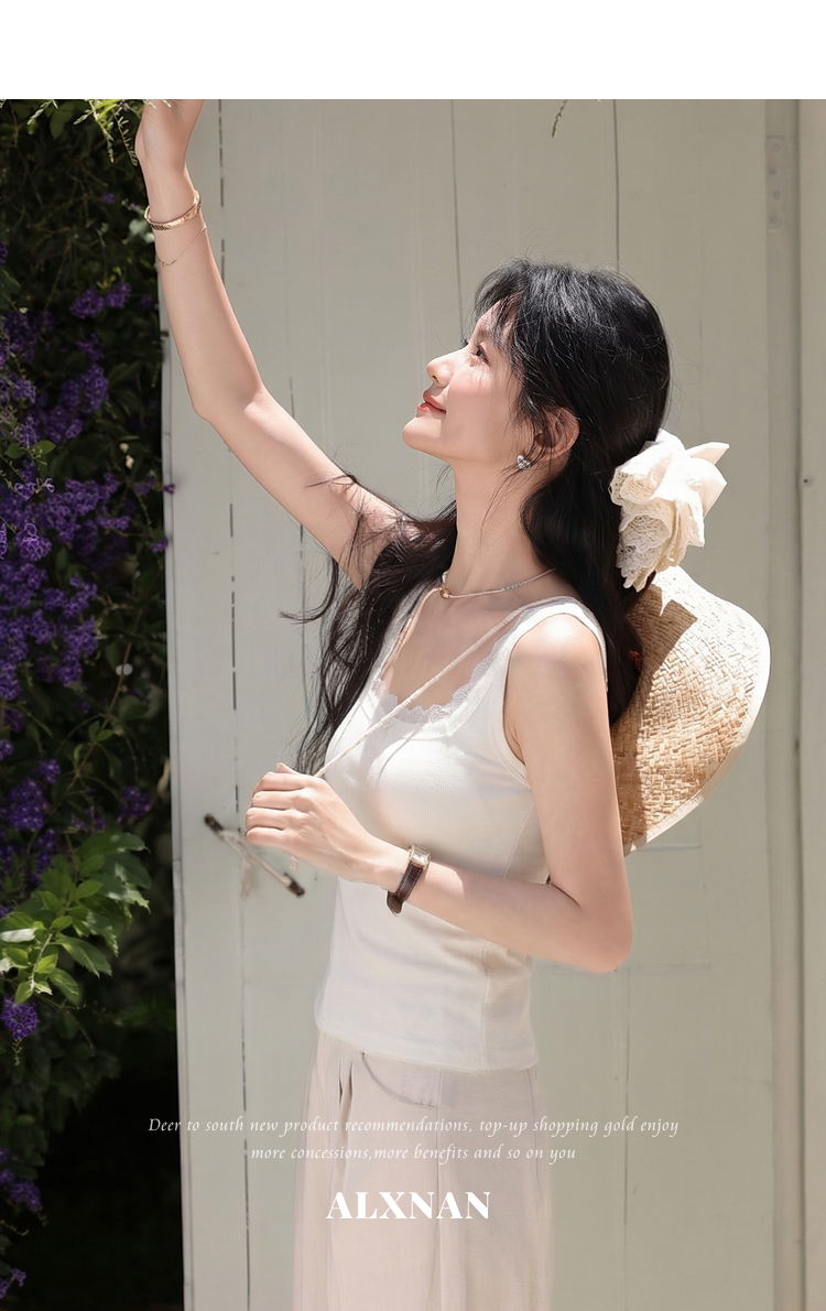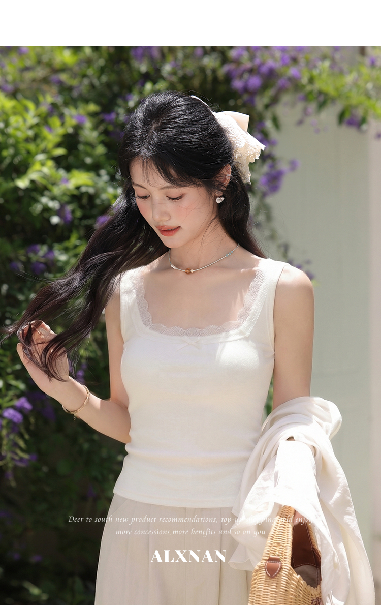 鹿向南「白茶轻柔」米白色背心吊带女夏新款法式蕾丝无袖内搭上衣