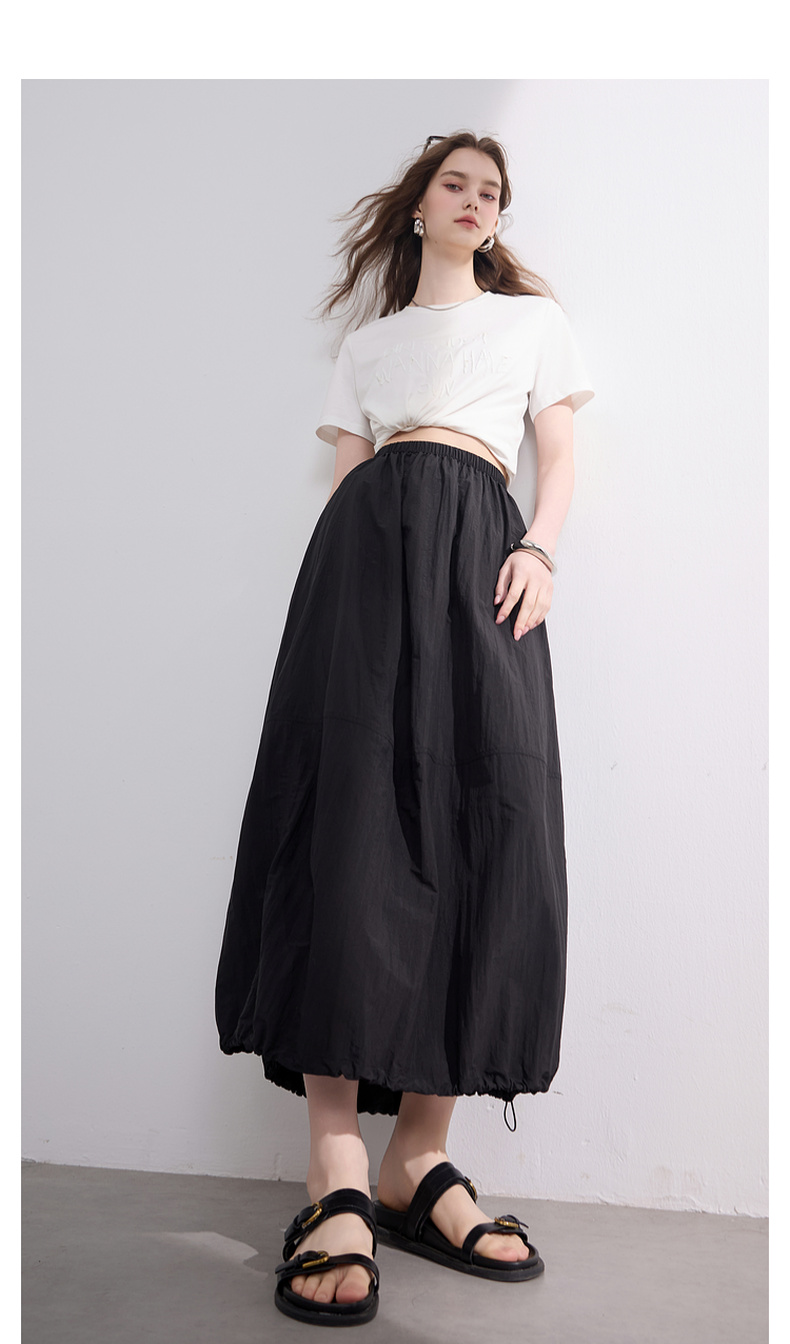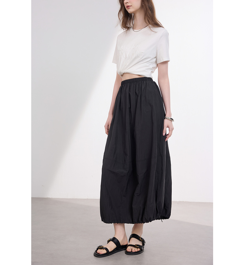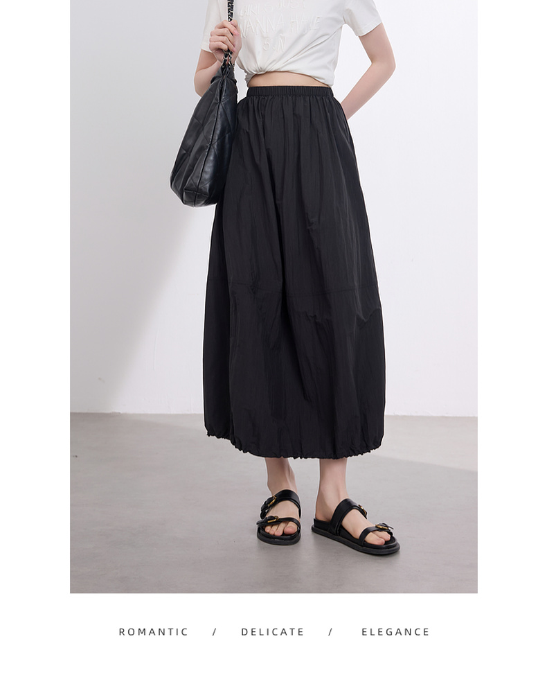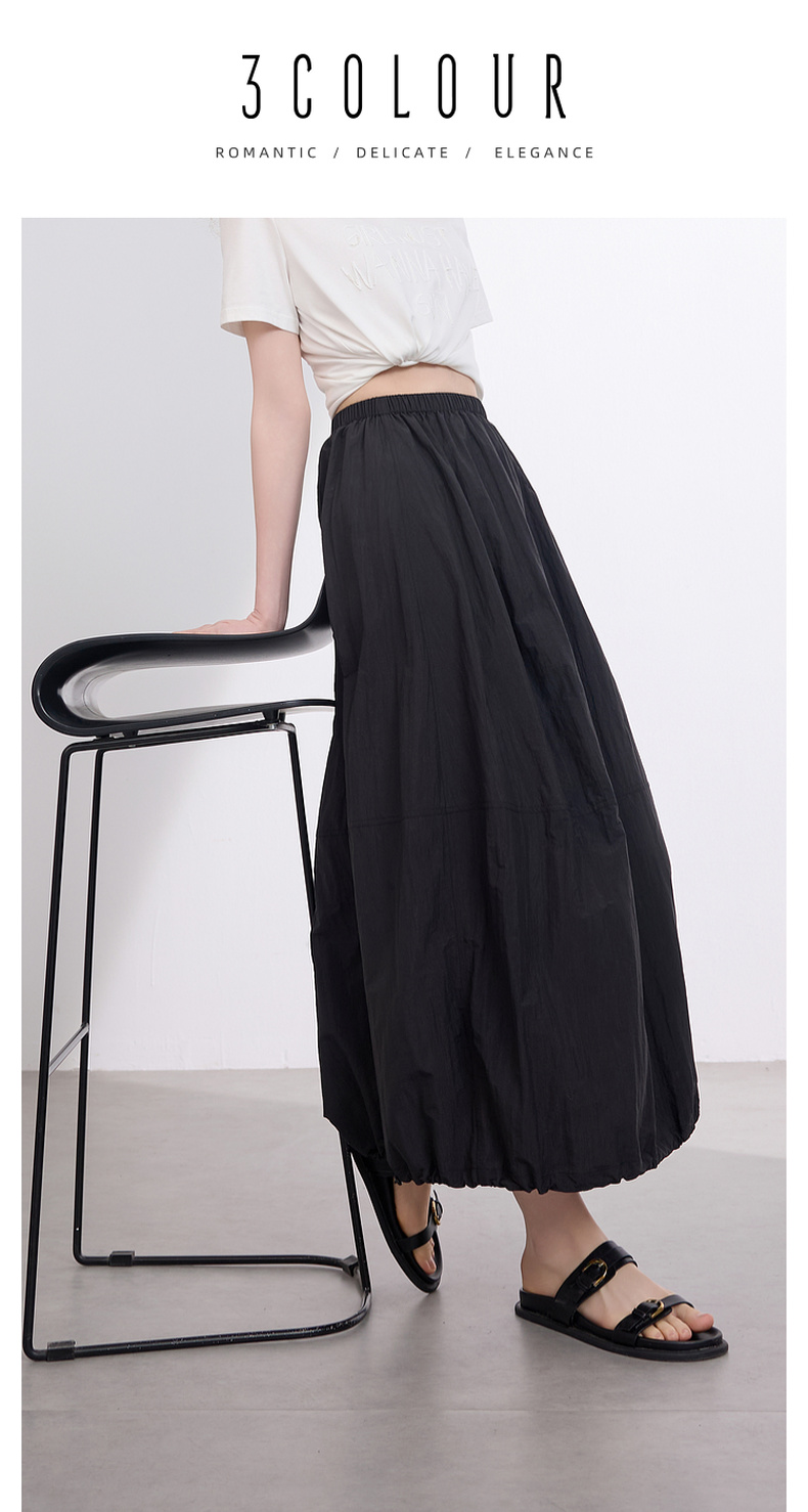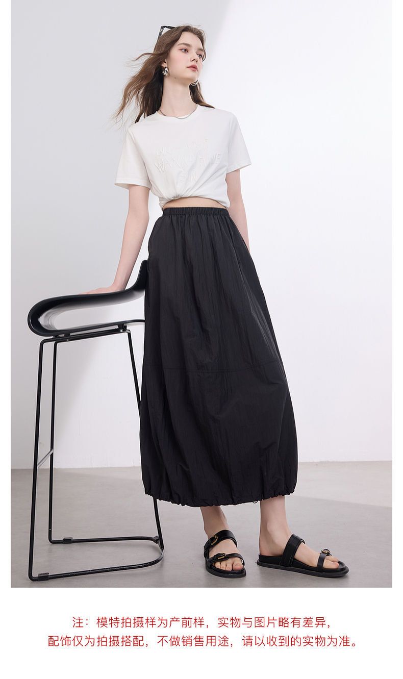 三彩2025夏季新款花苞半身裙高腰松紧A字裙长裙小黑裙休闲M