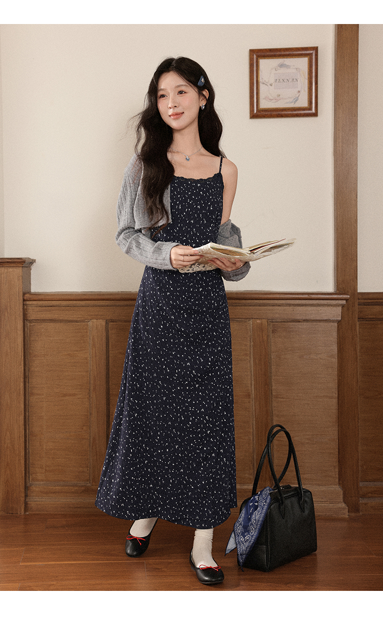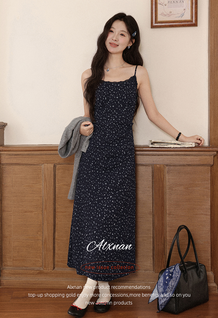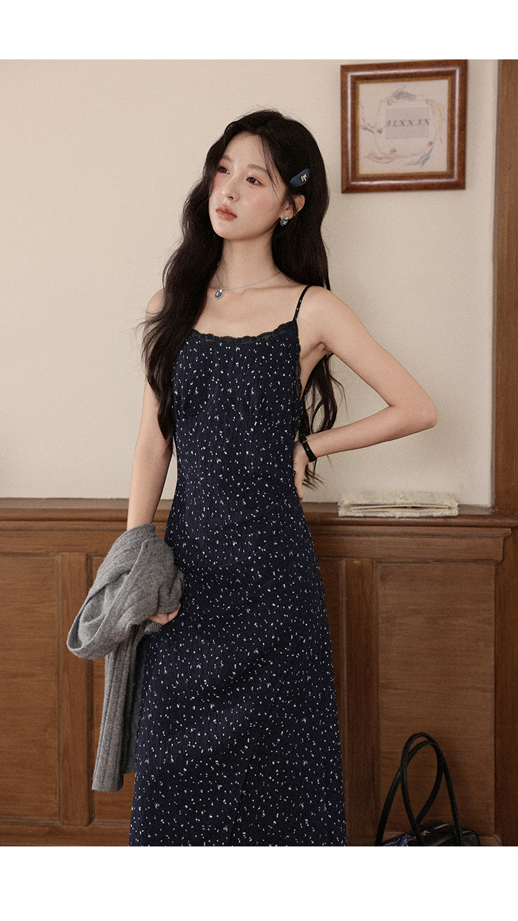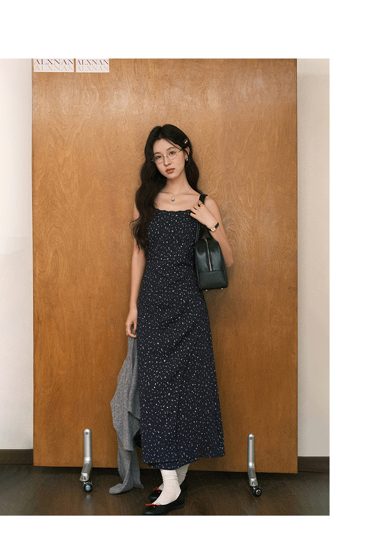 【6折秒杀】鹿向南「雾岛繁花」黑色碎花连衣裙女夏季度假收腰无袖长款吊带裙L56705