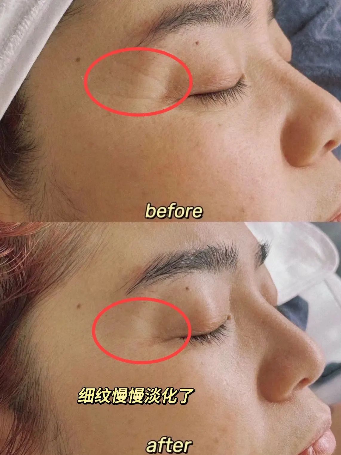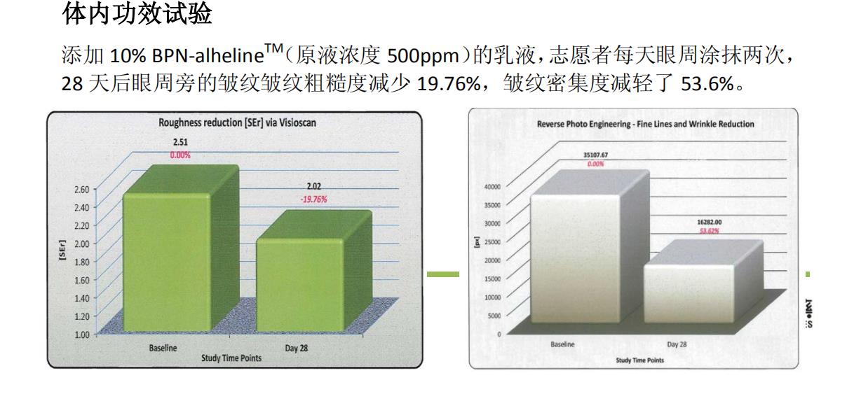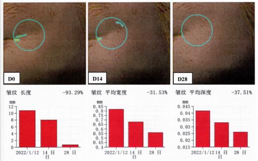 眼角皱纹凹痕在连续使用第14天、第28天分别降低49.56%和73.14%。