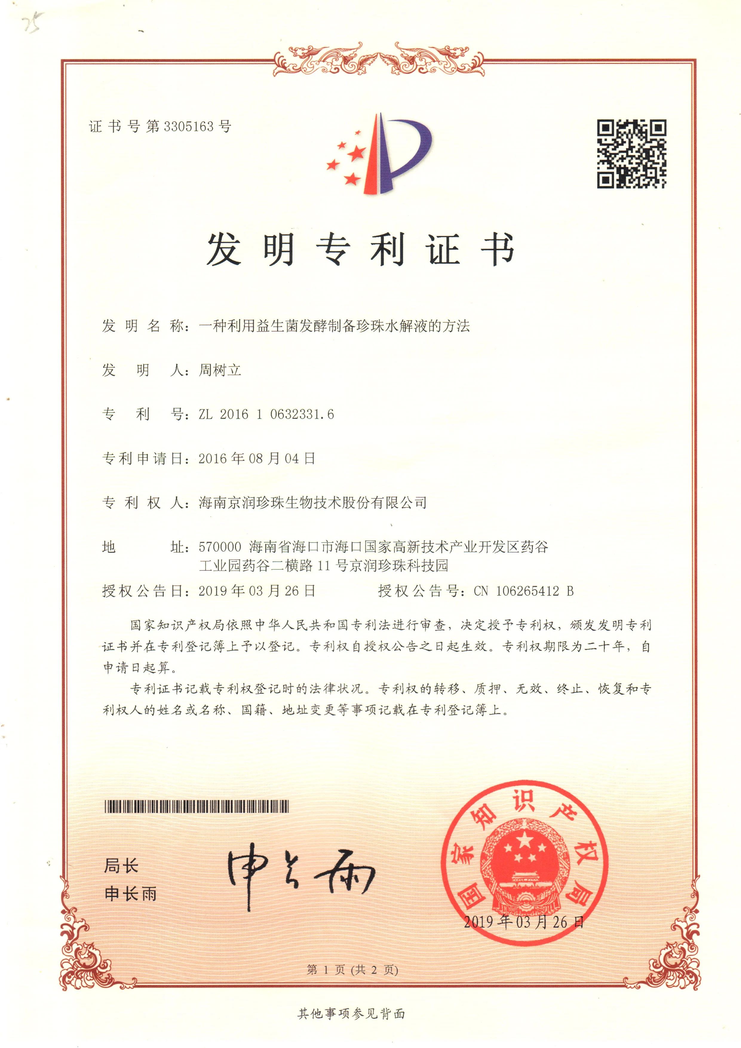 京润珍珠对水解珍珠发酵液的研究非常深入,很早有就有了相关专利。