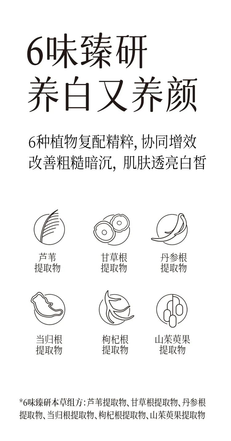 芦荟、甘草根、丹参根、当归根、枸杞根、山茱萸果。抗糖减黄,不止美白更渗入深层养护皮肤。