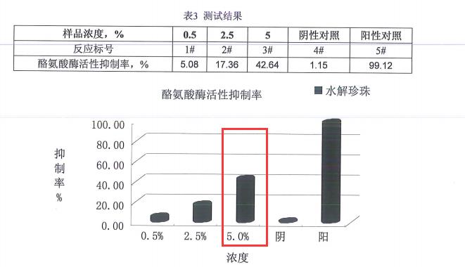 当水解珍珠浓度达到5%时,对络氨酸酶活性抑制率达到42.64%,通过上图实验证明,水解珍珠针对体内自由基有很好地清除作用,其具有明显的抗氧化功效。