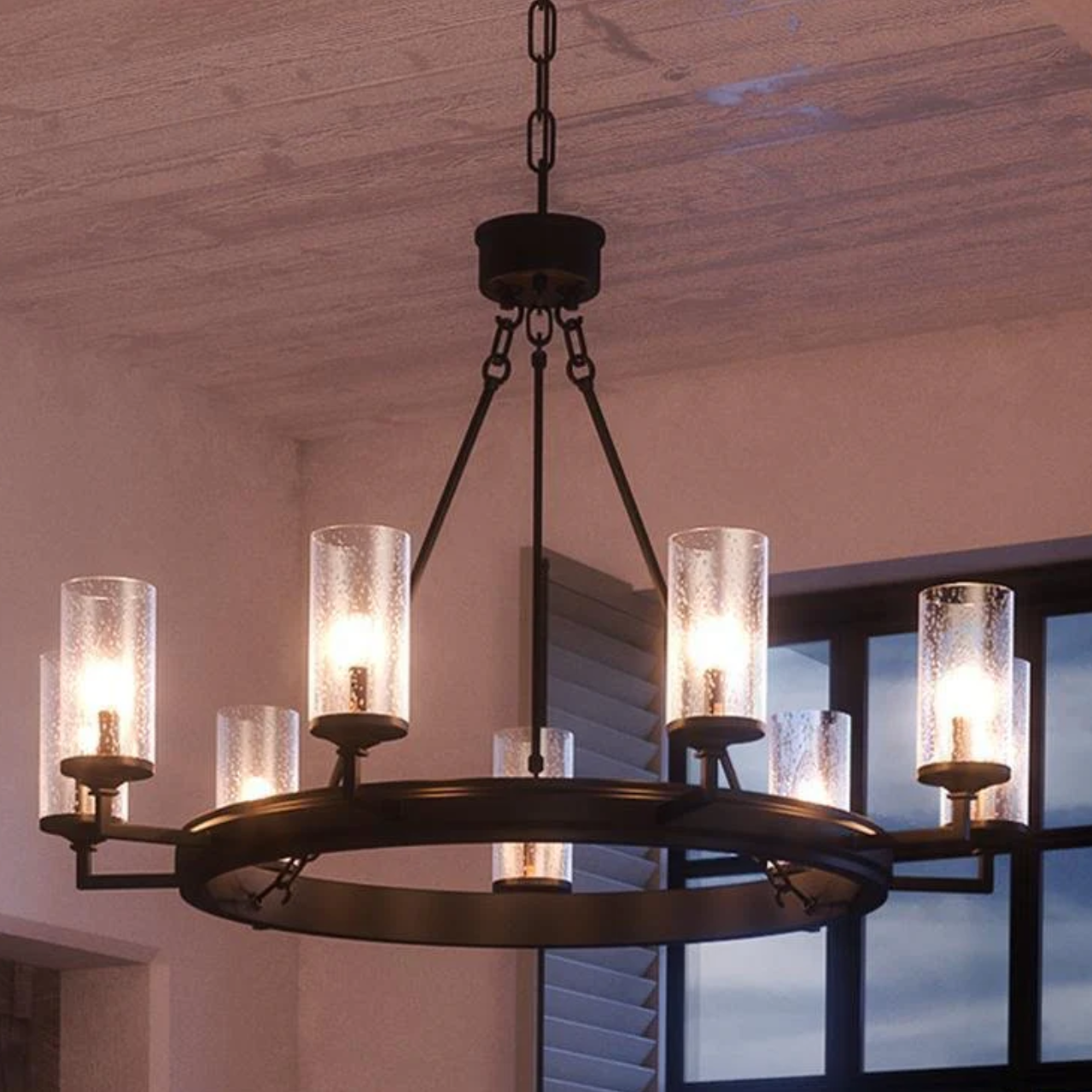 哑光黑色金属环支撑着10个透明玻璃圆柱灯罩,散发出明亮均匀的光线,带来清新现代感——非常适合餐厅、厨房和开放式起居空间。