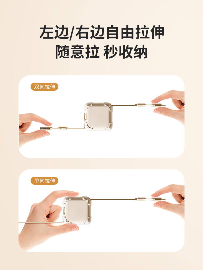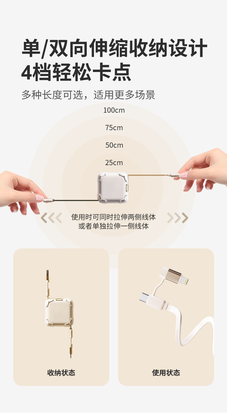 🏆品牌独家承诺:一年内质量问题免费换新❗️ ✅国内首创单手任意拉模式,单边/双边均可任意拉伸,彻底告别线团缠绕❗️1米抽拉:25-100cm四档自由伸缩,超薄小巧设计,收纳仅掌心大小❗️ ✅四接口通吃:Lightning/Type-c/USB,苹果全系列(8-17系列)以及所有安卓品牌机型、平板、笔记本电脑以及周边设备统统适用❗️ ✅Type-C接口支持240W超级快充,最快30分钟充满,同时兼容华为/小米/OPPO/VIVO等品牌120W/100W/66W/40W/22.5W超级快充/闪充,充电/传输数据两不误❗️ ✅10000+次弯折测试,品质保障,加粗铜芯,抗摔耐磨❗️