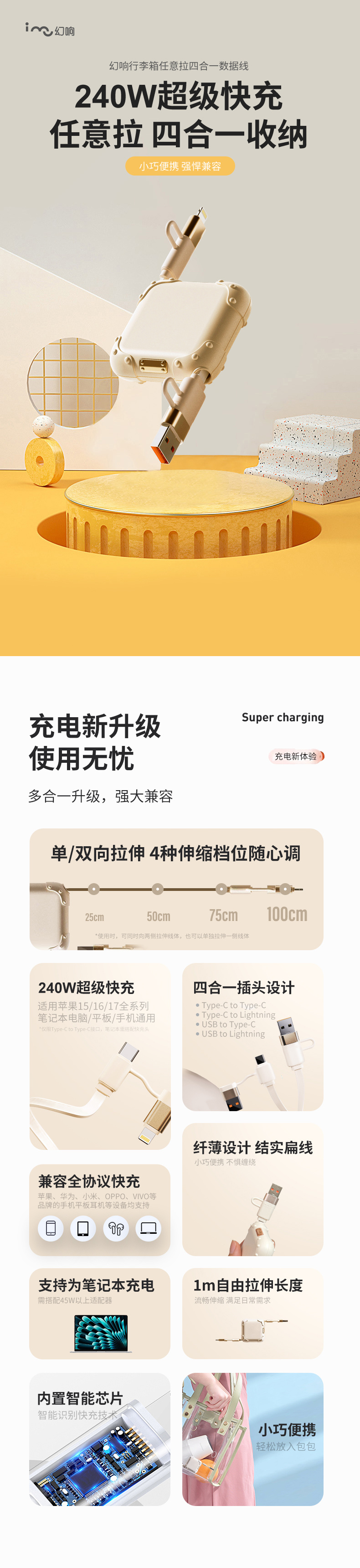 谁用谁夸❗️ 国内首创单手任意拉模式,怎么拉都不会缠绕,永远不用对着线团发呆,拿起来就能用 不管是给手机补电、给笔记本续命,还是给电脑传数据,这款线的四合一接口通杀💥 不用提前规划带哪根线、担心接口不对,大家都懂~我这种天天丢三落四的人都爱了 ⚠️⚠️⚠️给大家重点介绍咱们的幻响行李箱四合一数据线,搭载240W超级快充技术,重新定义超快充电效率❗️❗️❗️ 它能完美适配各品牌机型,无论是苹果、华为,还是vivo、OPPO、小米等主流手机品牌均可快充⚡️ 各品牌全协议快充轻松拿捏👍 瞬间开启快充,充电速度杠杠滴❗️❗️❗️