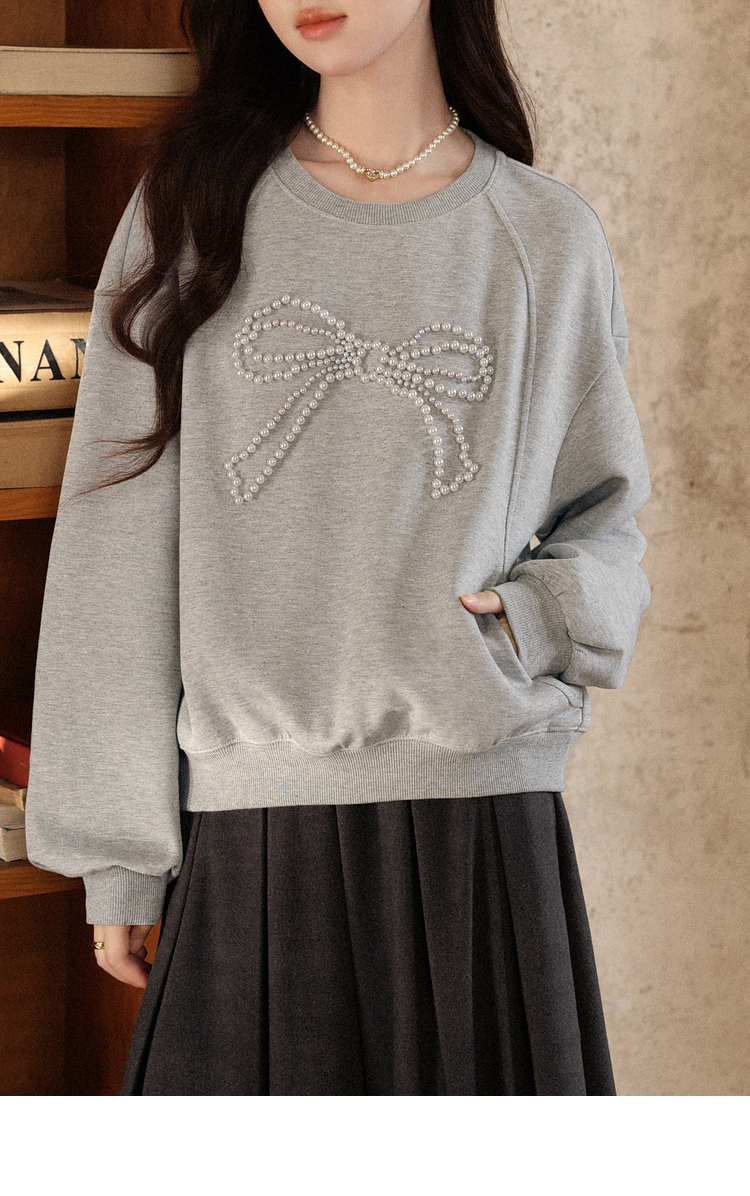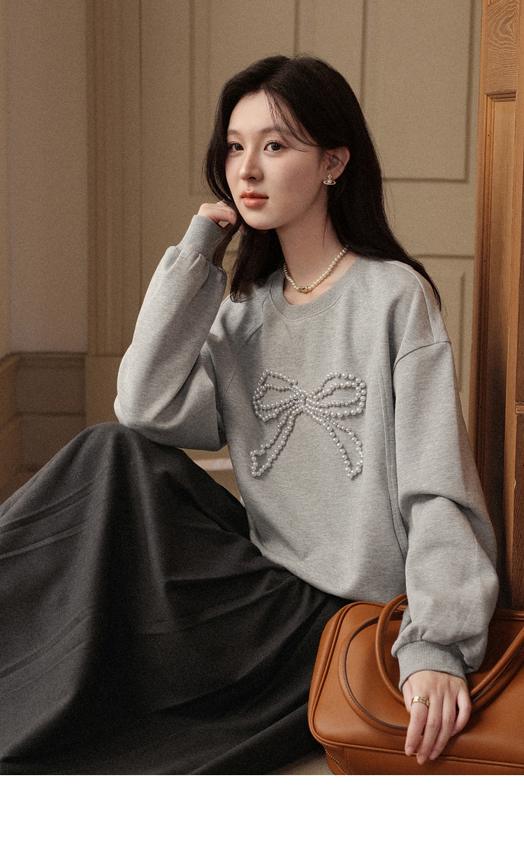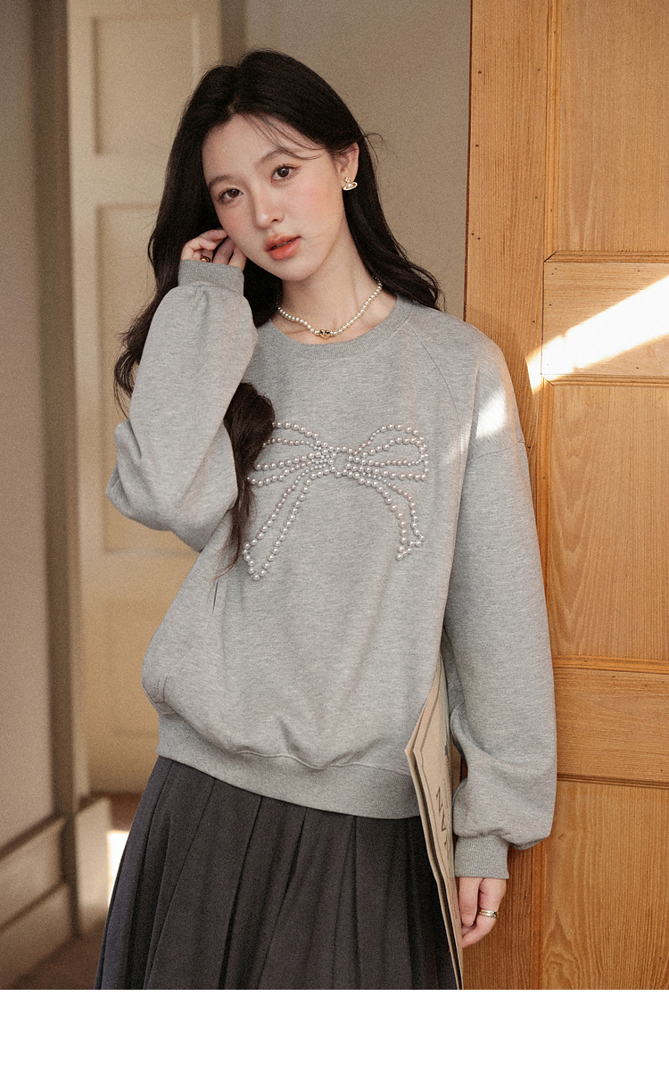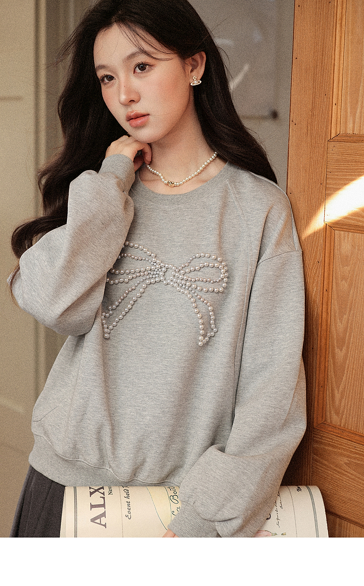 【6折秒杀】鹿向南「盐渍樱花糖」灰色蝴蝶结圆领长袖卫衣宽松显瘦上衣女早秋